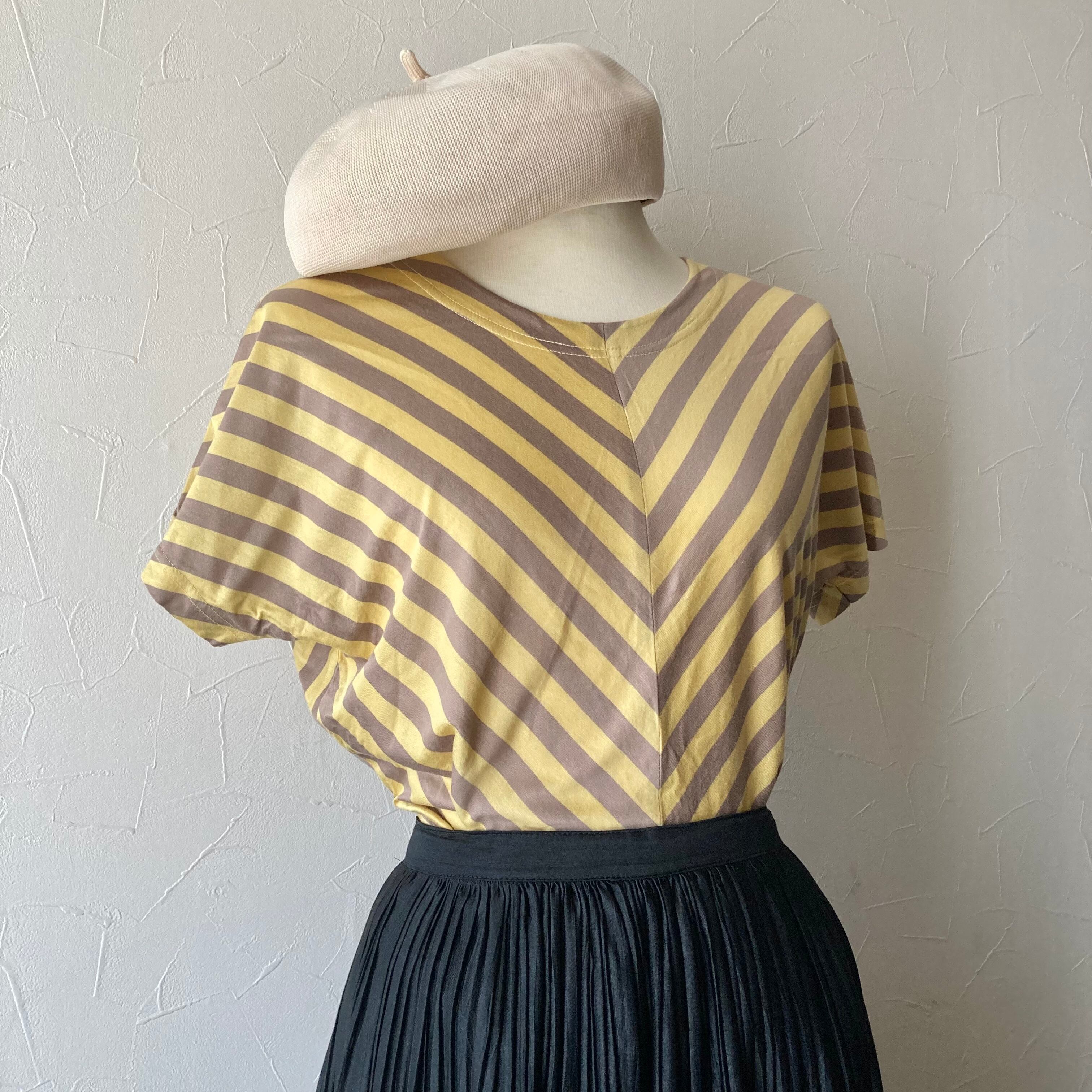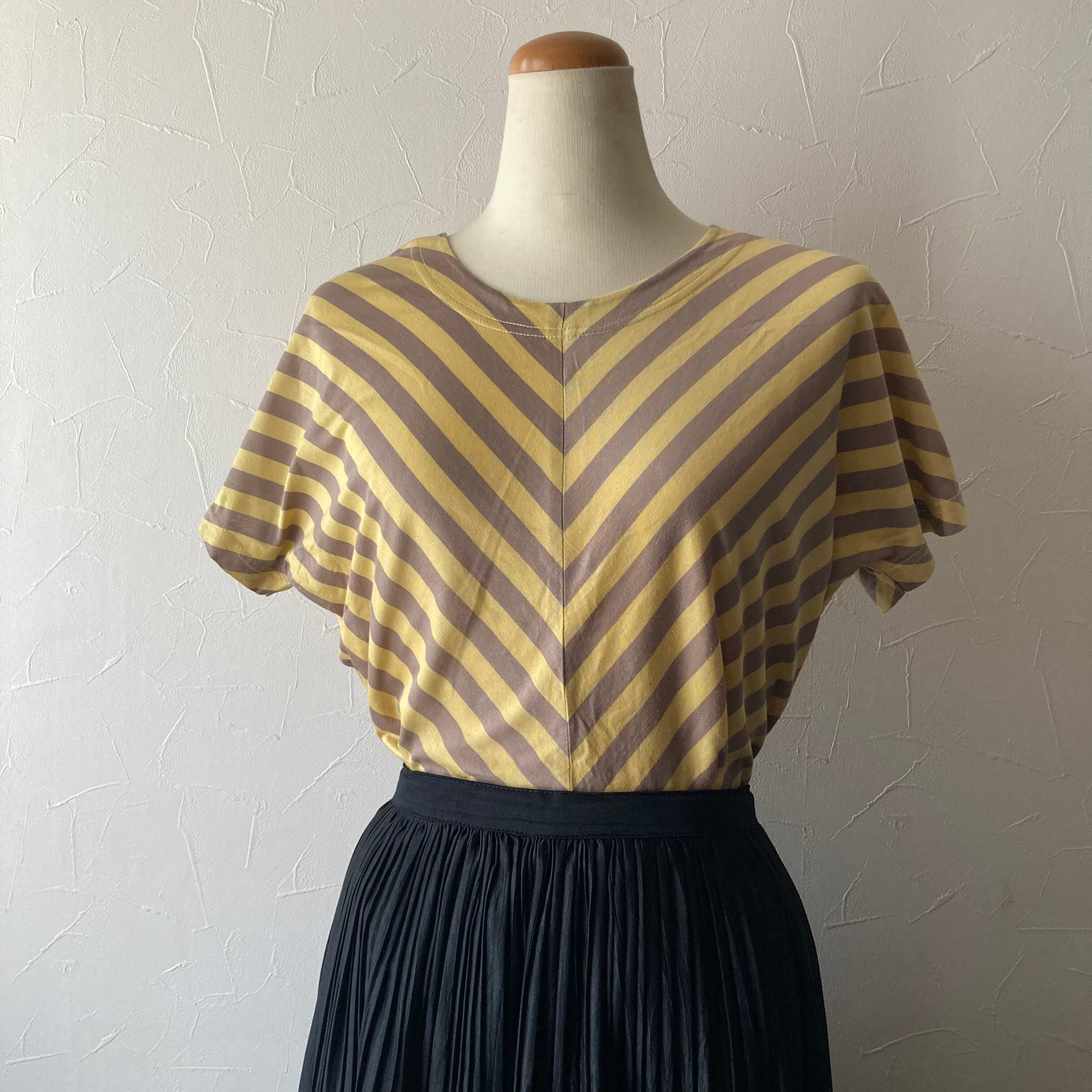 淡い黄色にベージュのラインが古着らしいデザインのレトロなカットソーです。