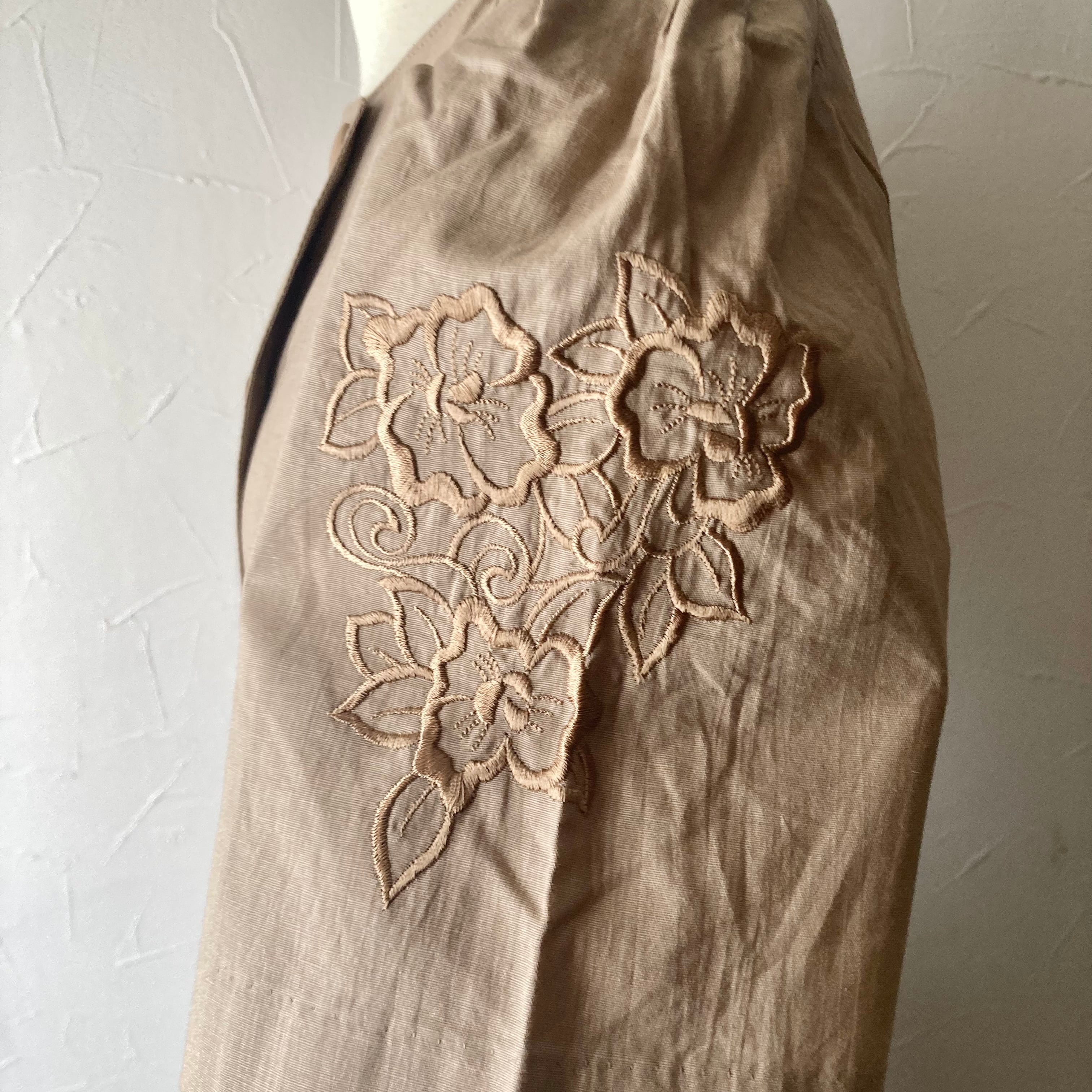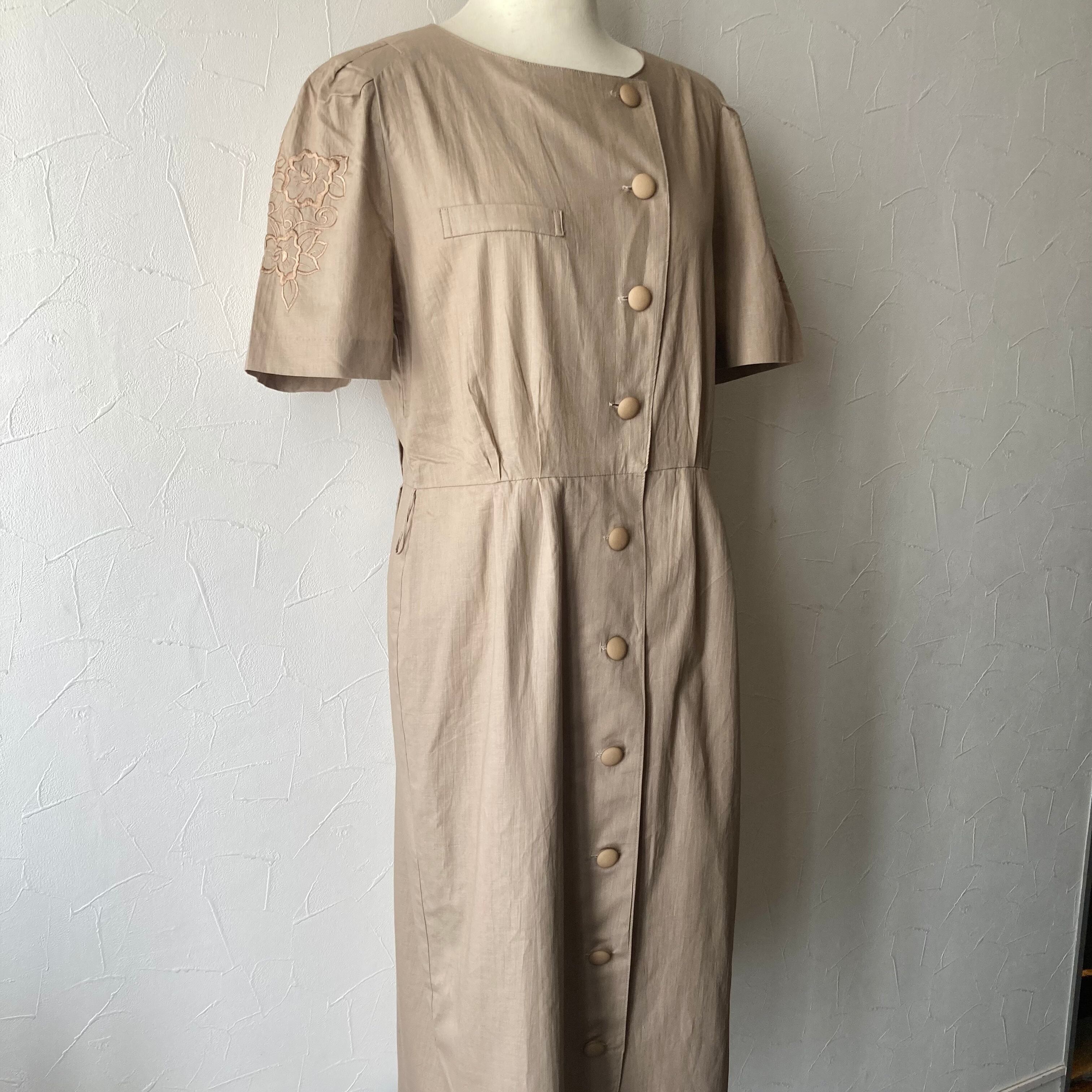 刺繍ベージュ麻綿素材ワンピース 昭和レトロ 古着 used
