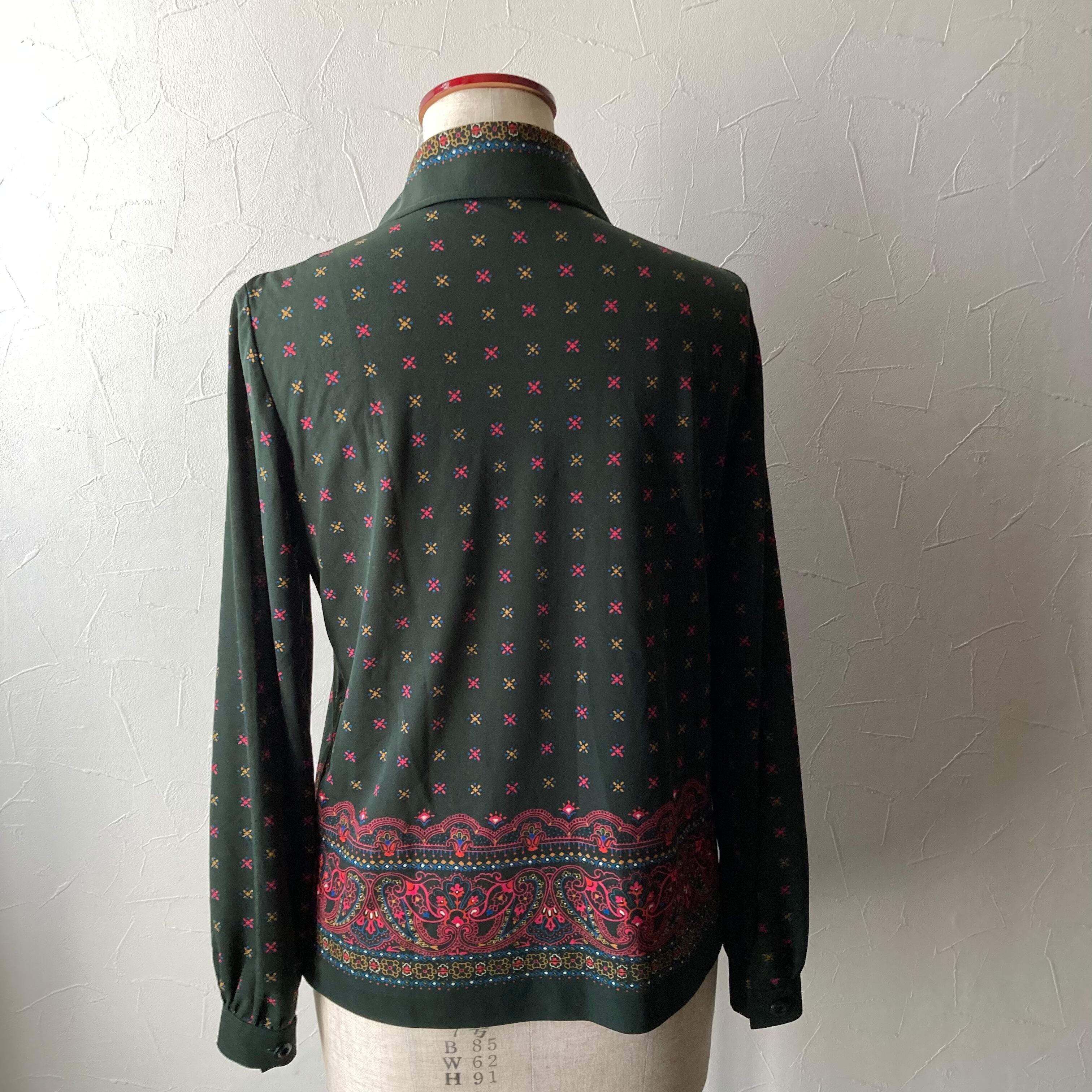 ダークグリーン柄ブラウス 昭和レトロ 古着 used vintage