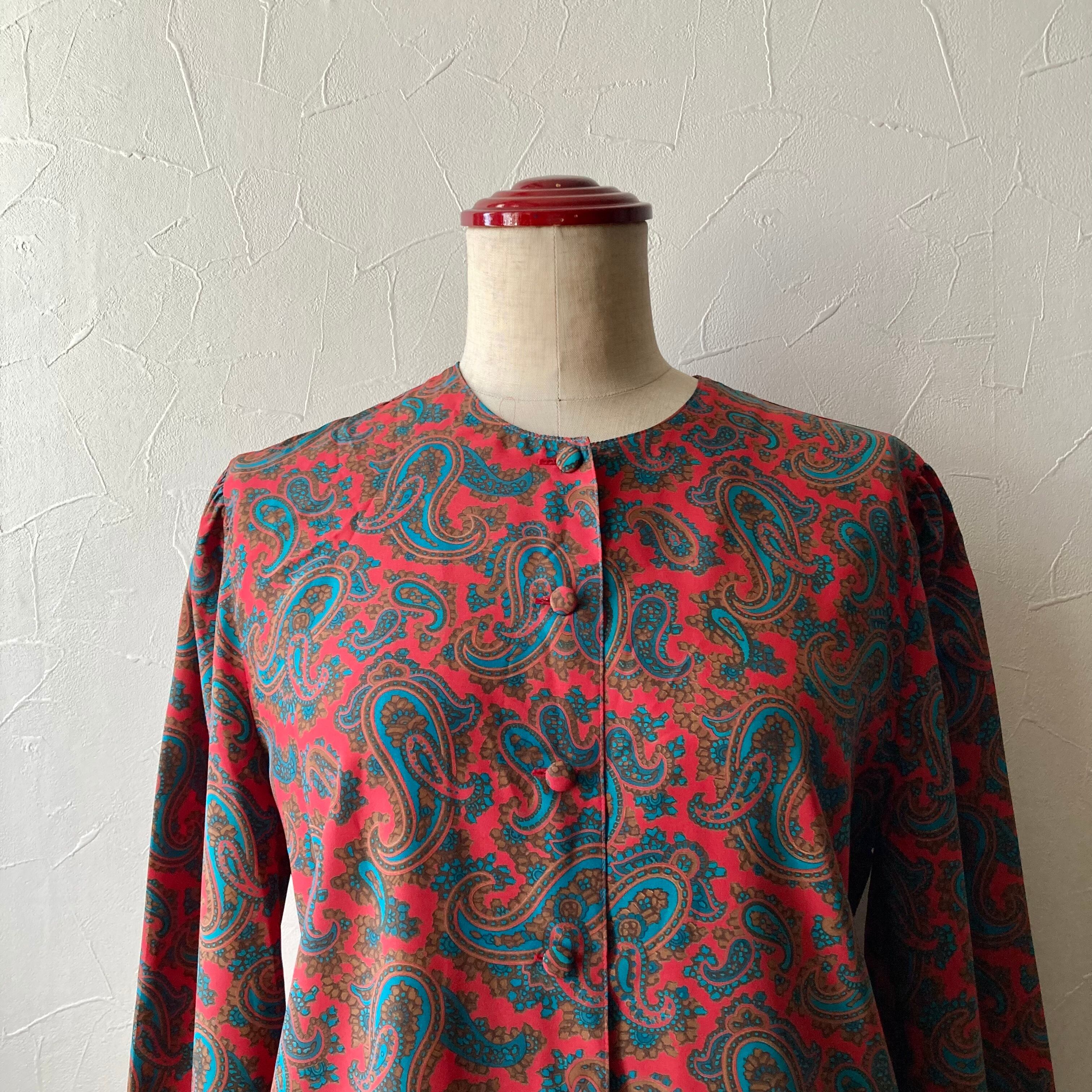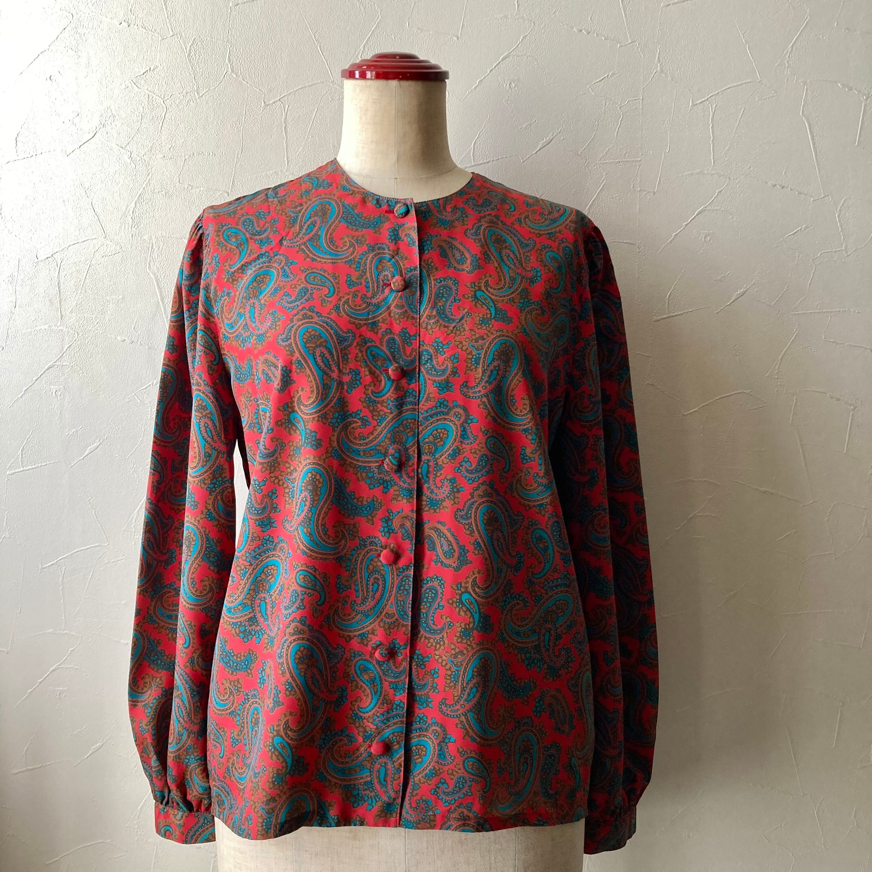 赤色ペイズリー柄ノーカラーブラウス 昭和レトロ 古着 used