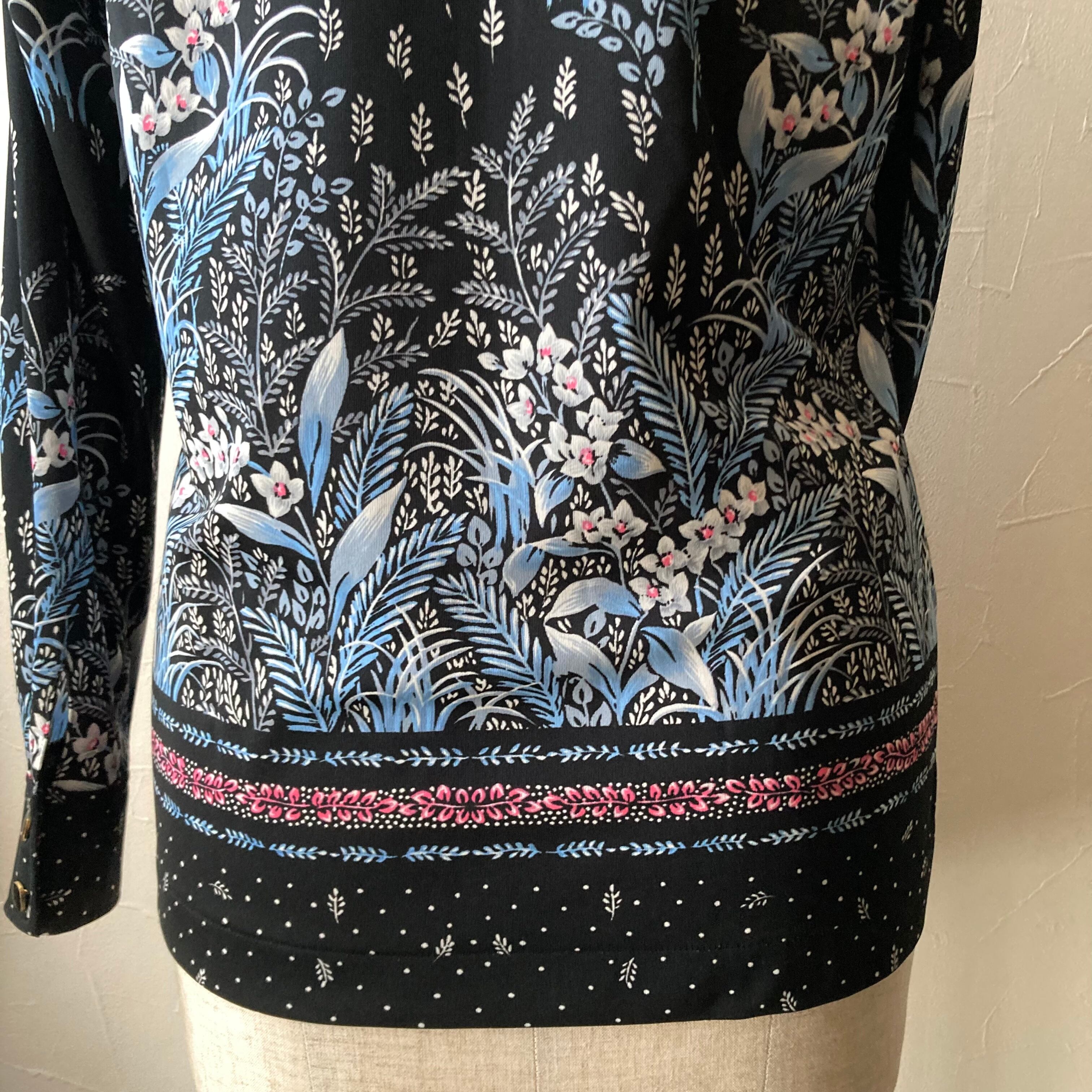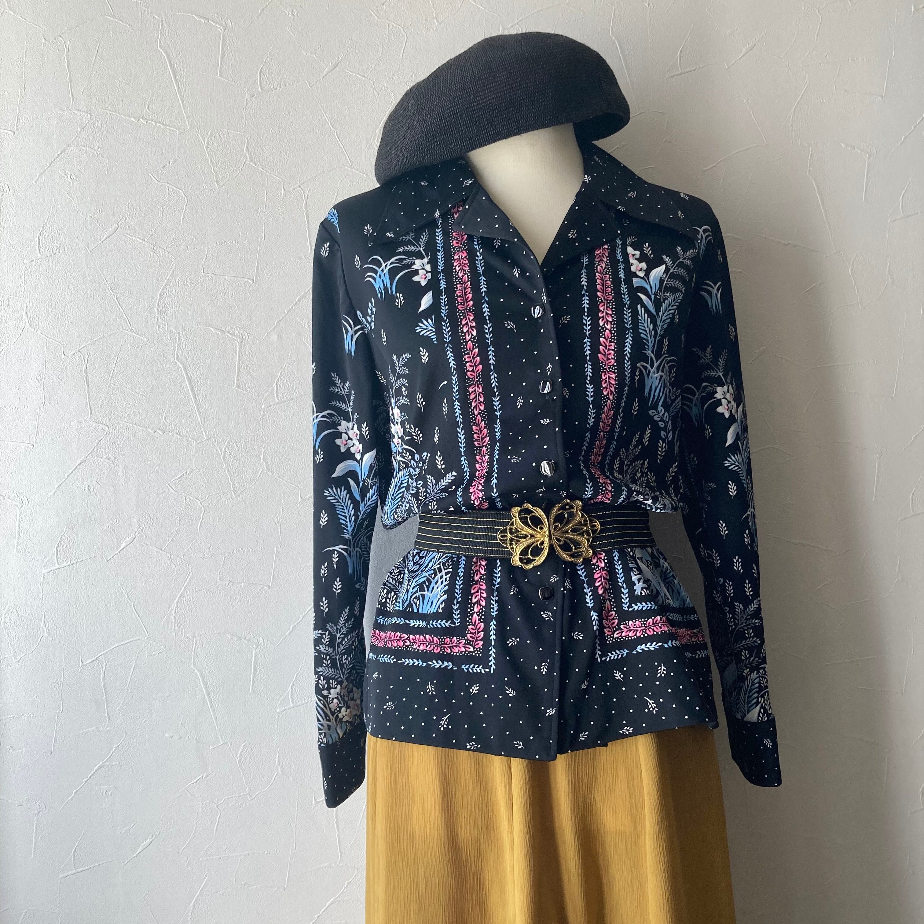 大きめのオープンカラーの襟と黒地に白い花が美しい70sなブラウスです。