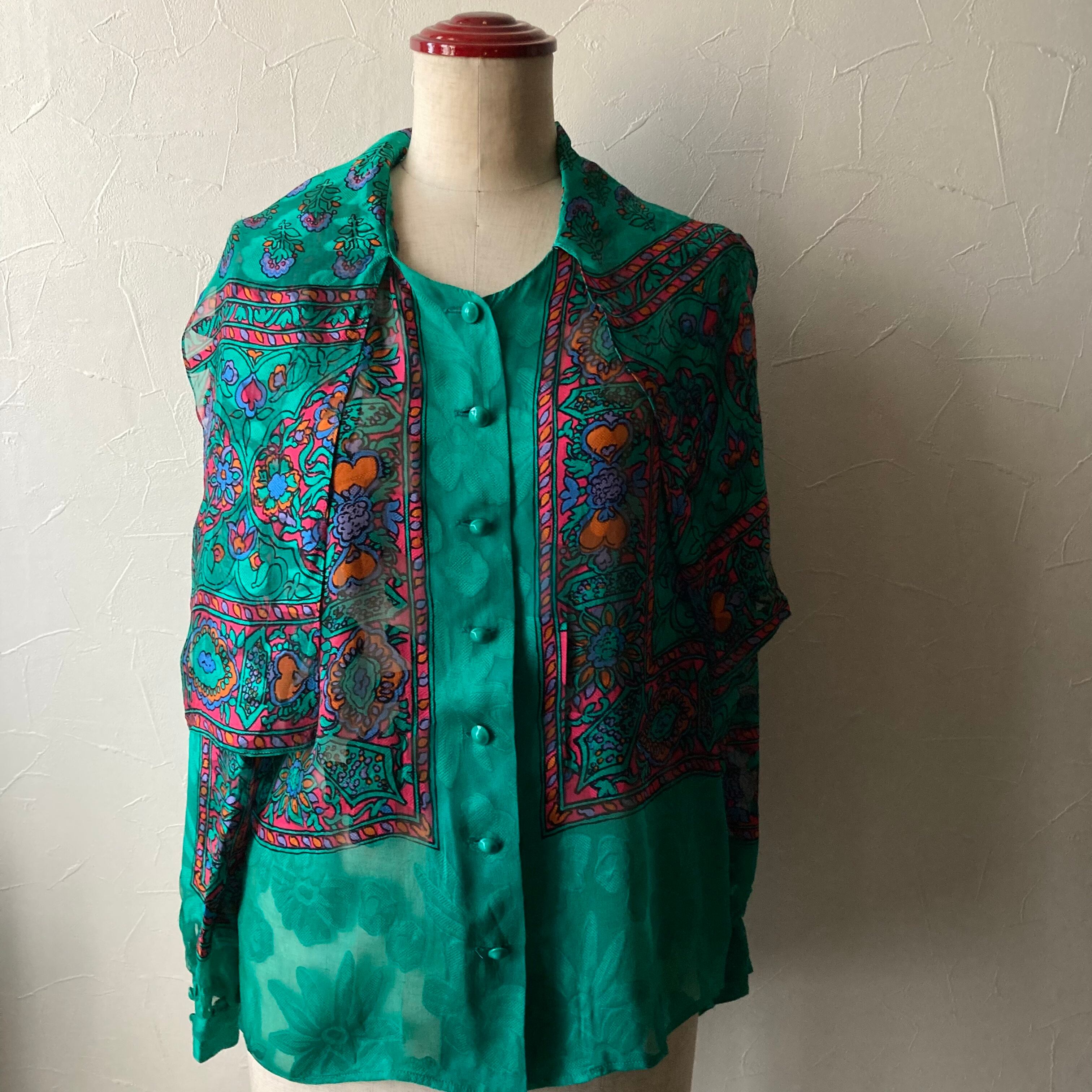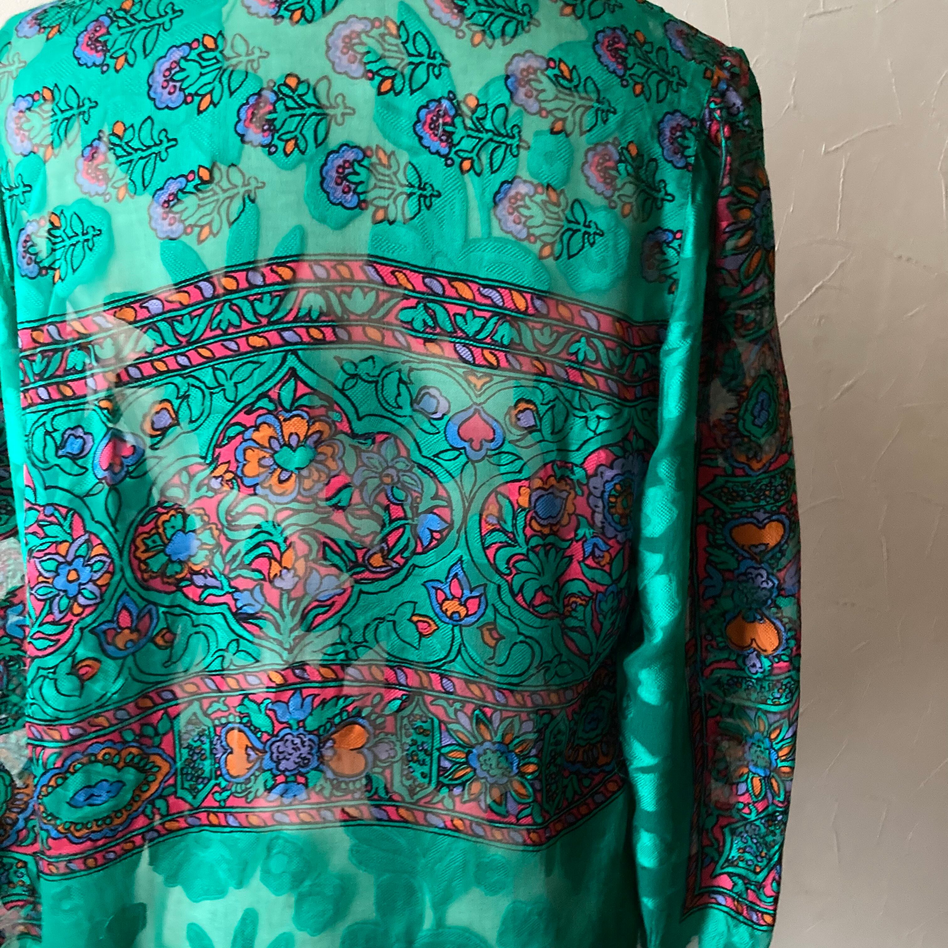 スカーフのような繊細な絹100%のシアーブラウス。明るいグリーンに鮮やかな柄がとても素敵です。