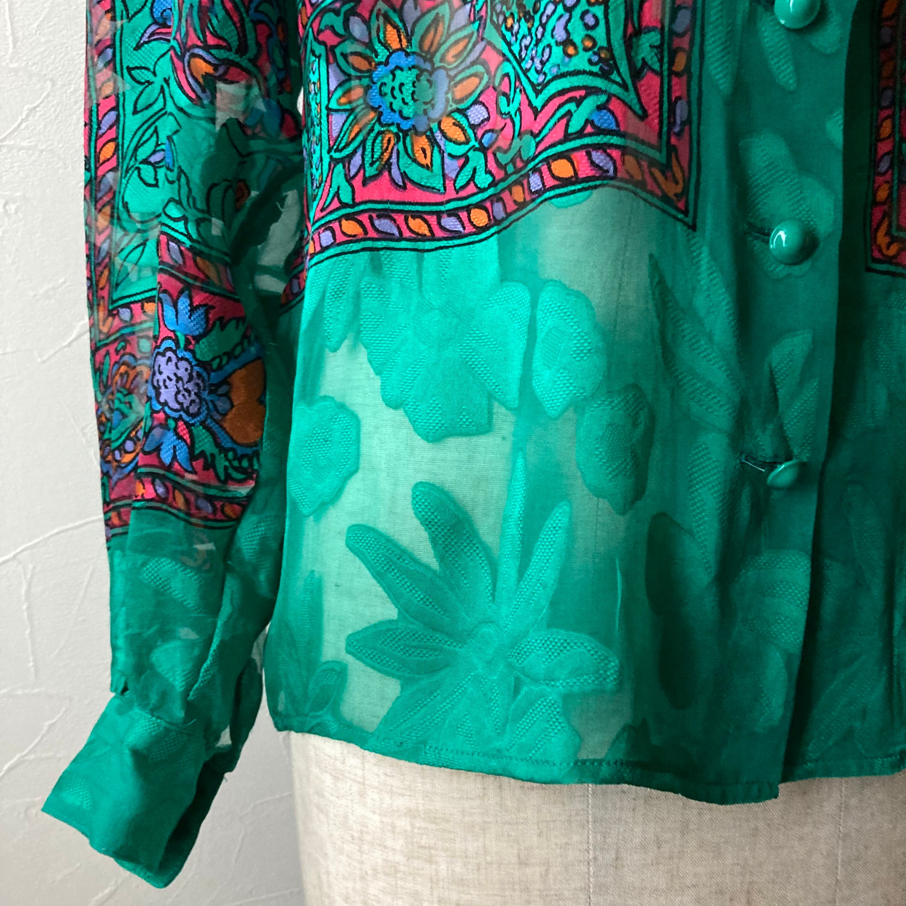 グリーン柄シアーブラウス 昭和レトロ 古着 used vintage