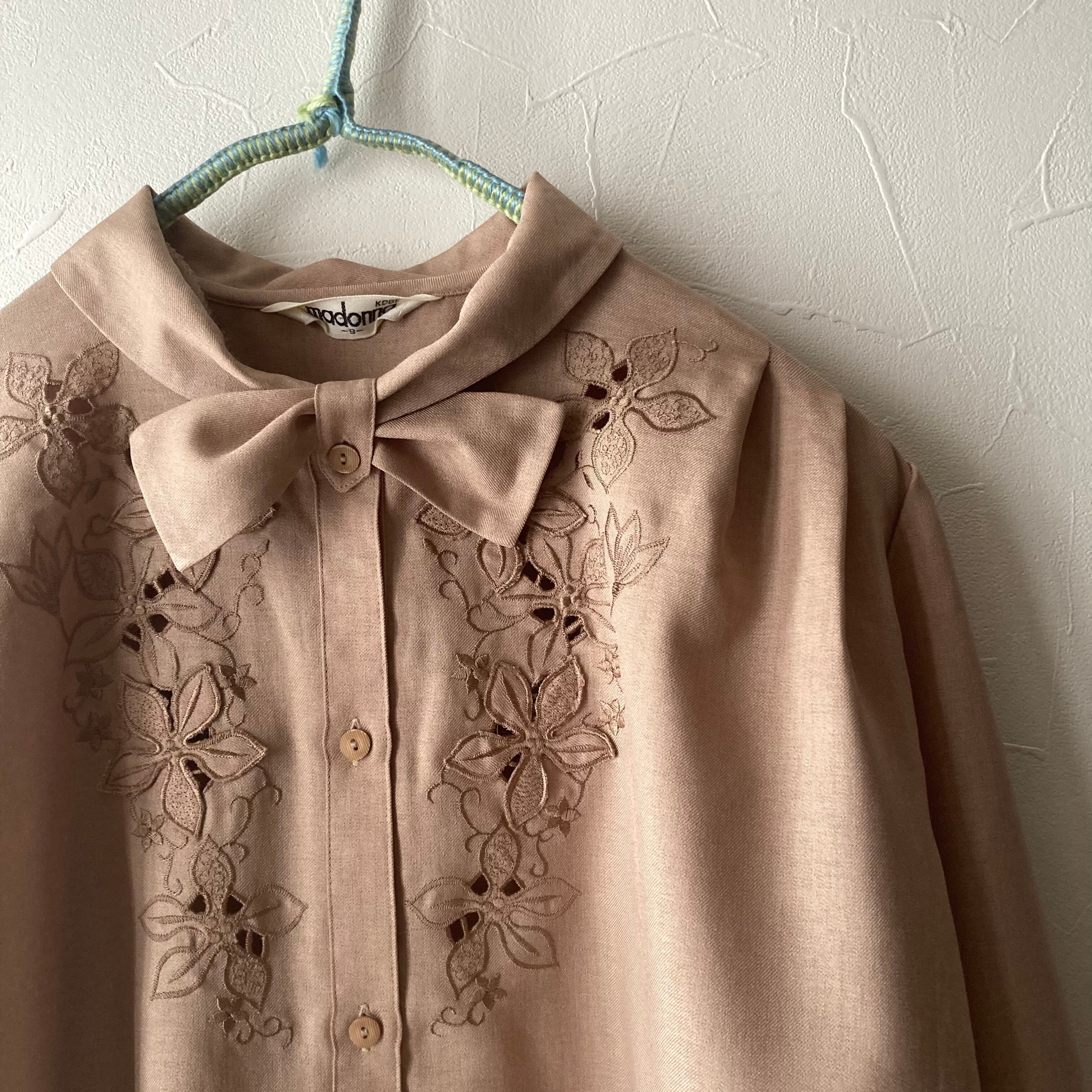 ベージュ花刺繍リボンブラウス 昭和レトロ 古着 used