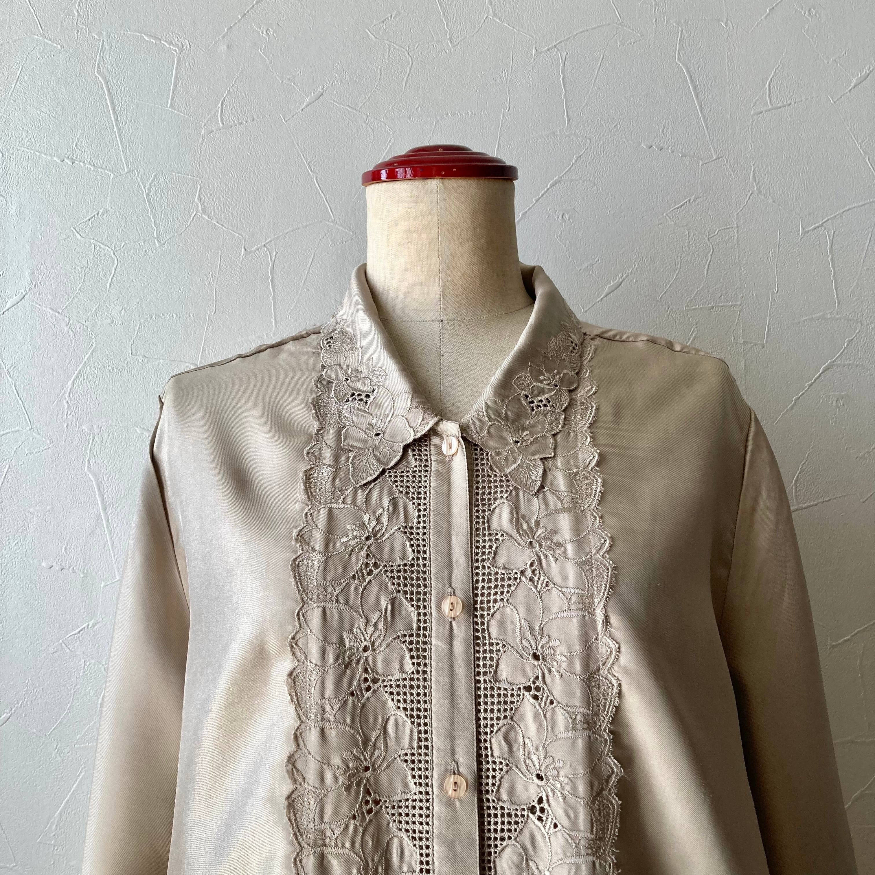 上品な色とレトロな花刺繍、メッシュで透け感のあるカットワークデザインがおしゃれなブラウスです◯