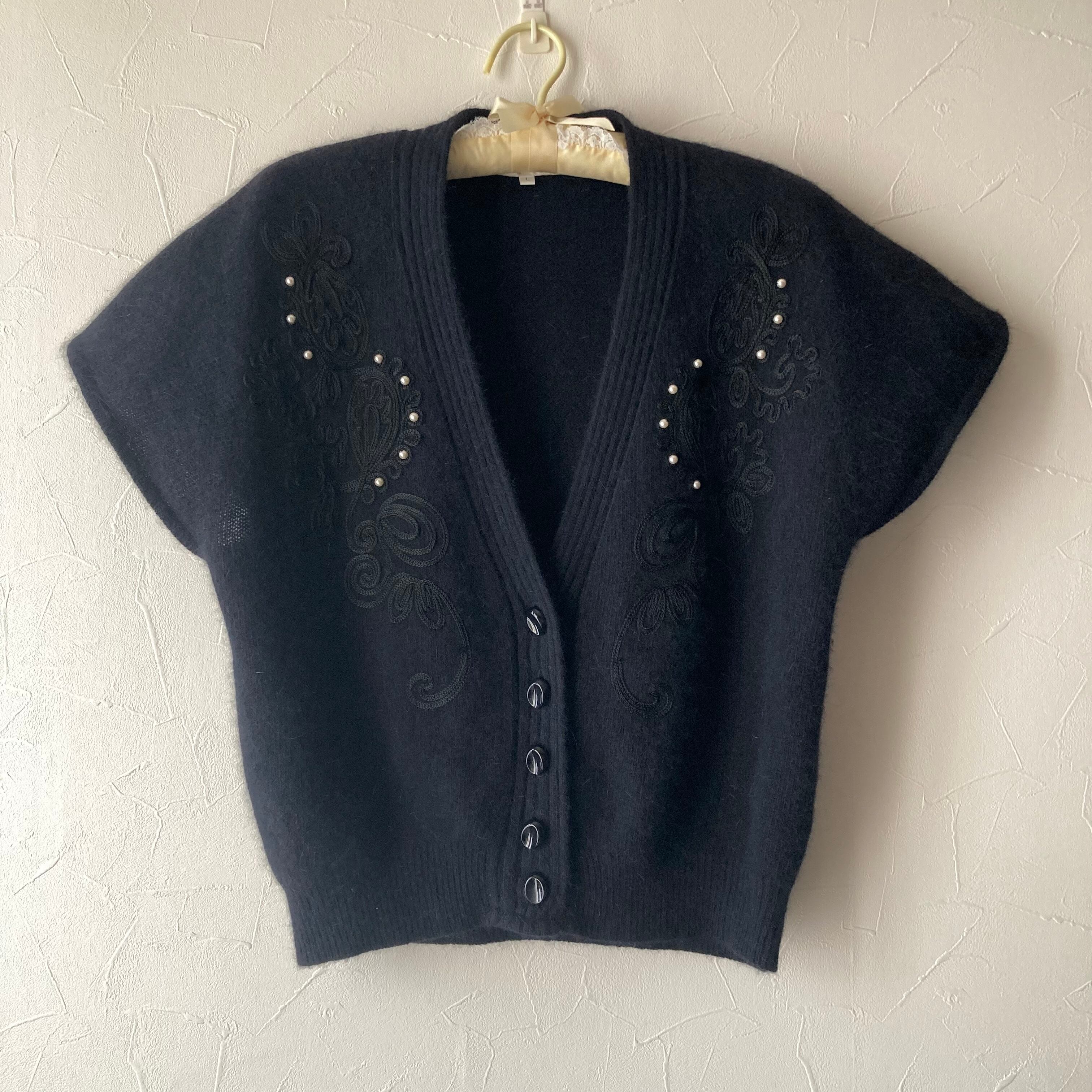 レトロな雰囲気のくるくる刺繍にパール装飾がおしゃれな黒色ベスト◯