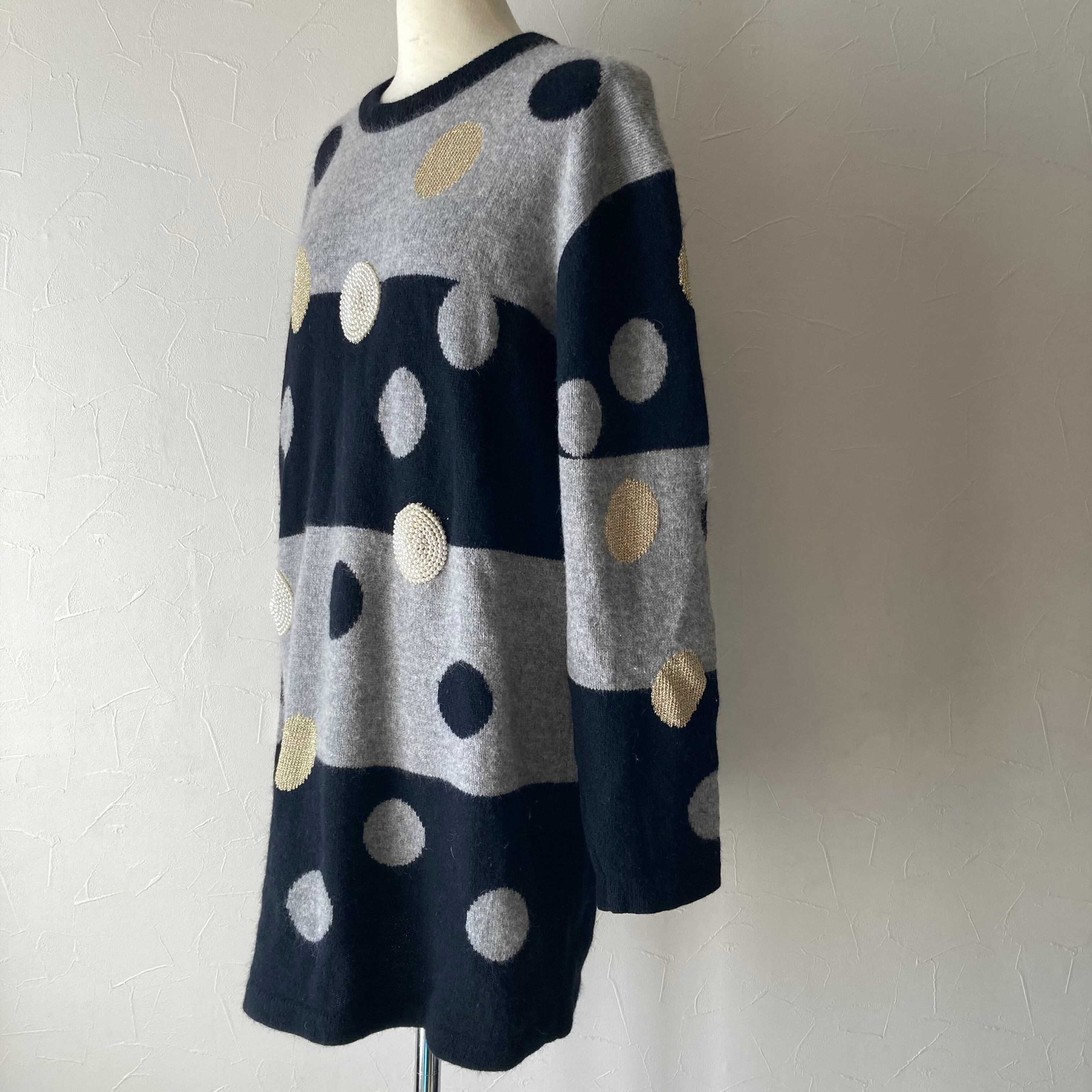 モノトーンな色合いに黒、グレー、白いビーズ刺繍、ゴールドラメのドットが可愛いロングニットです◯