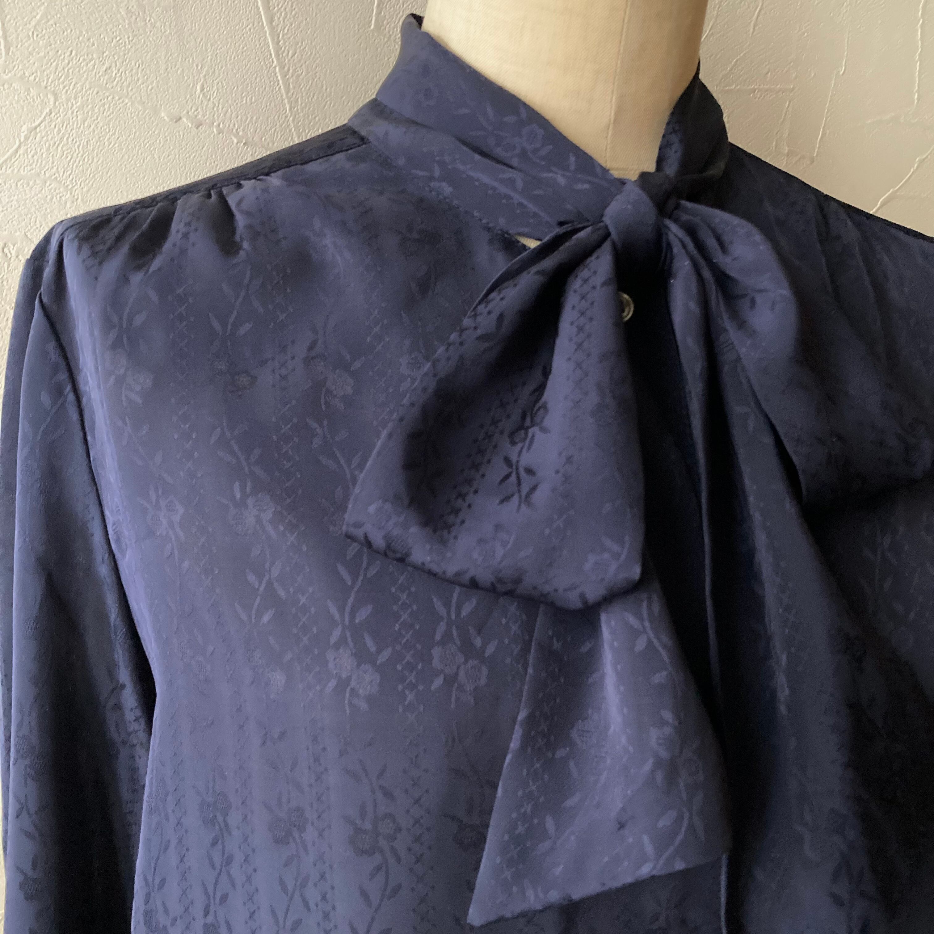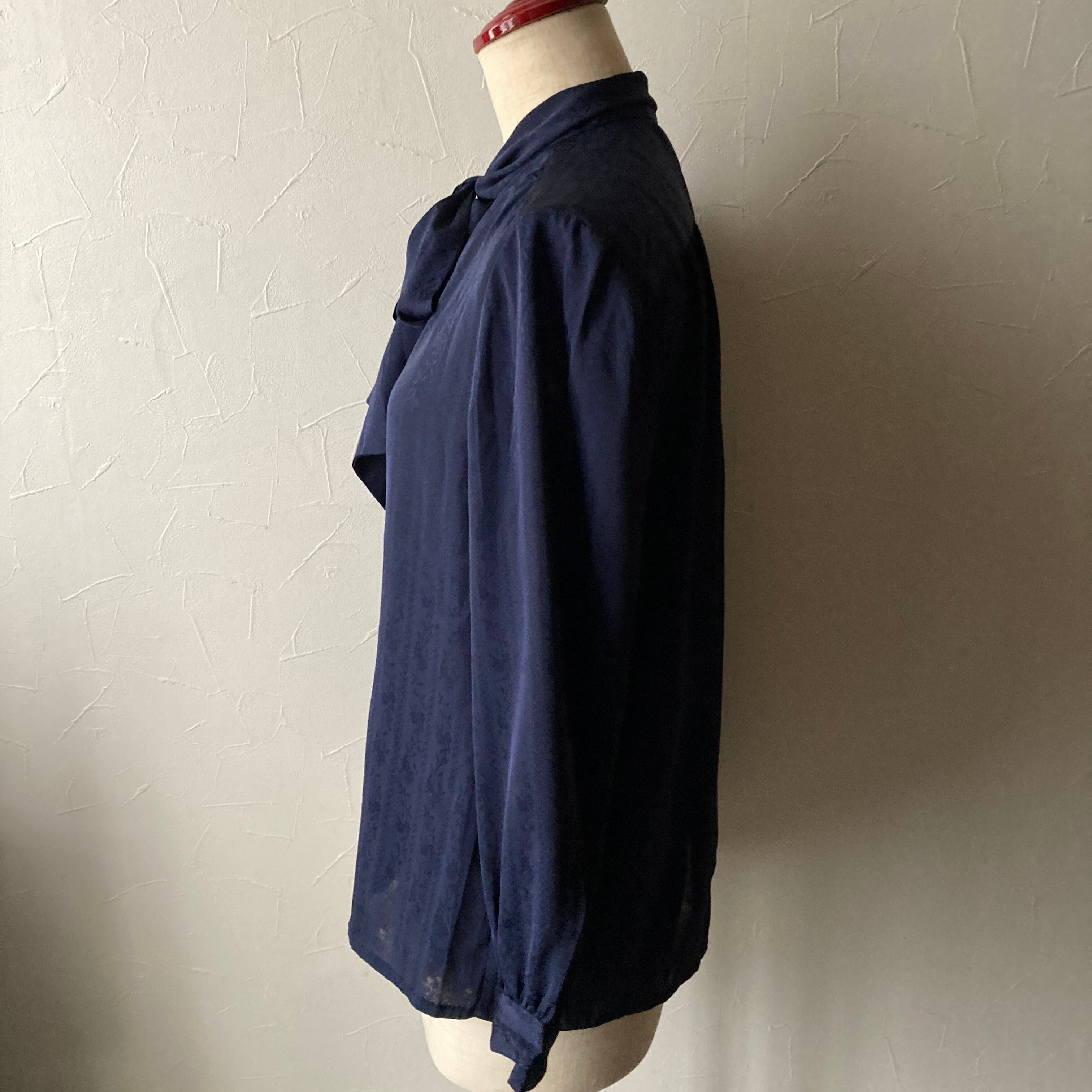 ネイビー花模様リボンブラウス 昭和レトロ 古着 used vintage
