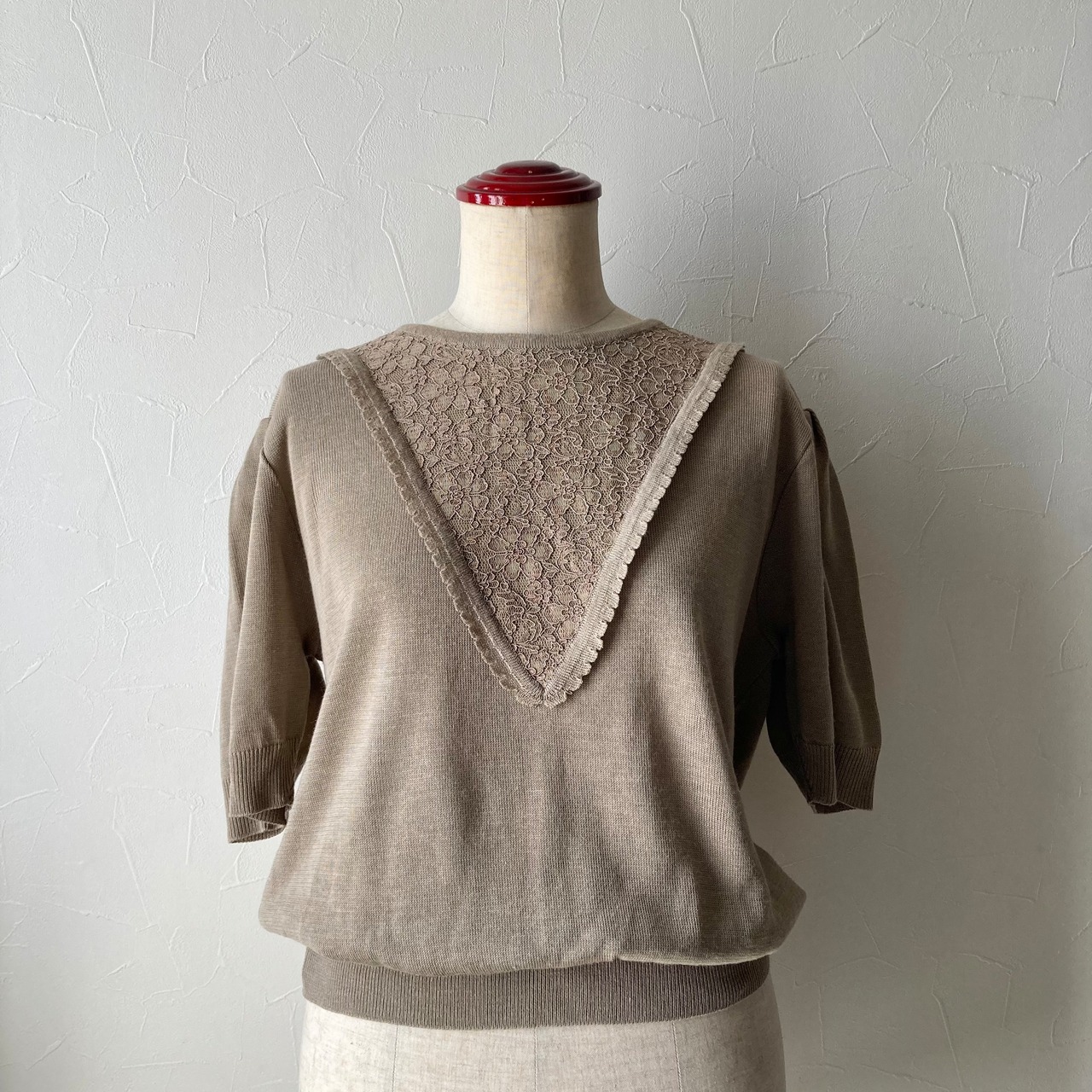 胸の大きなV型レースデザインがステキな半袖ニットトップス◯