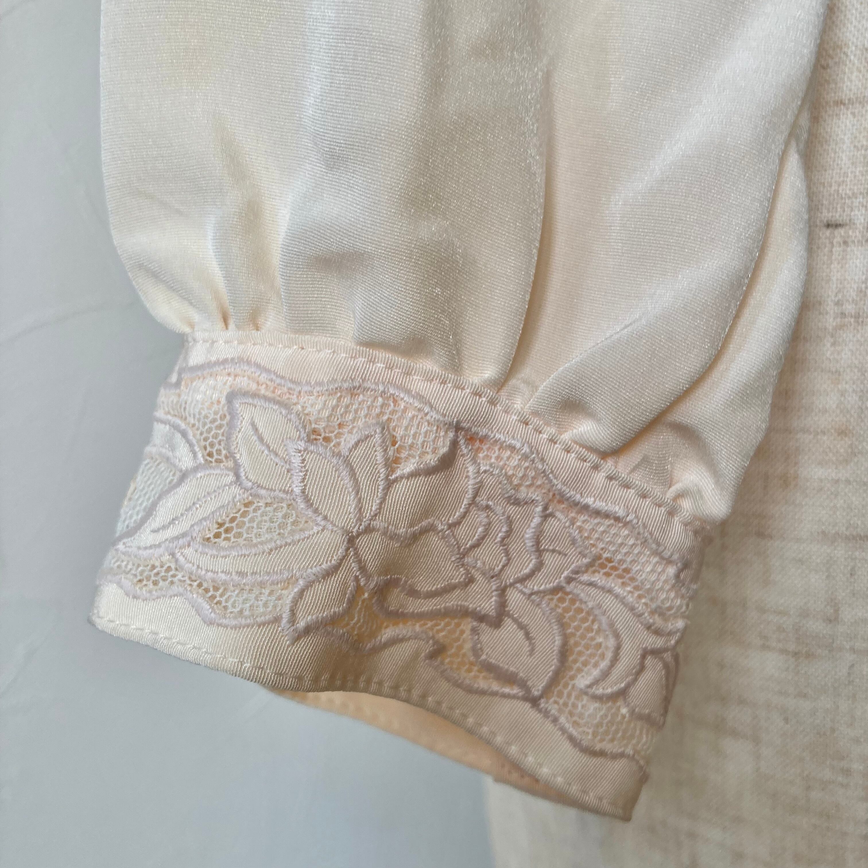 とってもステキなレース刺繍が施されたレトロブラウス◯ クリーム色にレース部分が少しピンクが混じったような色合いで上品かつ繊細で素敵です。袖にも刺繍が入っているのも可愛いポイントです♡