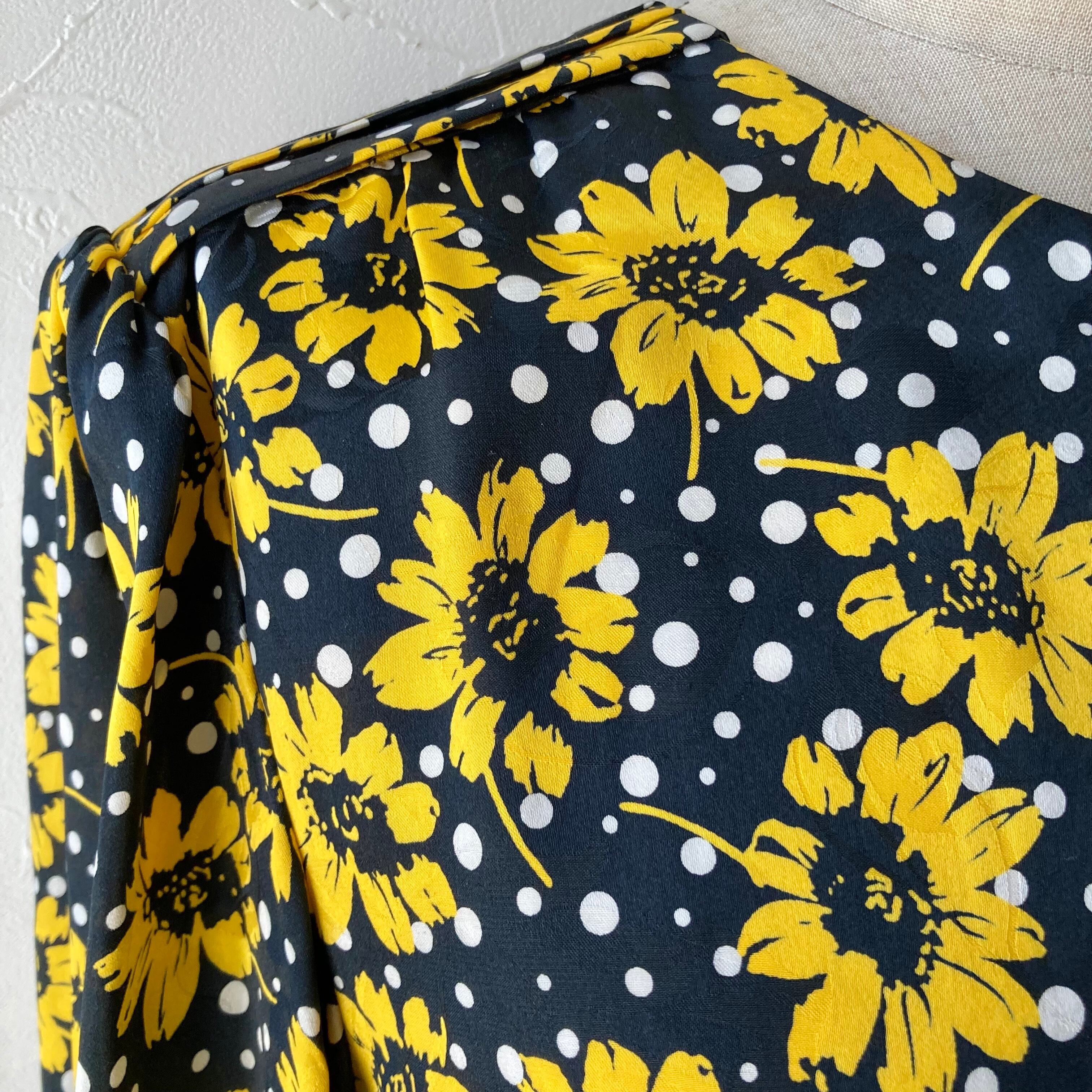 黒地に鮮やかな黄色のお花と弾けるよいな白のドットの柄のブラウス◯ 短めの丈でデニムと合わせたら春らしくて可愛いです♡ ふわりとした七分袖デザインもくるみボタンも古着らしさを感じられてステキです。