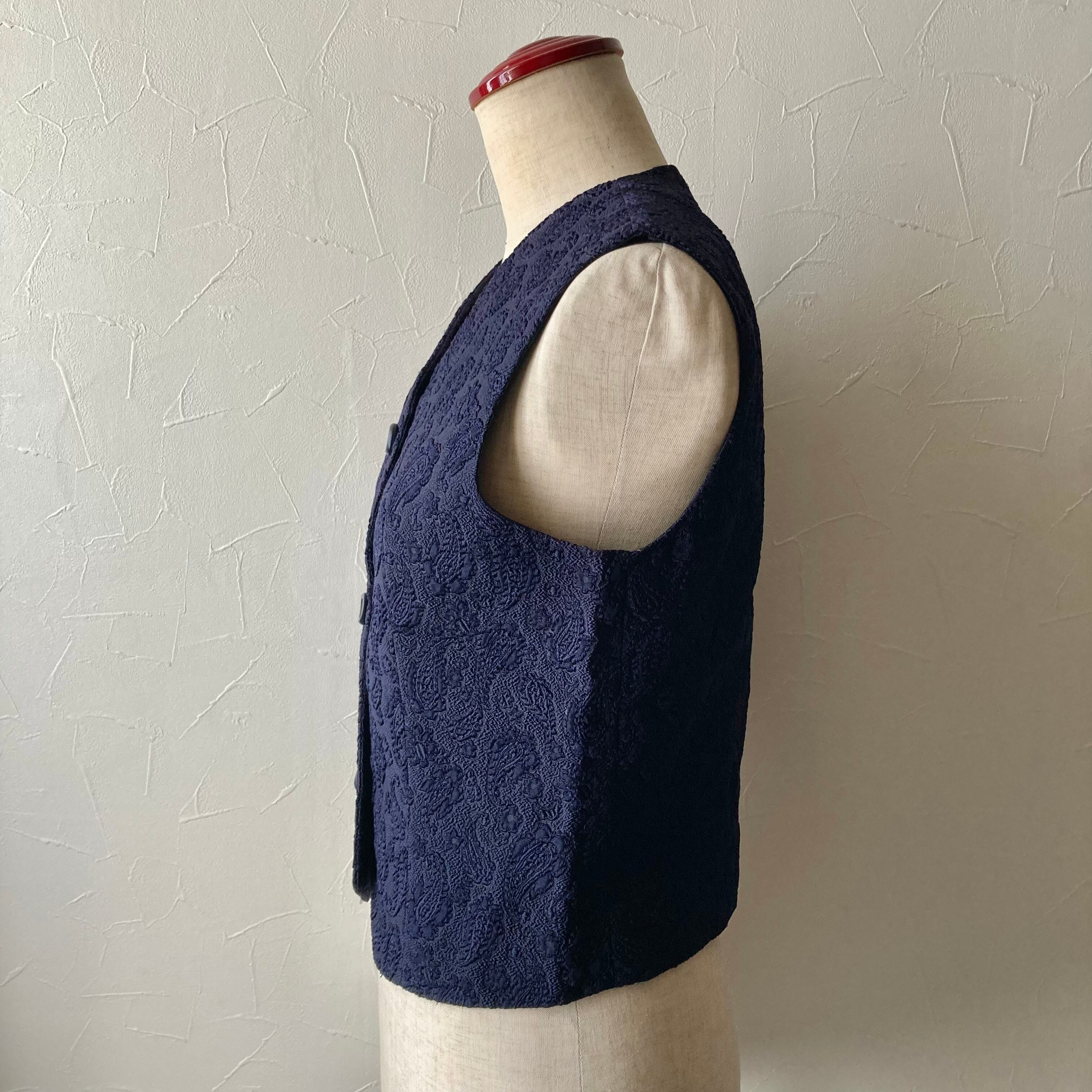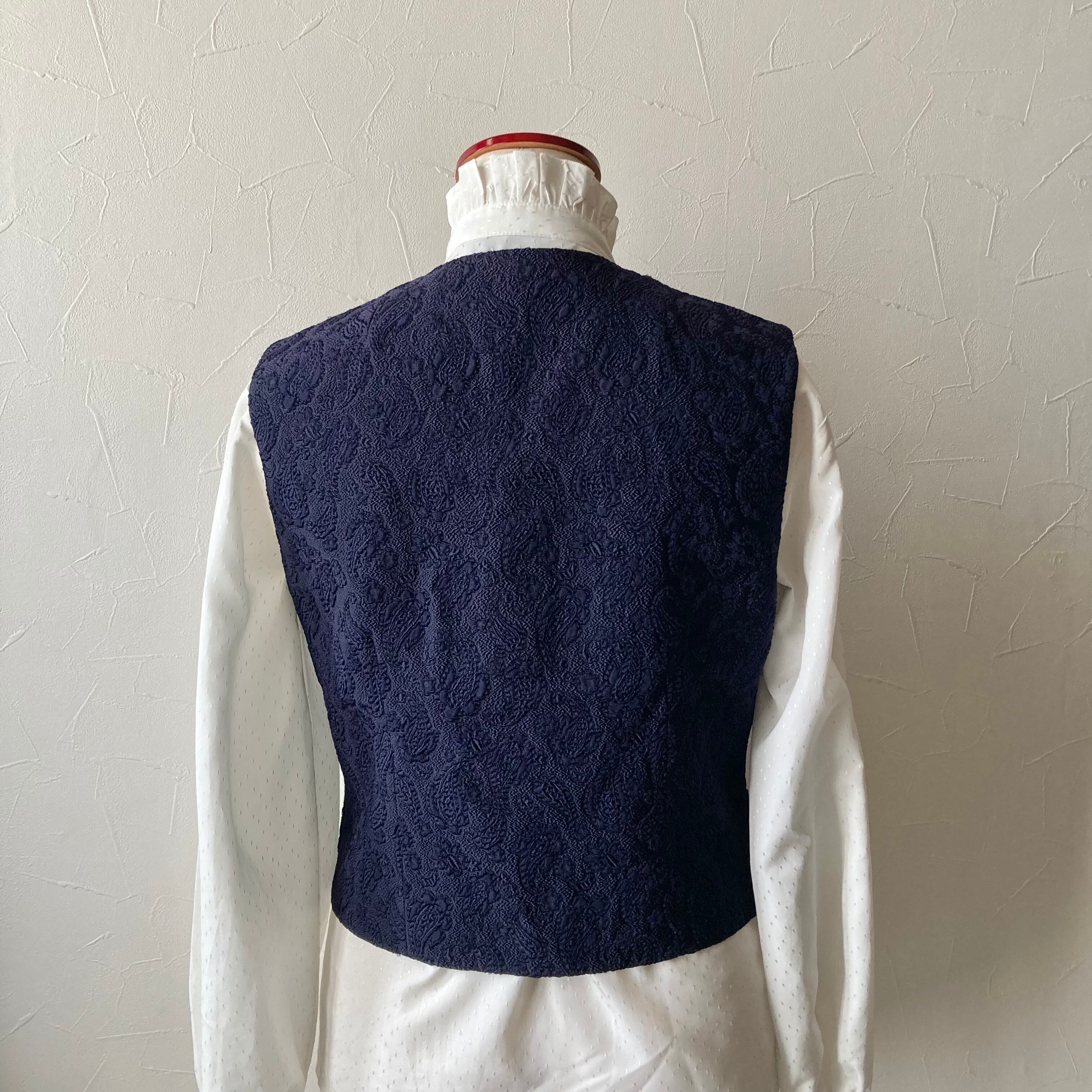 落ち着いたネイビーにシックな刺繍素材のレトロなベスト◯ ワンピースやブラウスなどに合わせると少しきちんと感が出ておしゃれなお出かけにぴったりな素敵コーデに♡