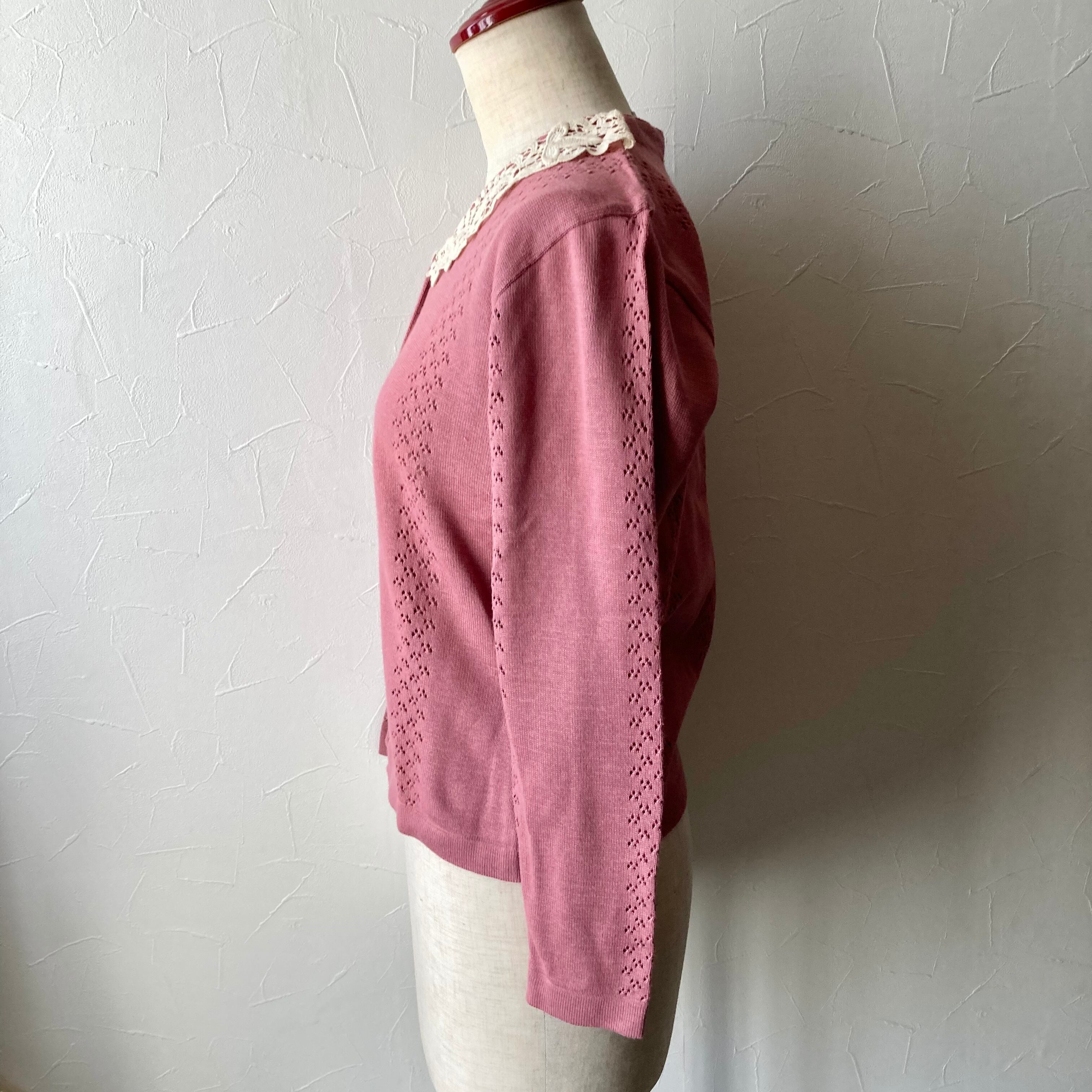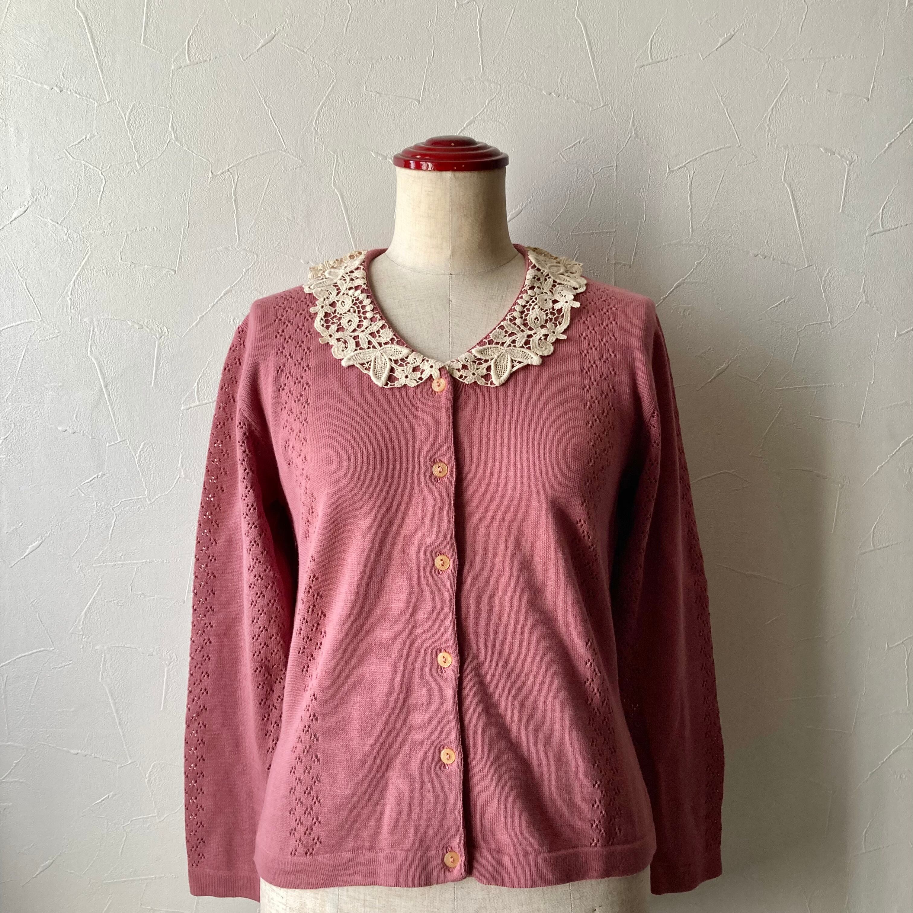 イタリア製くすみピンク襟レースカーディガン 昭和レトロ 古着 used vintage
