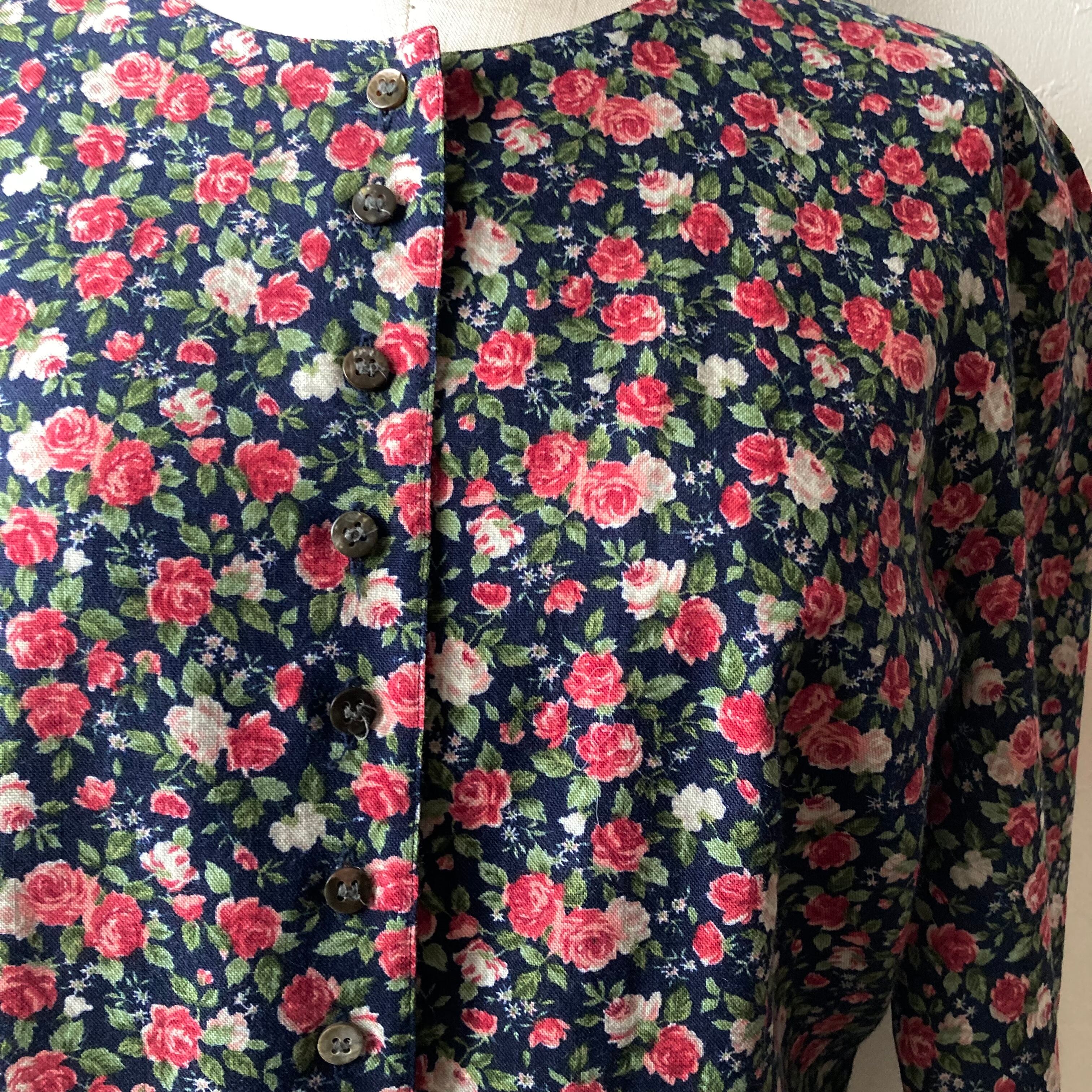 ネイビーにピンクの薔薇柄がレトロで可愛らしいレナウン製ブラウス◯ 袖先やボタンのデザインなど古着ならではの凝ったデザインで、着るともっと可愛い印象だと思います♡