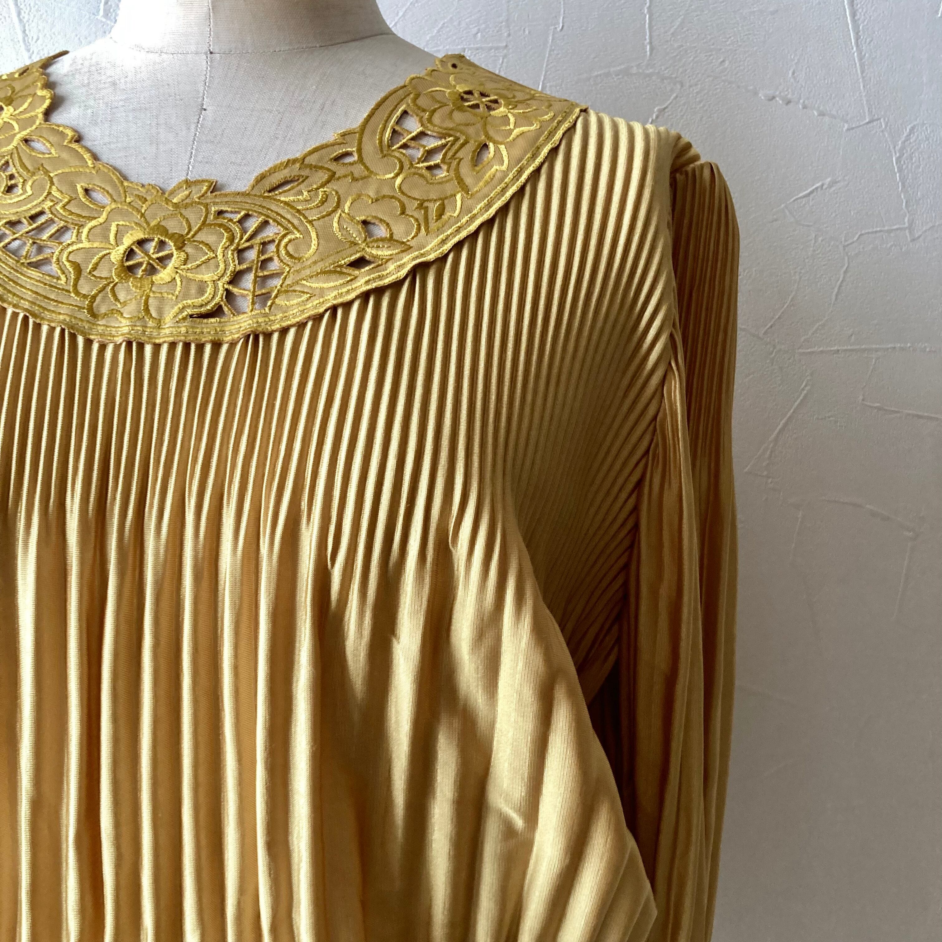 イエロー刺繍プリーツトップス 昭和レトロ 古着 used vintage