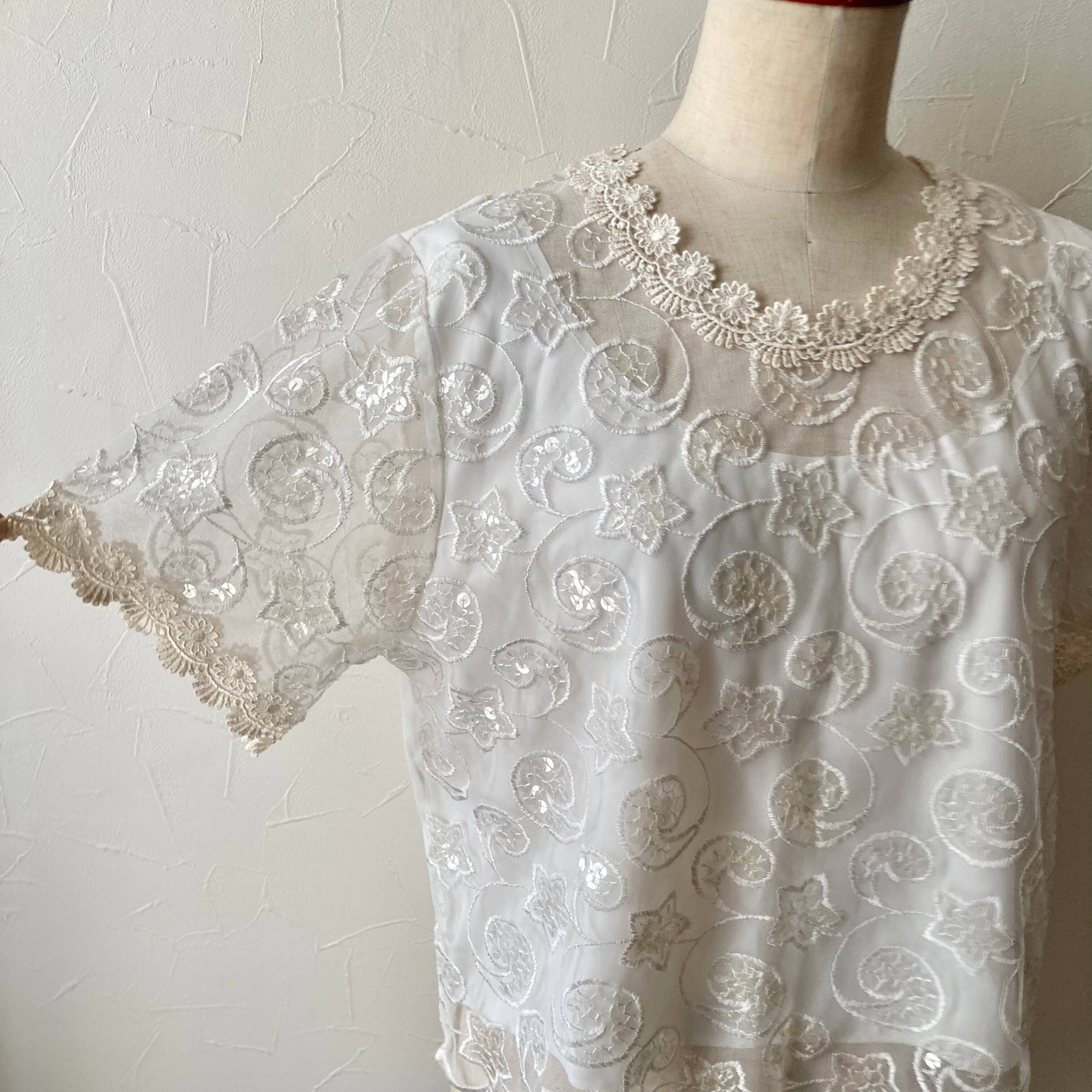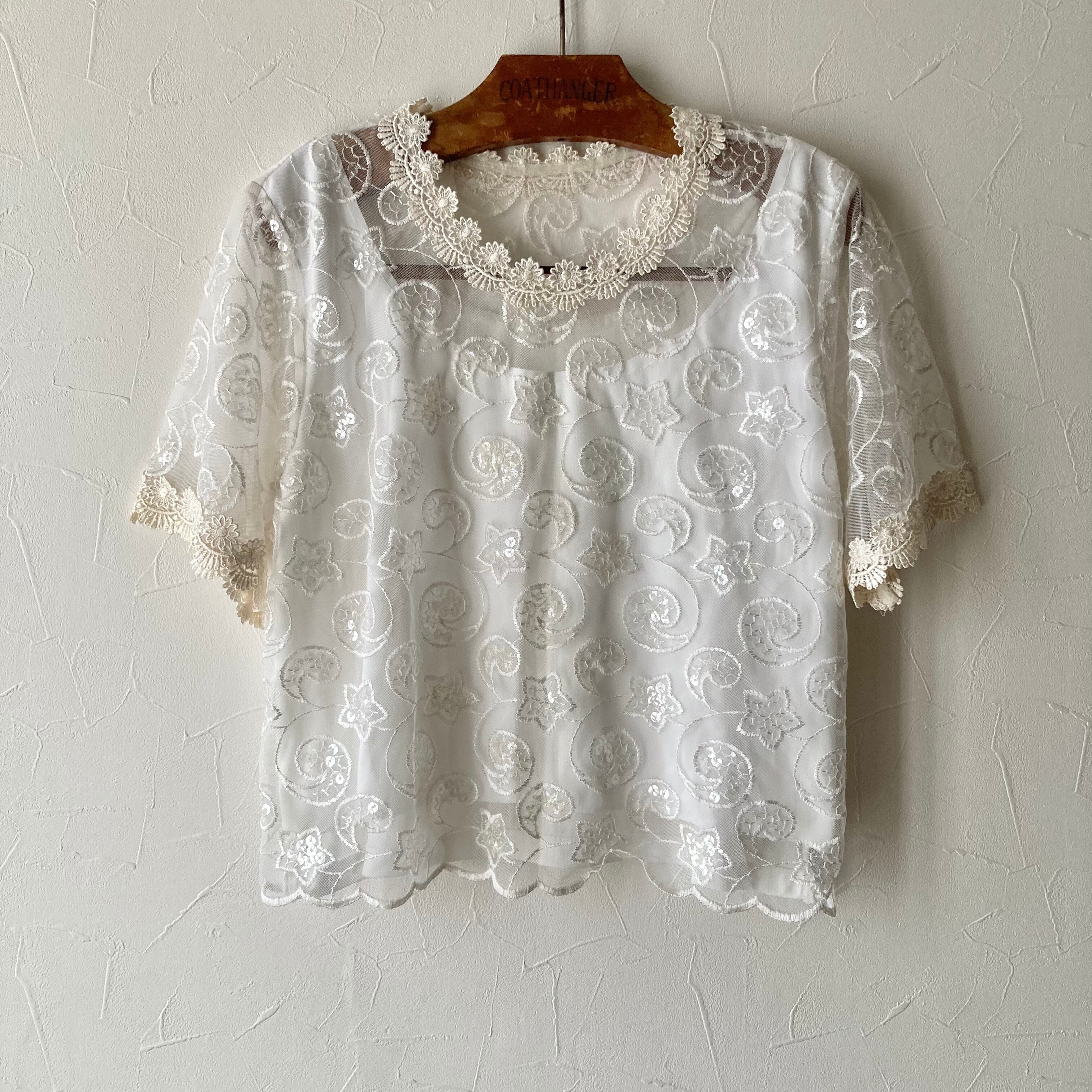 ファンシーでファンタジーなスパンコール刺繍シアートップス 古着 used