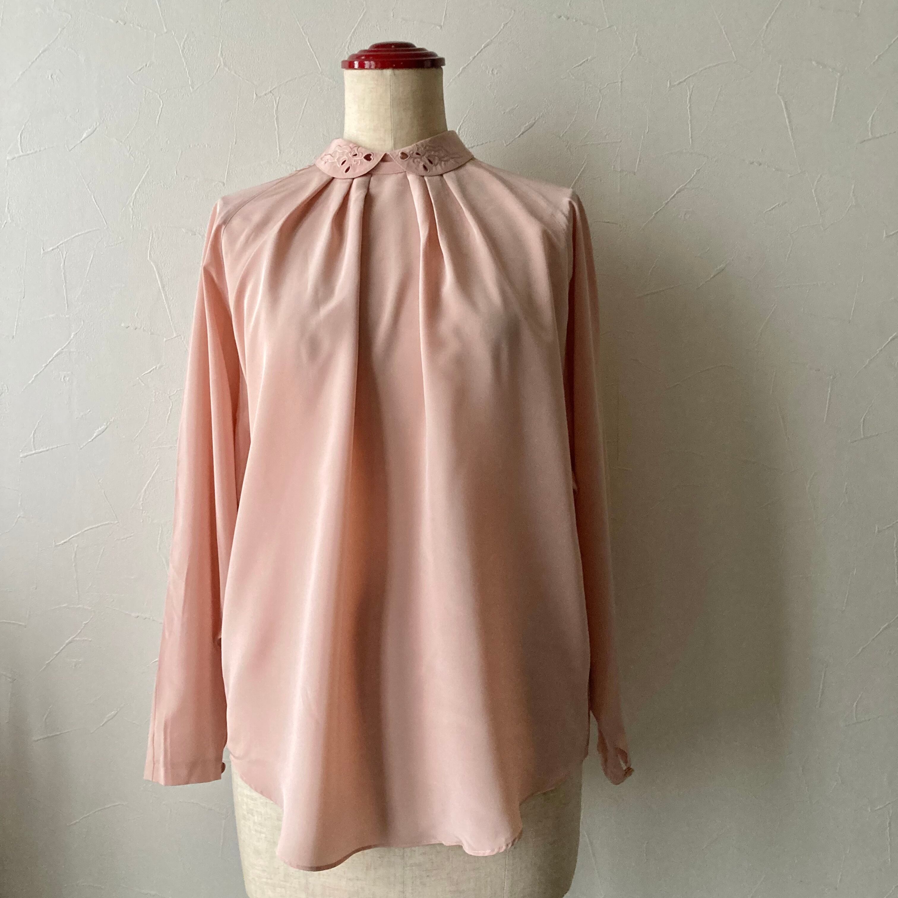 首回りに大きなギャザーが入っているのとドルマンスリーブでふんわり可愛いシルエットが作られています。くすんだ淡いピンクですのでピンクに抵抗がある方でも、春らしくステキに着ていただけると思います。