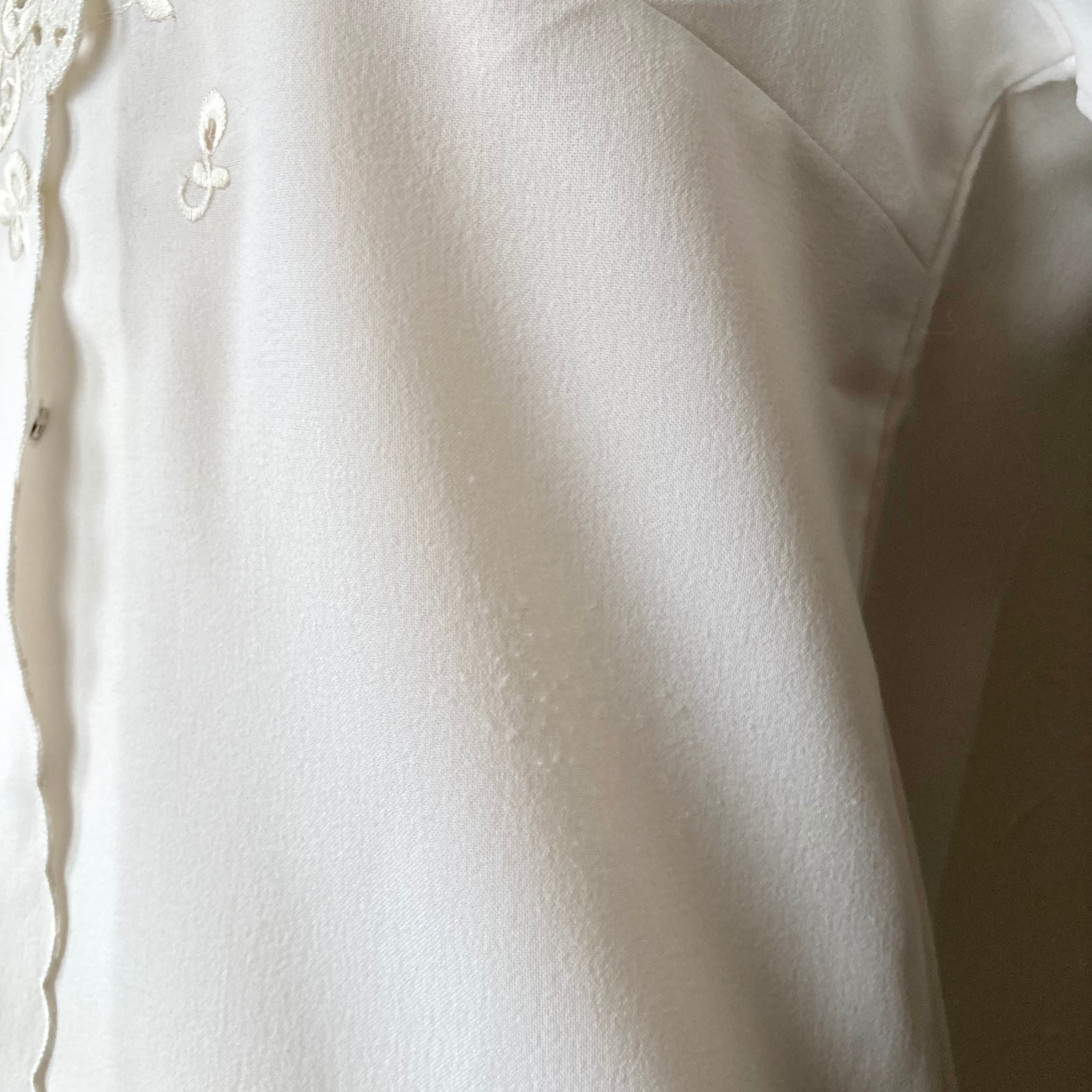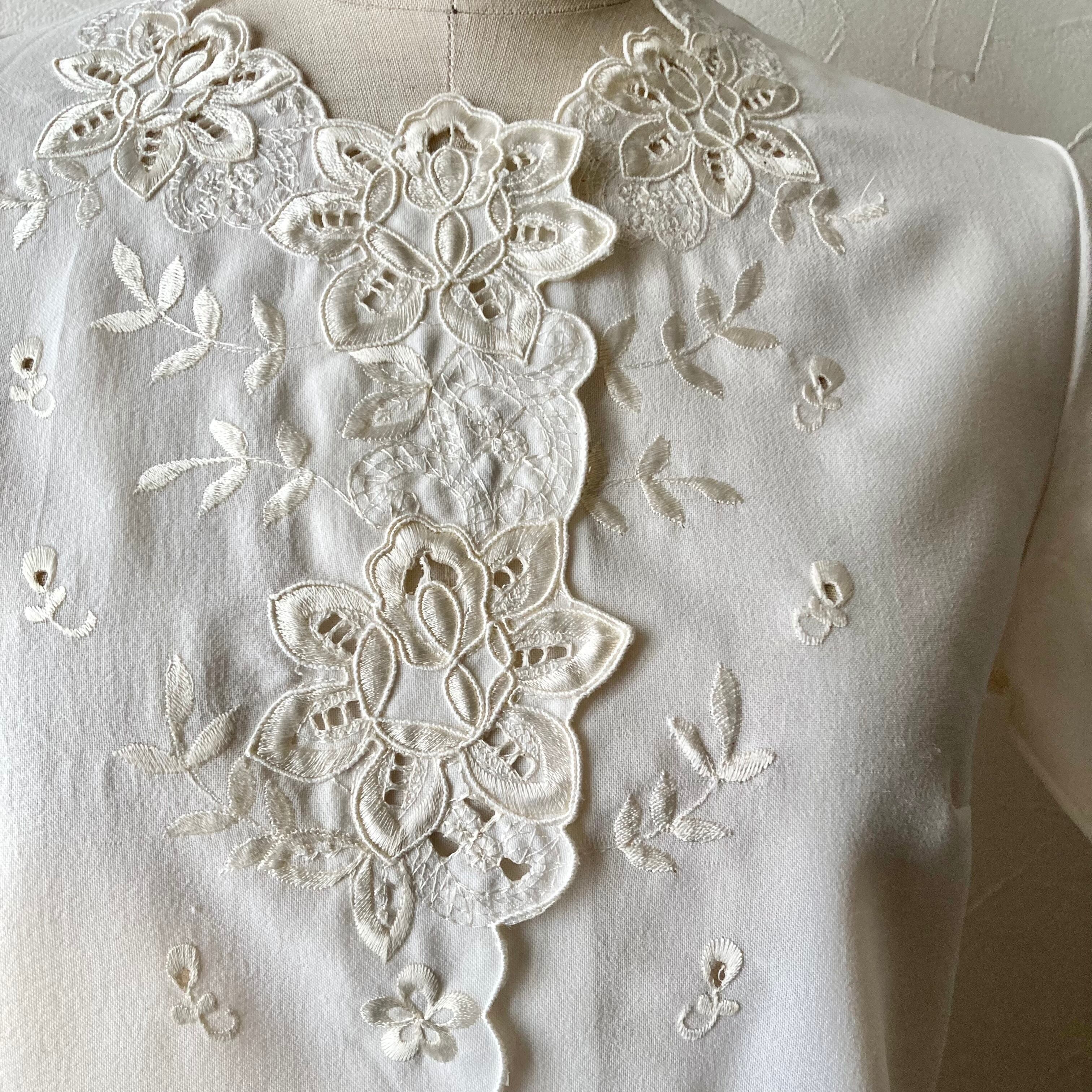 胸の上品な雰囲気のお花のカットワーク刺繍がステキなレトロなブラウス。首回りや袖がスカラップデザインになっているのも可愛らしいです。