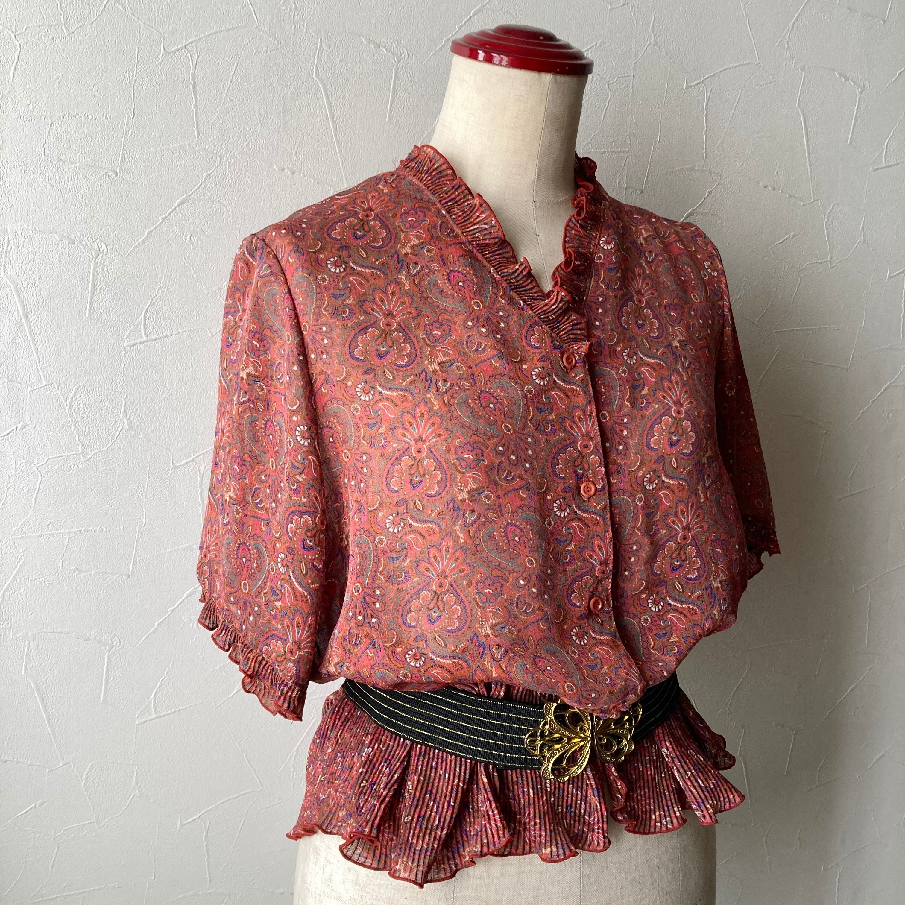 落ち着いた色合いのオリエンタルな柄が古着らしくてステキなブラウス。首回りと裾のプリーツデザインもふんわりした抜け感を出して可愛いです。切り替え部分にベルトをしてメリハリをつけたり、さらっと羽織りとしても着ていただけます。