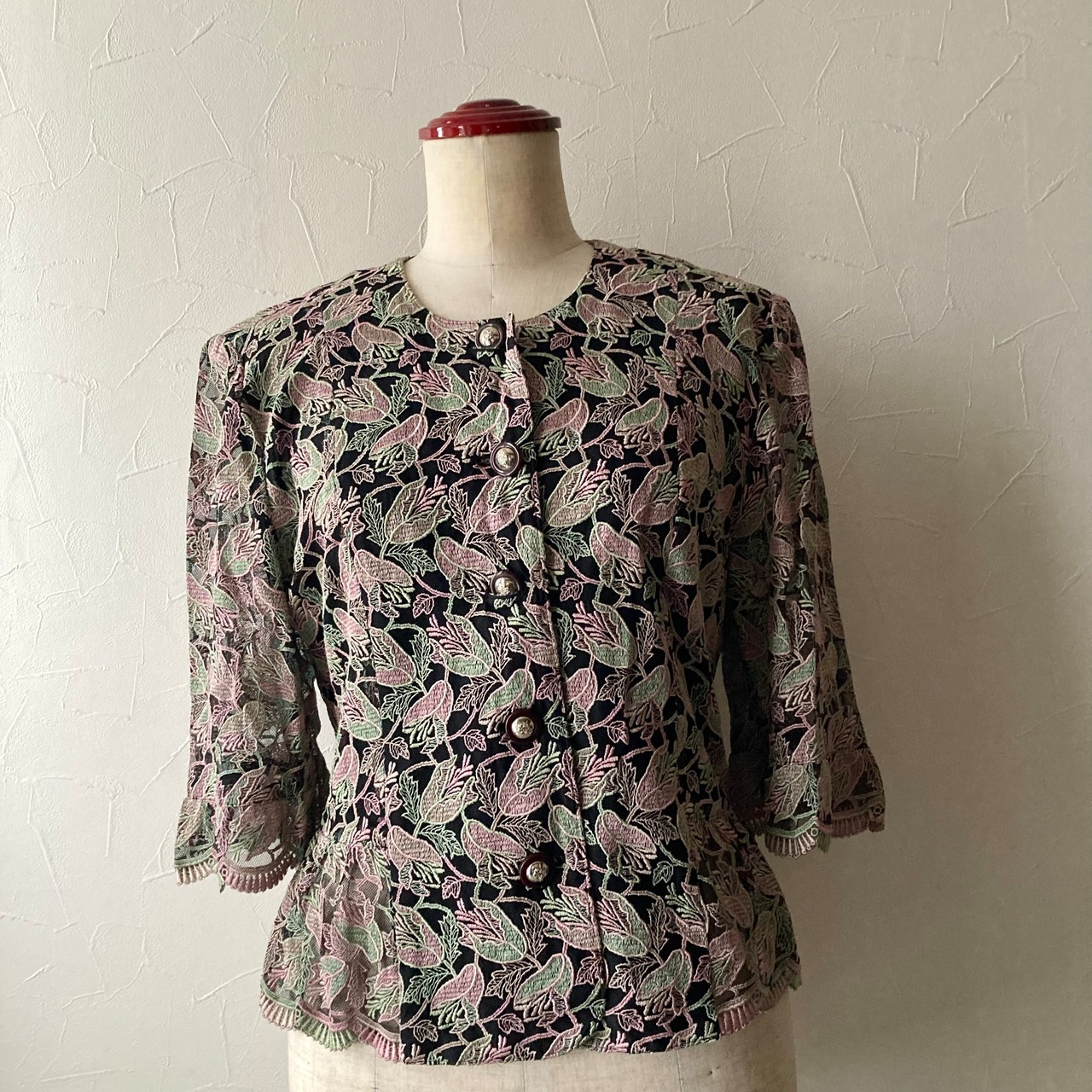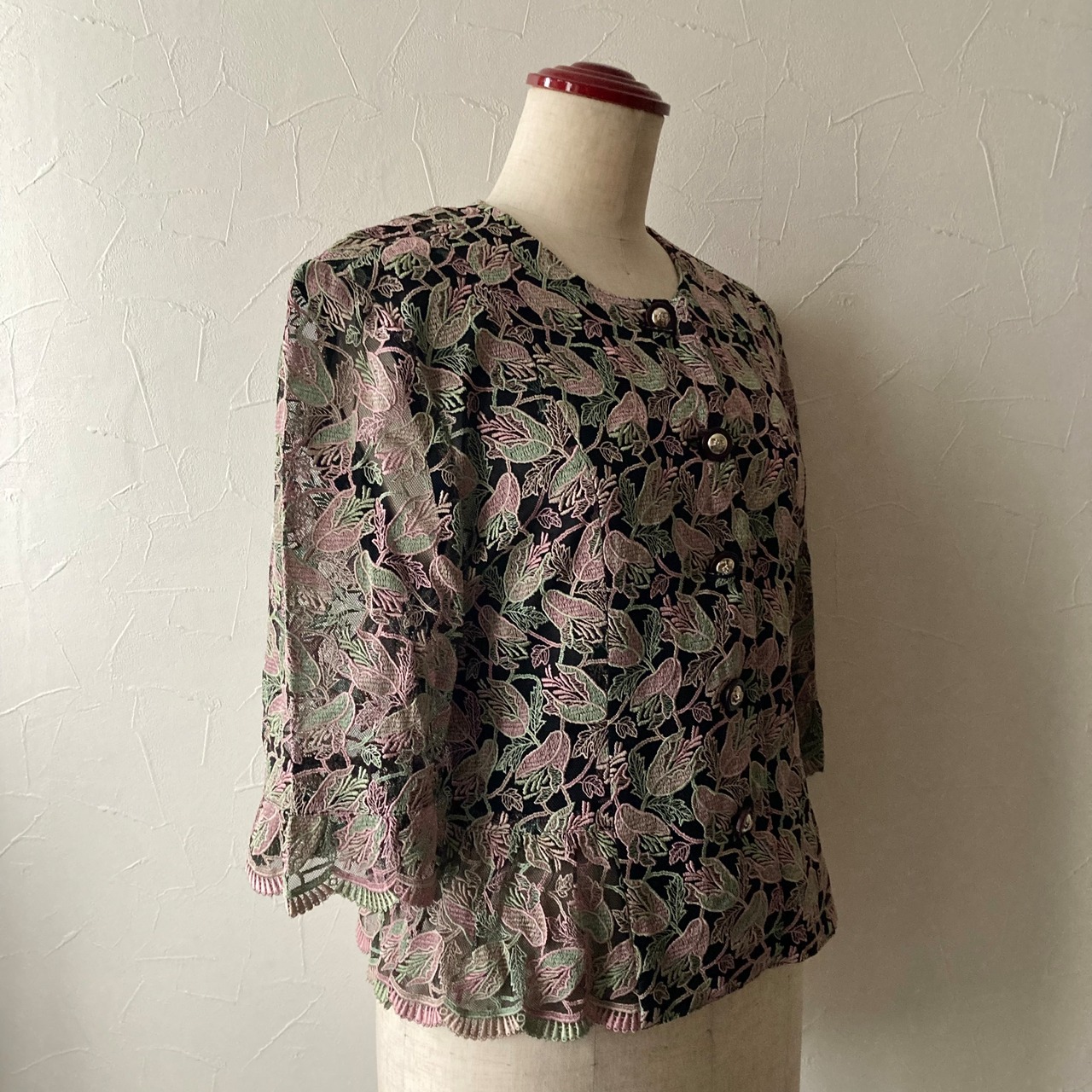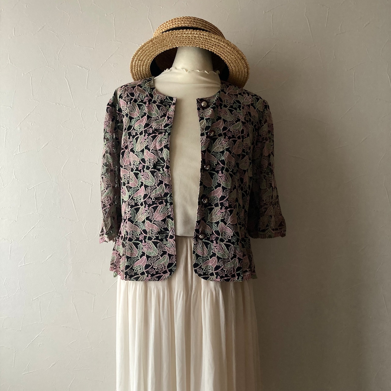 黒地にピンクとグリーンのお花刺繍が可愛らしいレトロなサマージャケット。優しく広がったスカラップデザインの袖は透け感があり、肘が隠れるくらいの丈感は涼しげです。裾もひらひらとスカラップデザインになっていて、上品さの中に遊び心も感じるステキな一枚です。