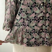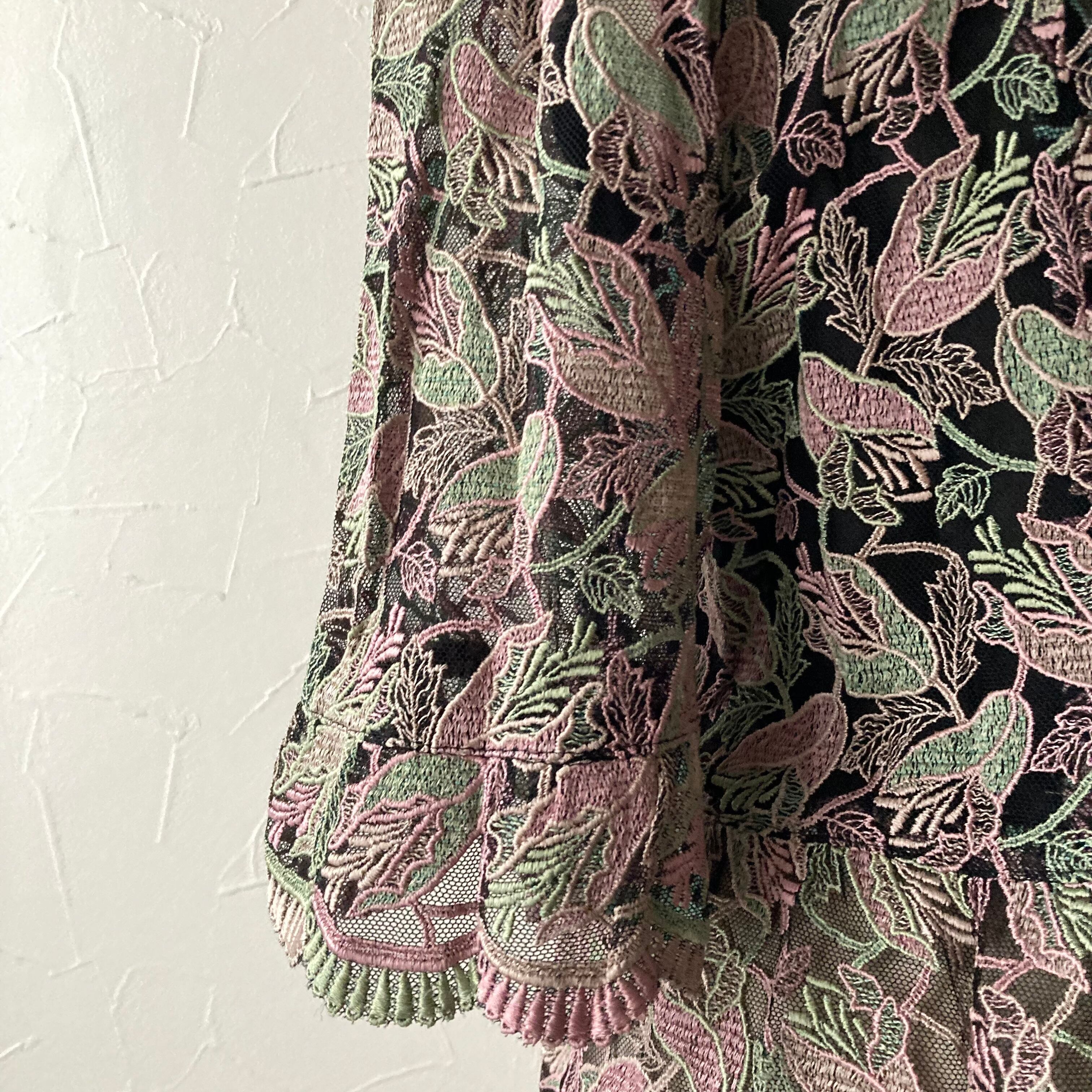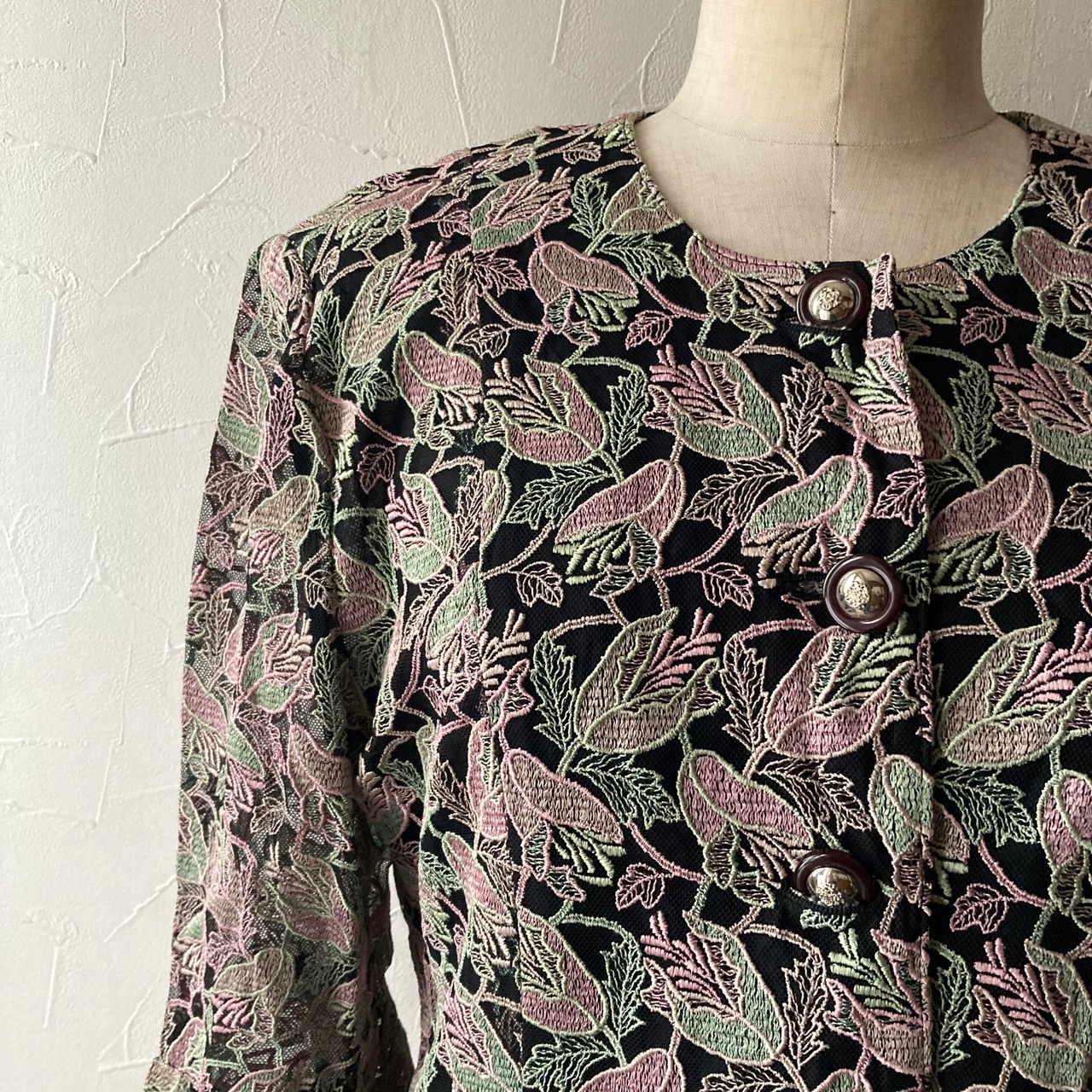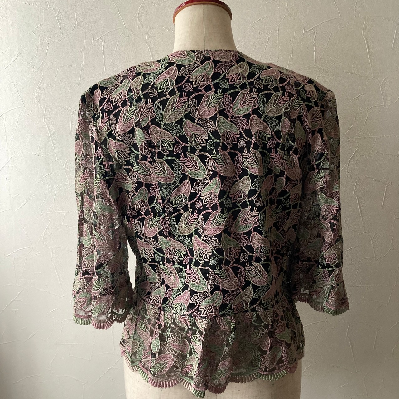 黒地にピンクとグリーンのお花刺繍が可愛らしいレトロなサマージャケット。優しく広がったスカラップデザインの袖は透け感があり、肘が隠れるくらいの丈感は涼しげです。裾もひらひらとスカラップデザインになっていて、上品さの中に遊び心も感じるステキな一枚です。