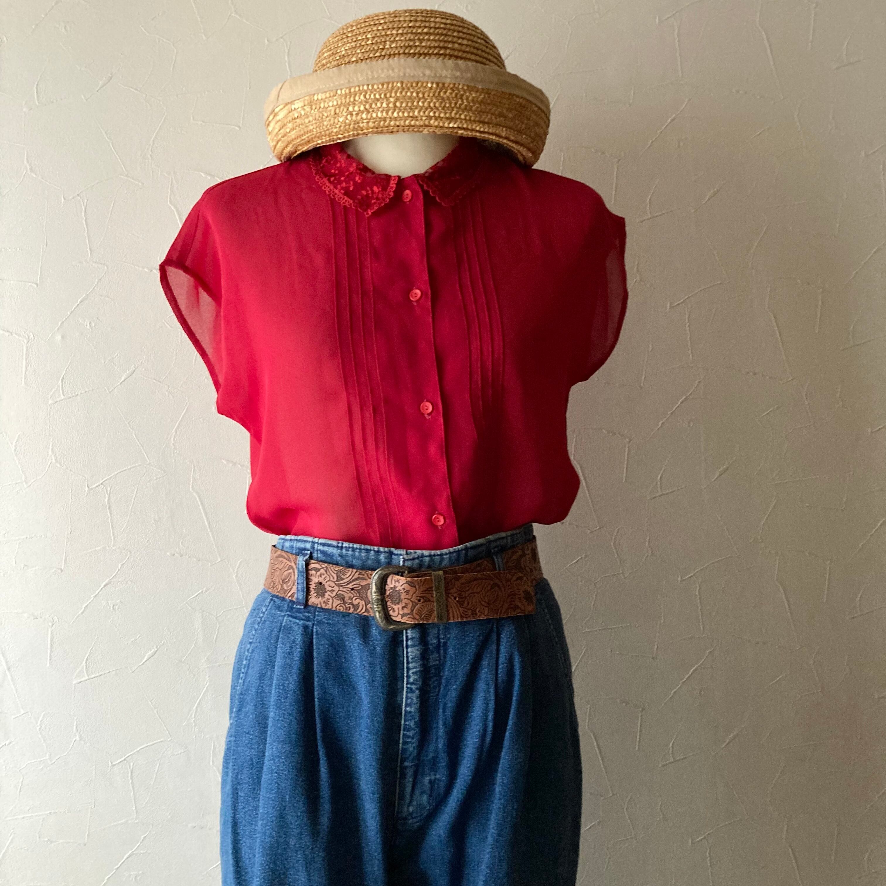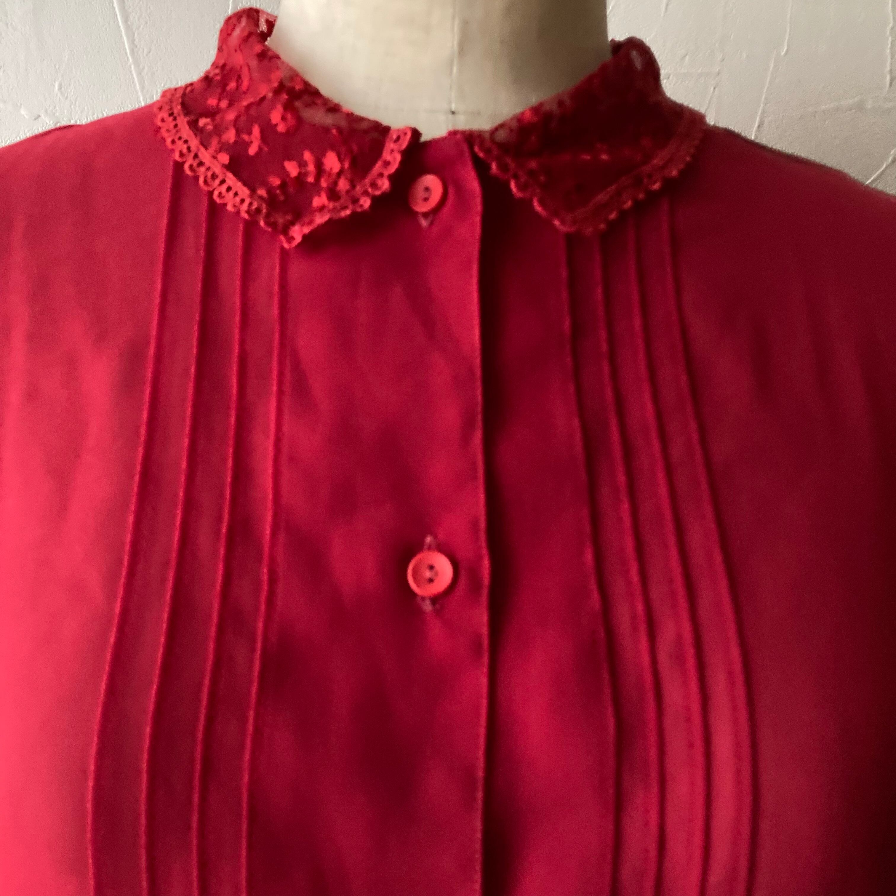 赤レース襟フレンチスリーブブラウス 昭和レトロ 古着 used vintage