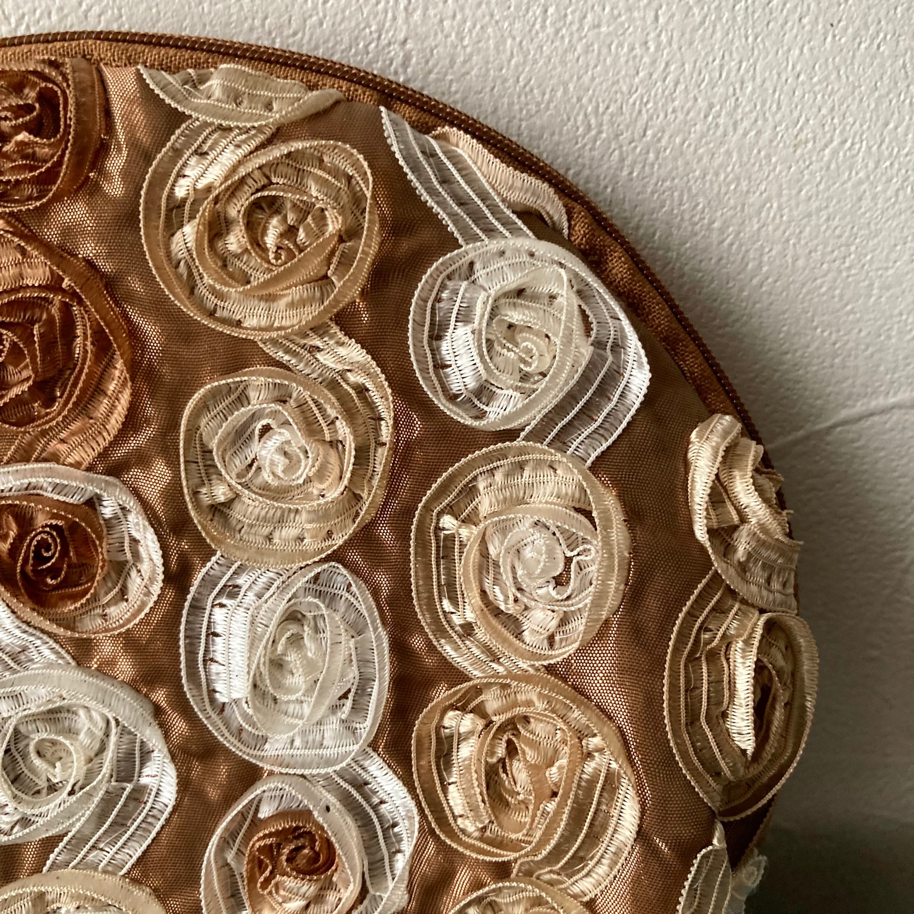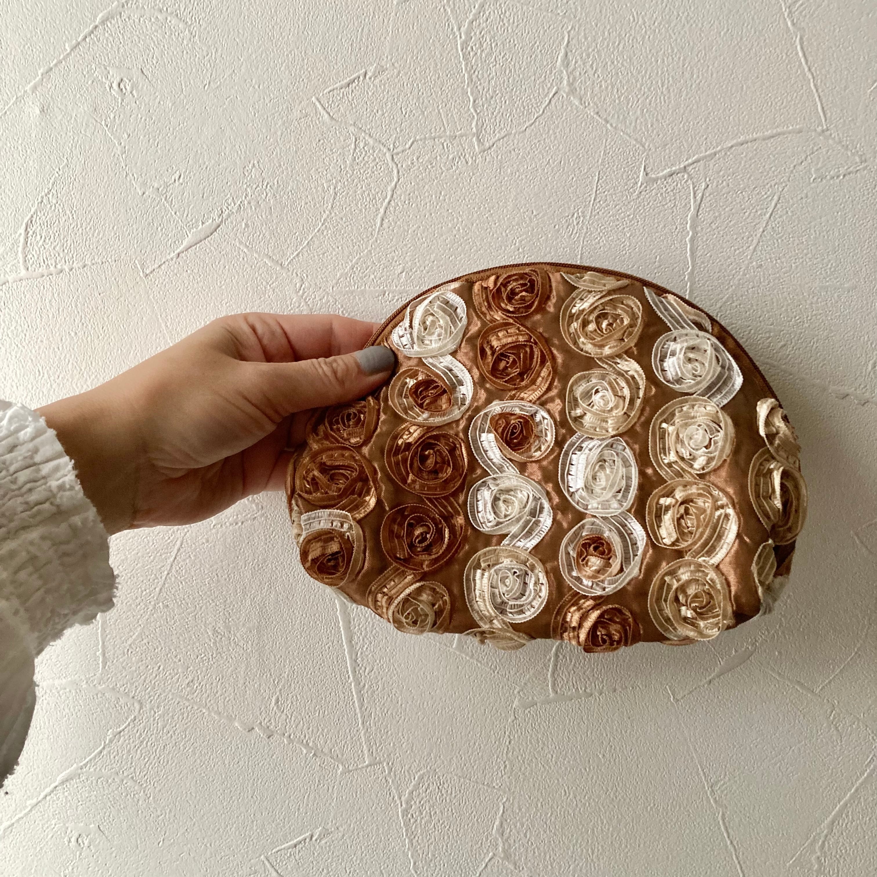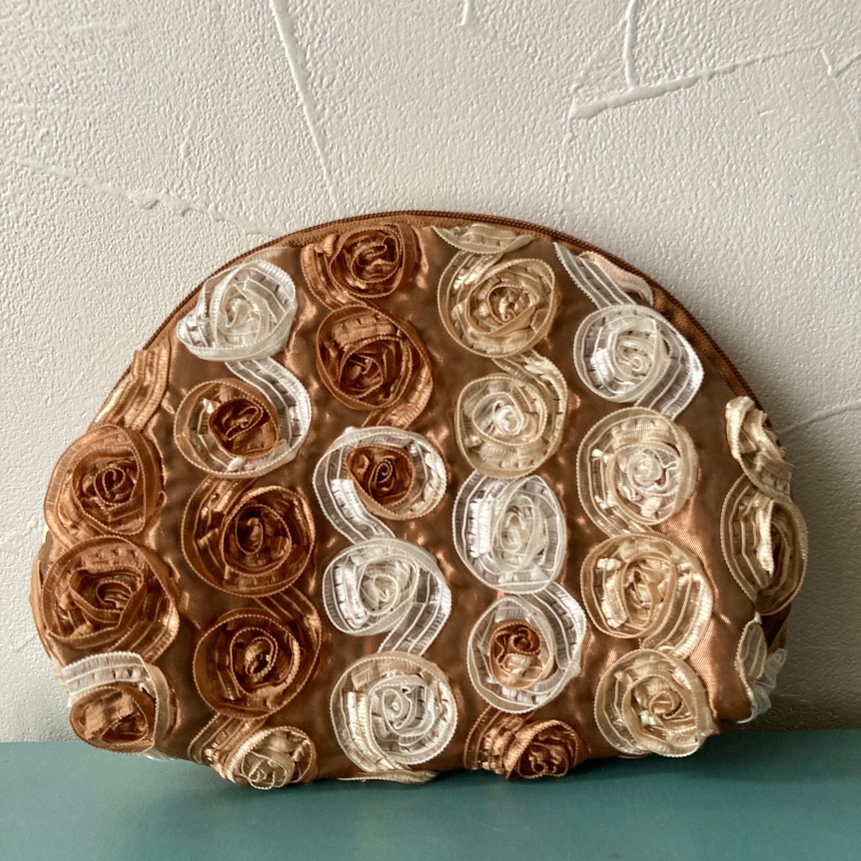 ブラウン系のレースがくるくると花のように巻かれたおしゃれなポーチ。お化粧いれや小物入れに。
