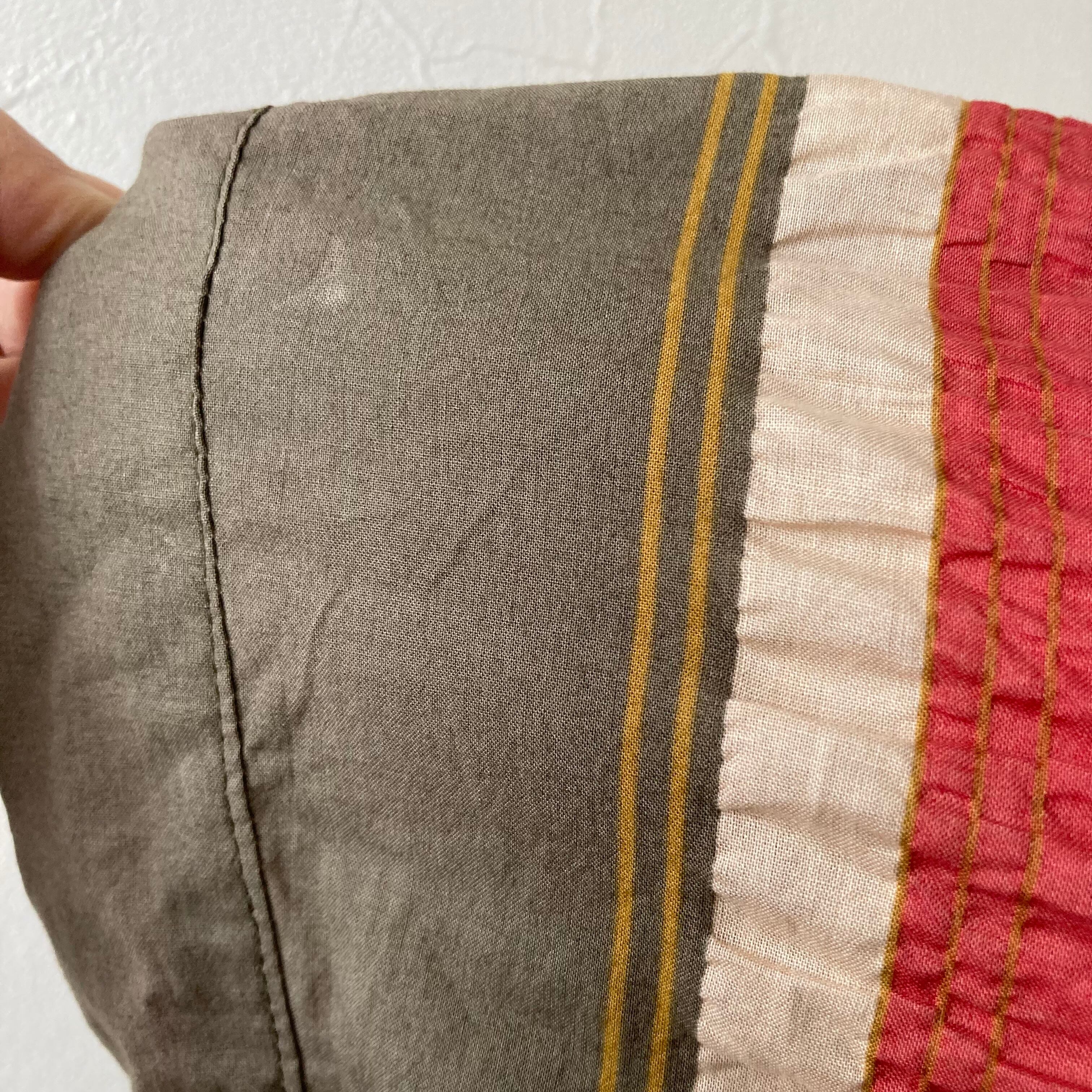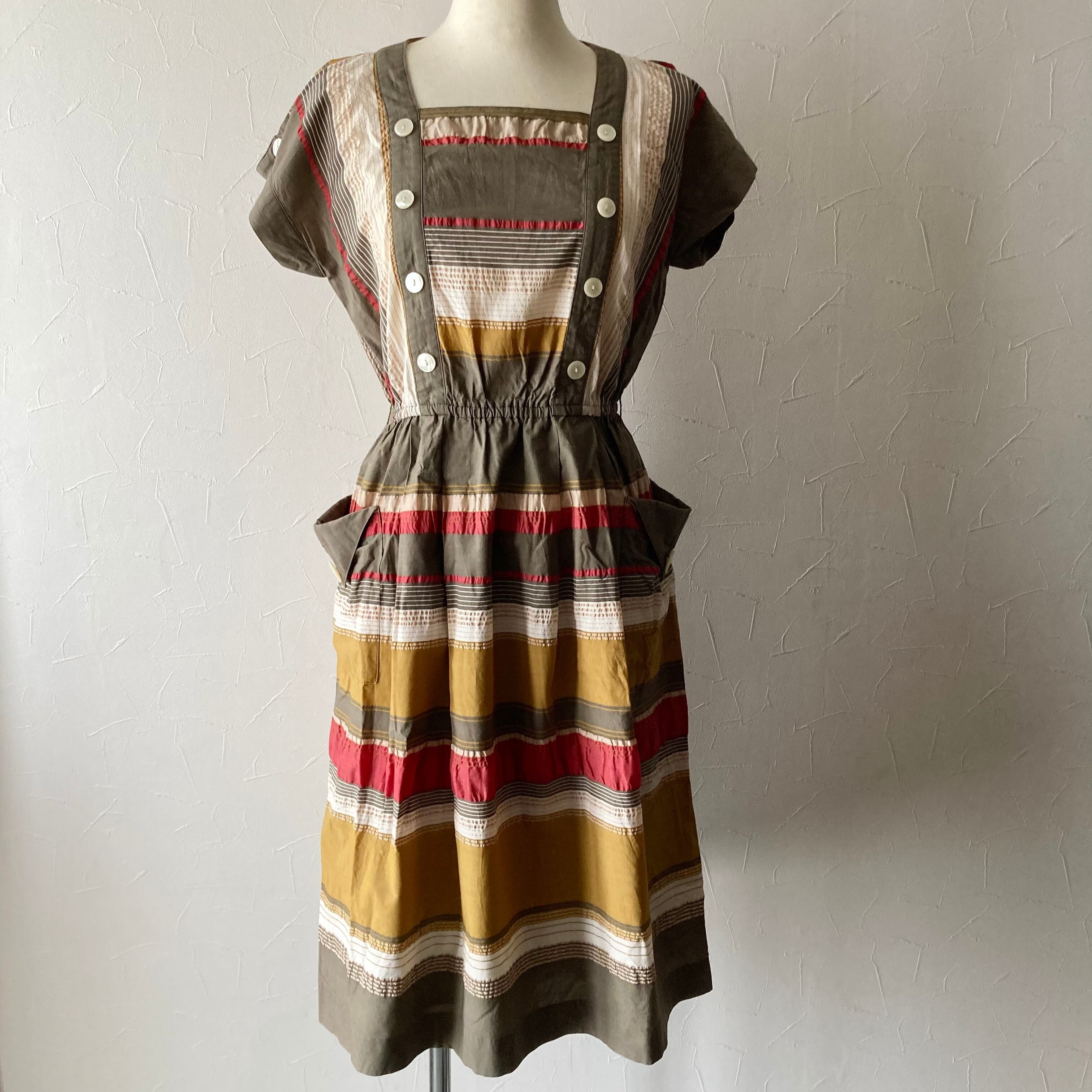 フレンチスリーブにウエストはゴムでくしゅくしゅっとシルエットがきれいなワンピース◯ レトロな色合いやデザインがステキでコットン素材なのでこれからの季節に気持ちよく沢山着ていただけます。一枚でも、下にボトムを合わせても可愛いです。