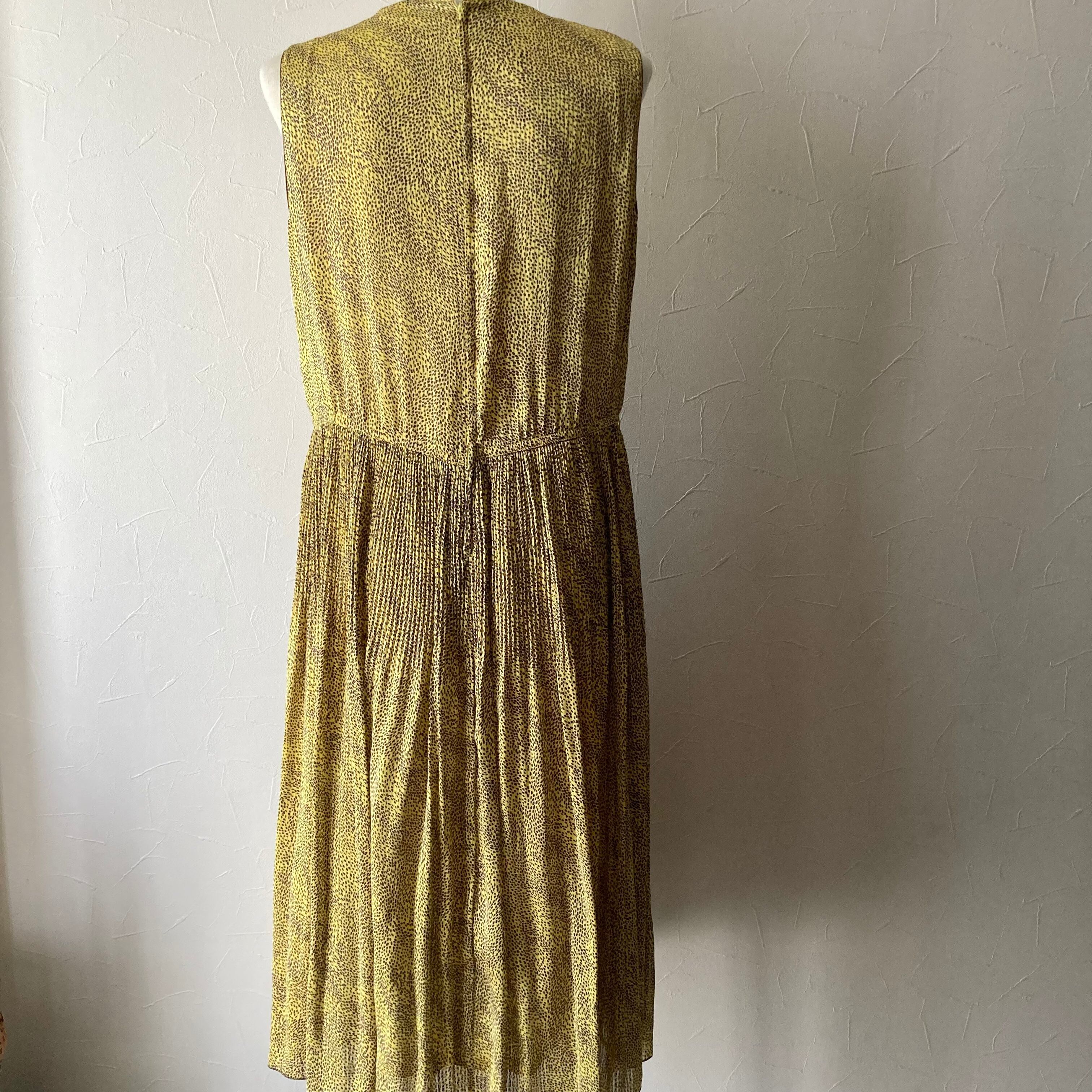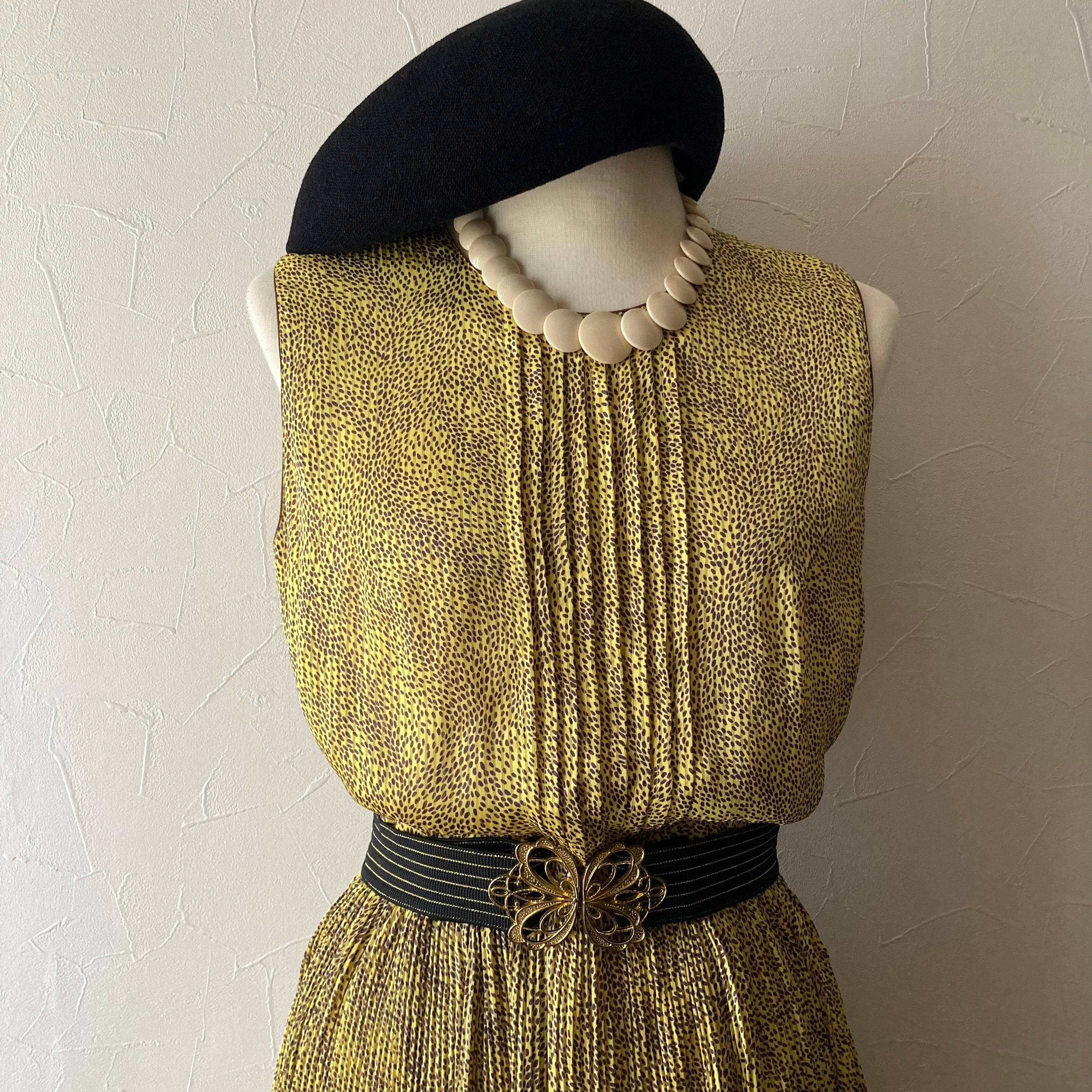ストライプの入ったイエロー素材にブラウンの動きのある小さな楕円形の模様が描かれたレトロなワンピース◯ なんとなくアニマル柄にも見えるような模様ですがスカート部分は細かなプリーツが入っていてフェミニンさも感じて強すぎない優しい雰囲気です。下に黒色のインナーや白いブラウスなどと合わせたり春秋も着ていただけるデザインだと思います。