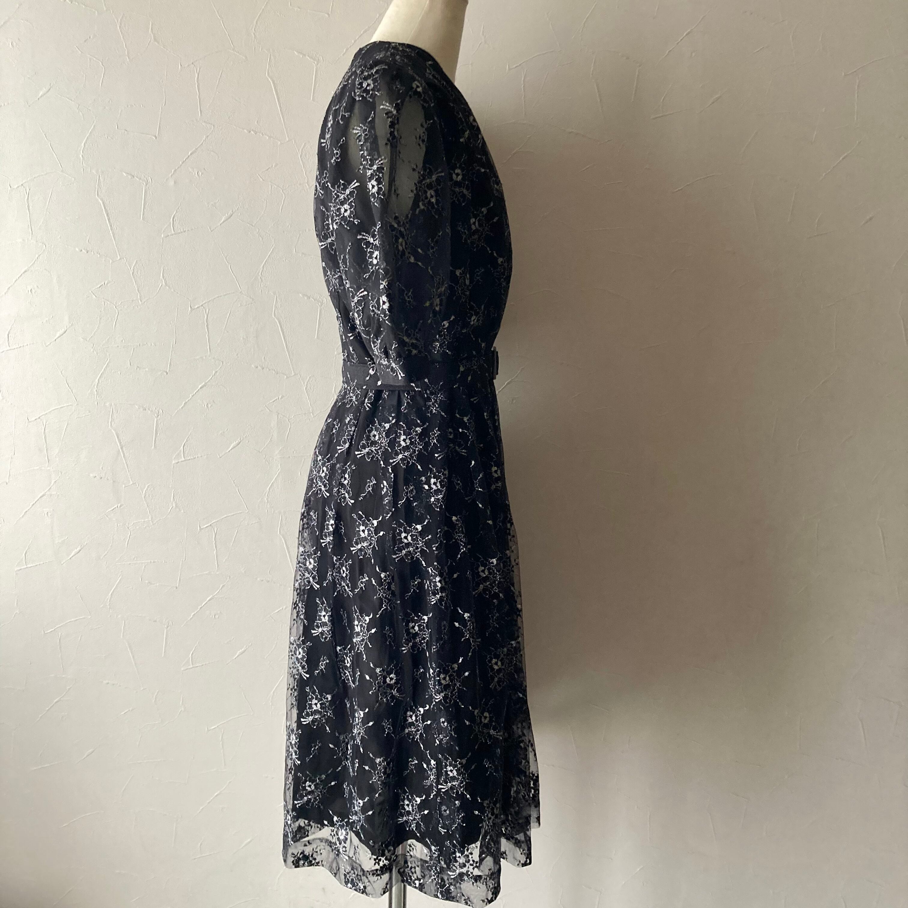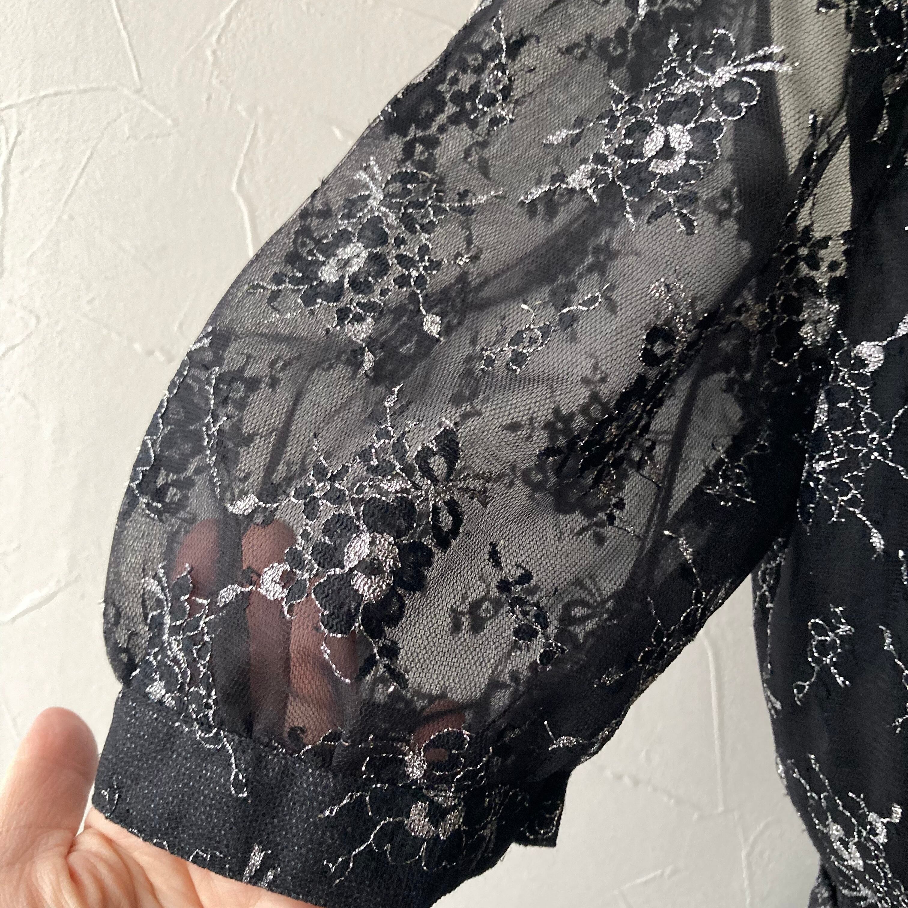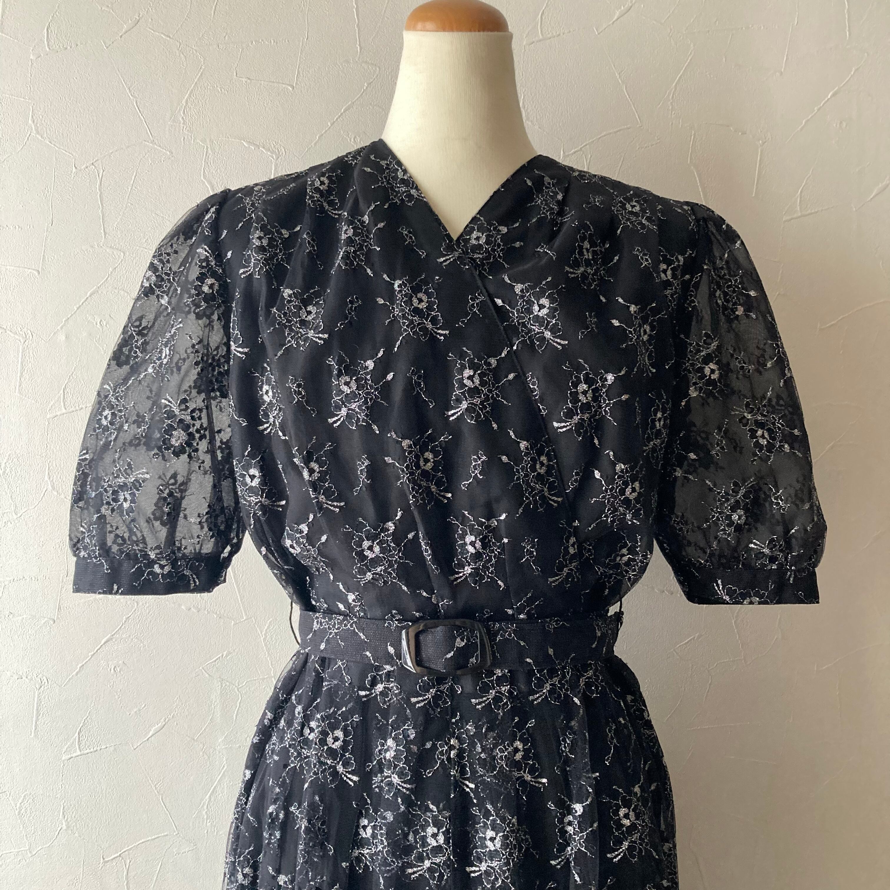 黒色レースに黒とシルバーラメの花とリボンが施さた上品さと可愛らしさを兼ね備えたワンピース◯ カシュクールデザインに、透け感のある大きなパフスリーブがレトロな存在感を醸し出しています。