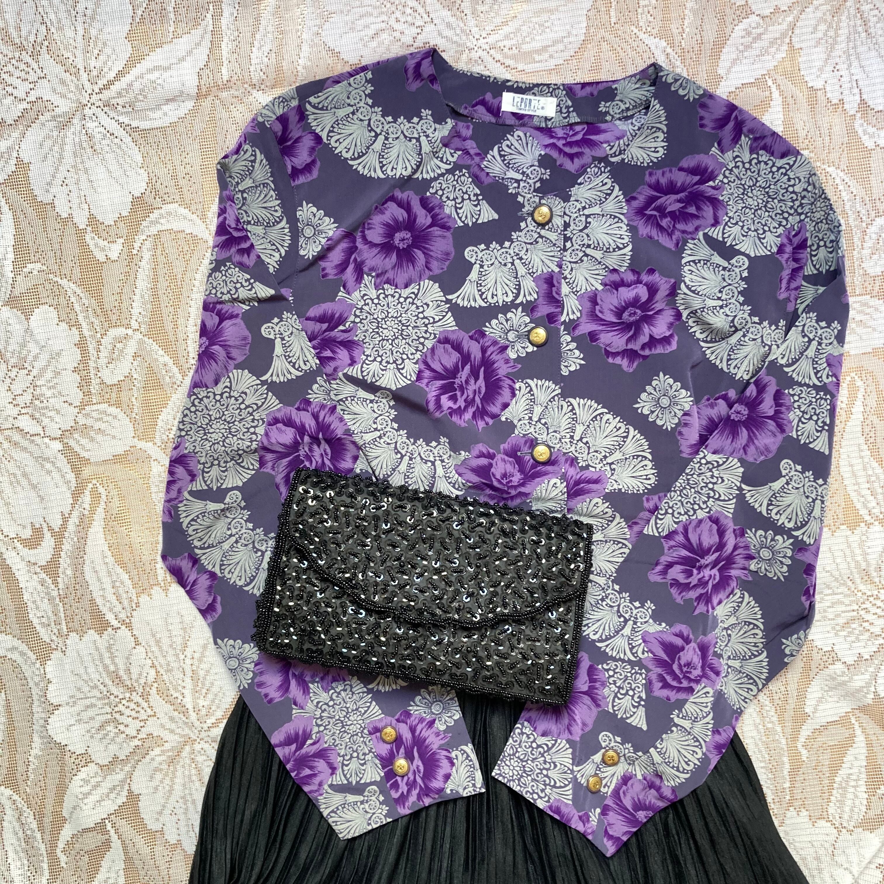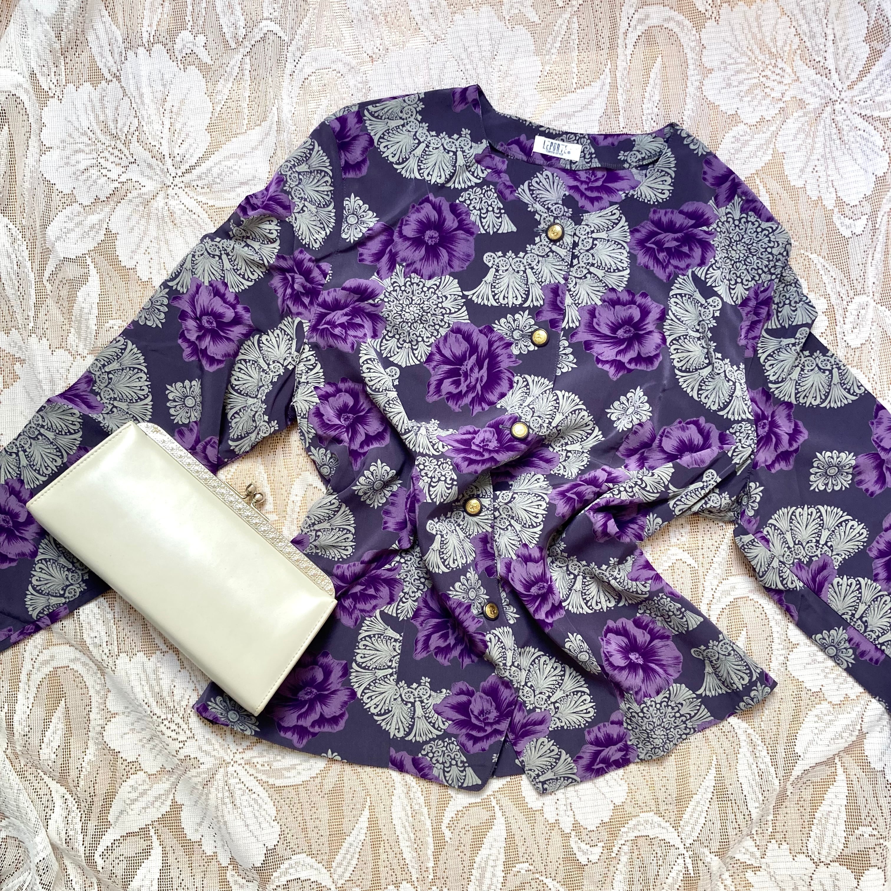 グレーに紫色の花とエレガントな花模様が目を惹く東京ブラウス製ブラウス◯