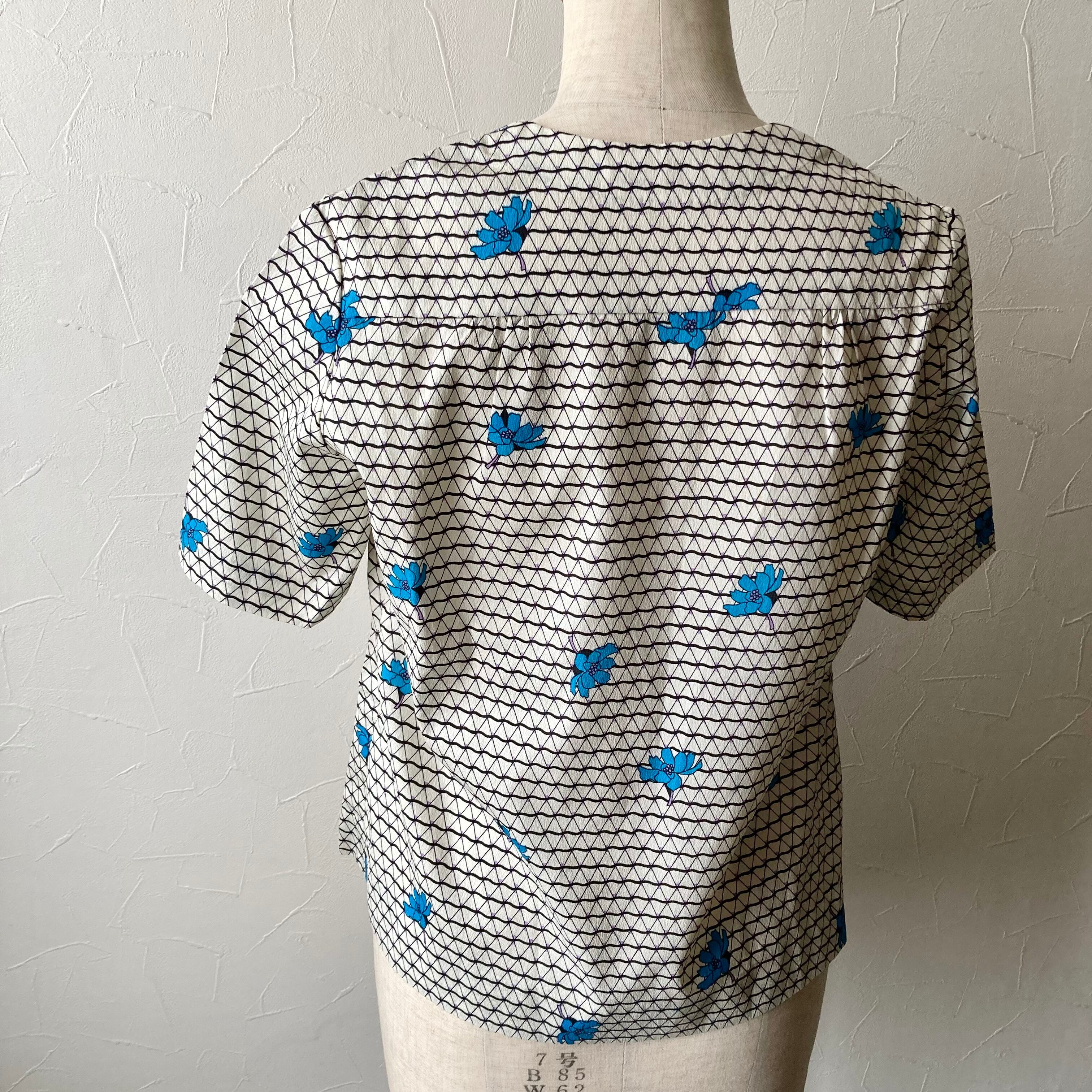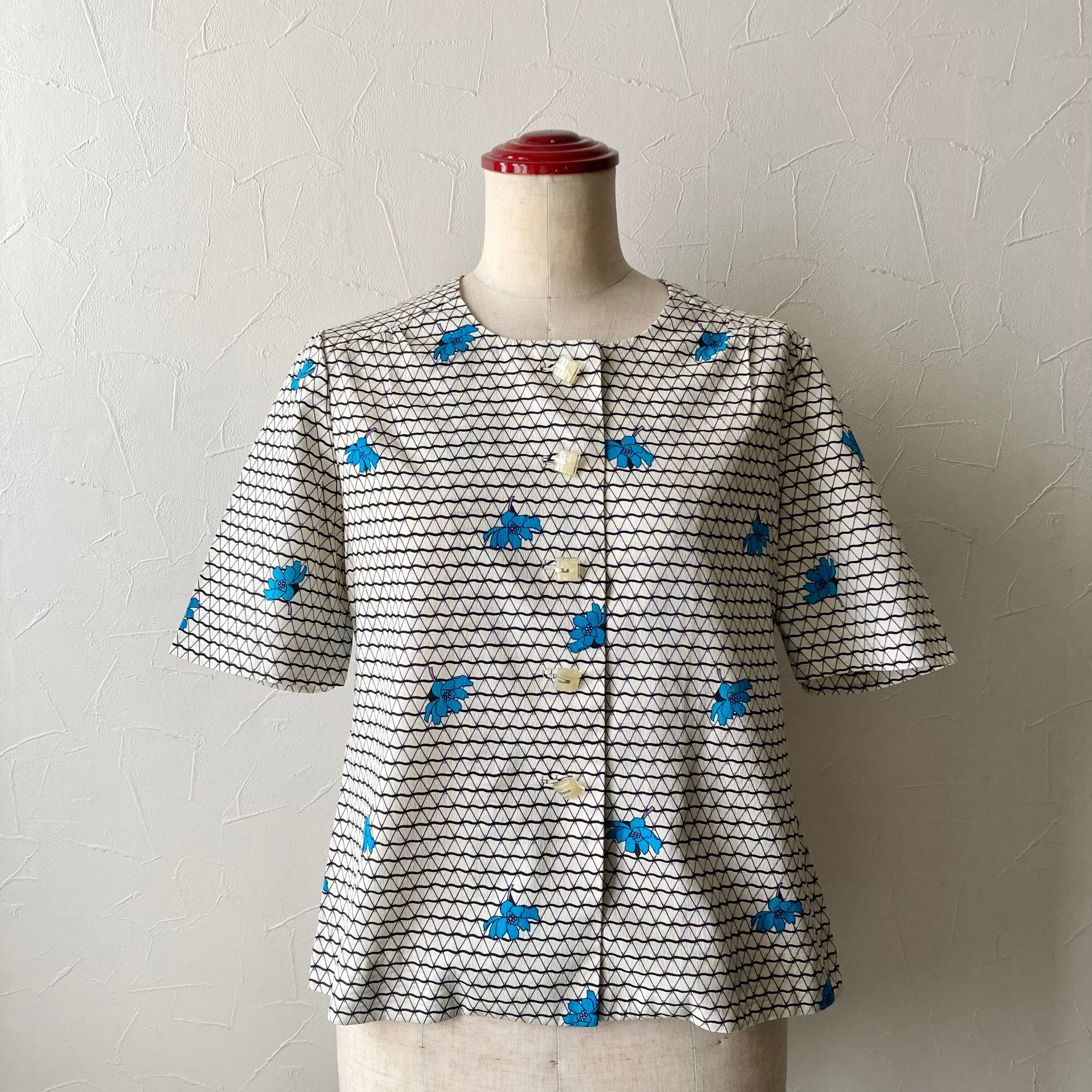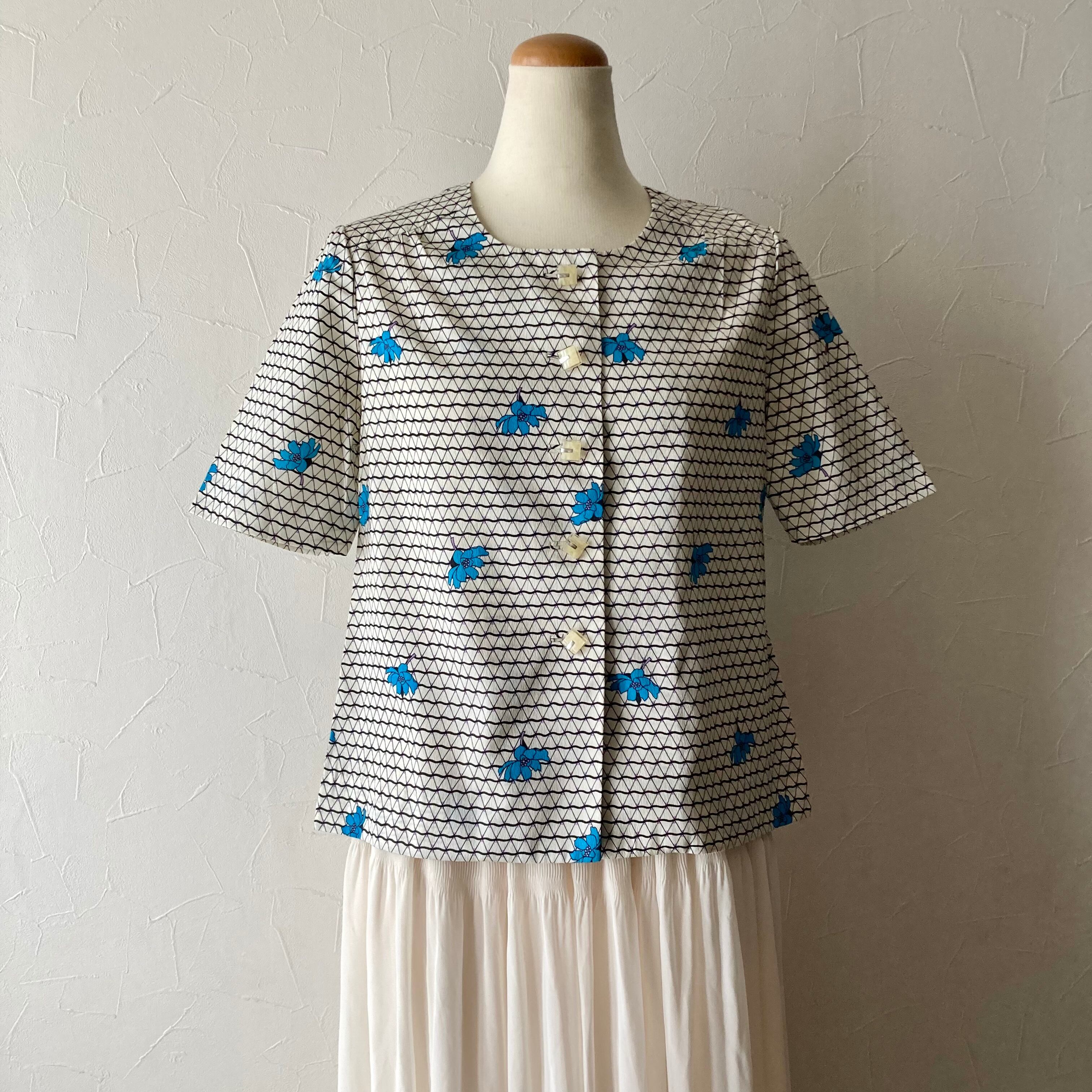 黒い線の模様にブルーのお花が可愛らしいノーカラーのブラウス◯ レトロな四角いボタンも可愛いです。どんな色でも合いそうですが、ボトムの色で色々な顔を見せてくれそうなブラウスです。