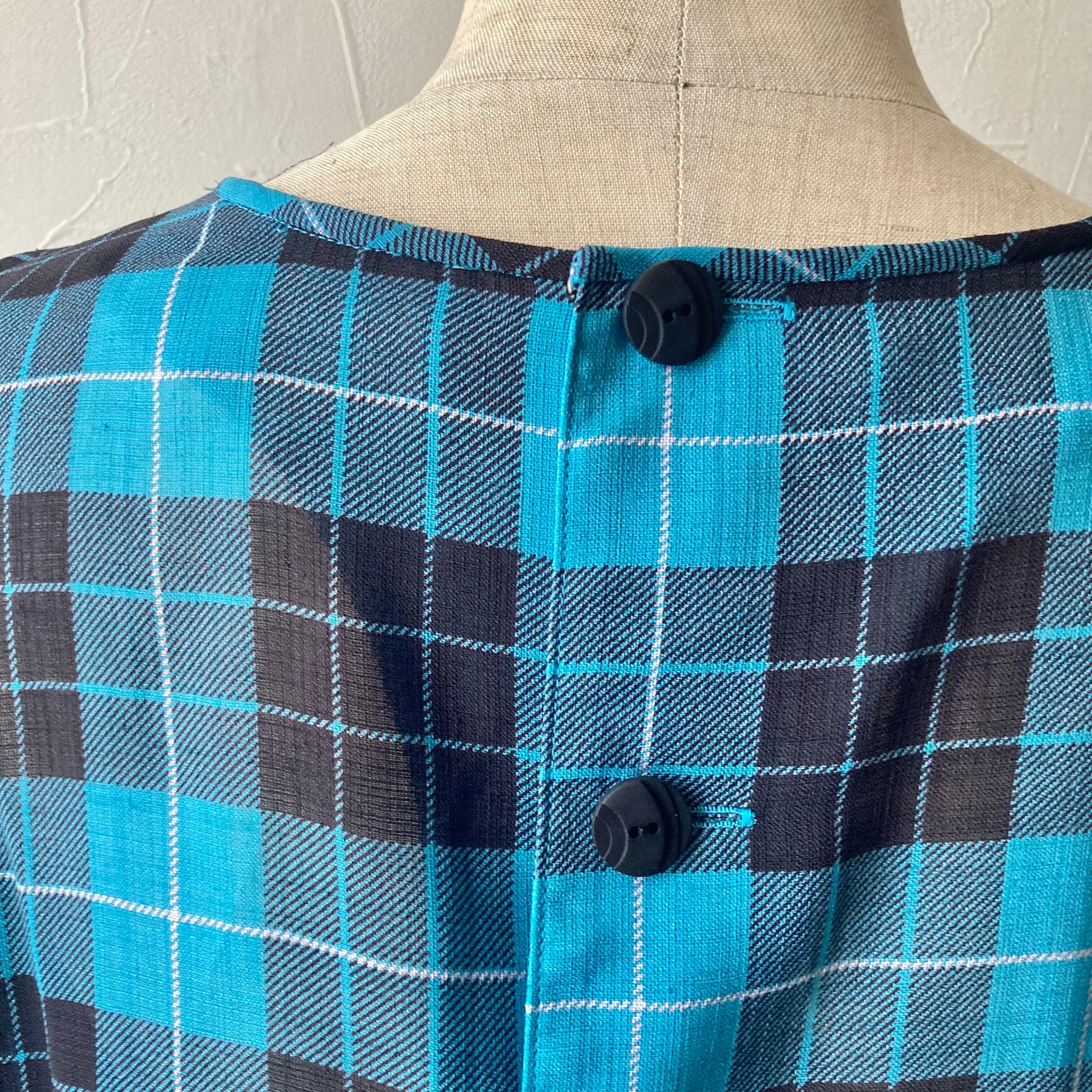可愛い水色と黒のタータンチェックの後ろボタンのトップス◯ パフスリーブとショートめの丈で可愛いシルエットになっています。