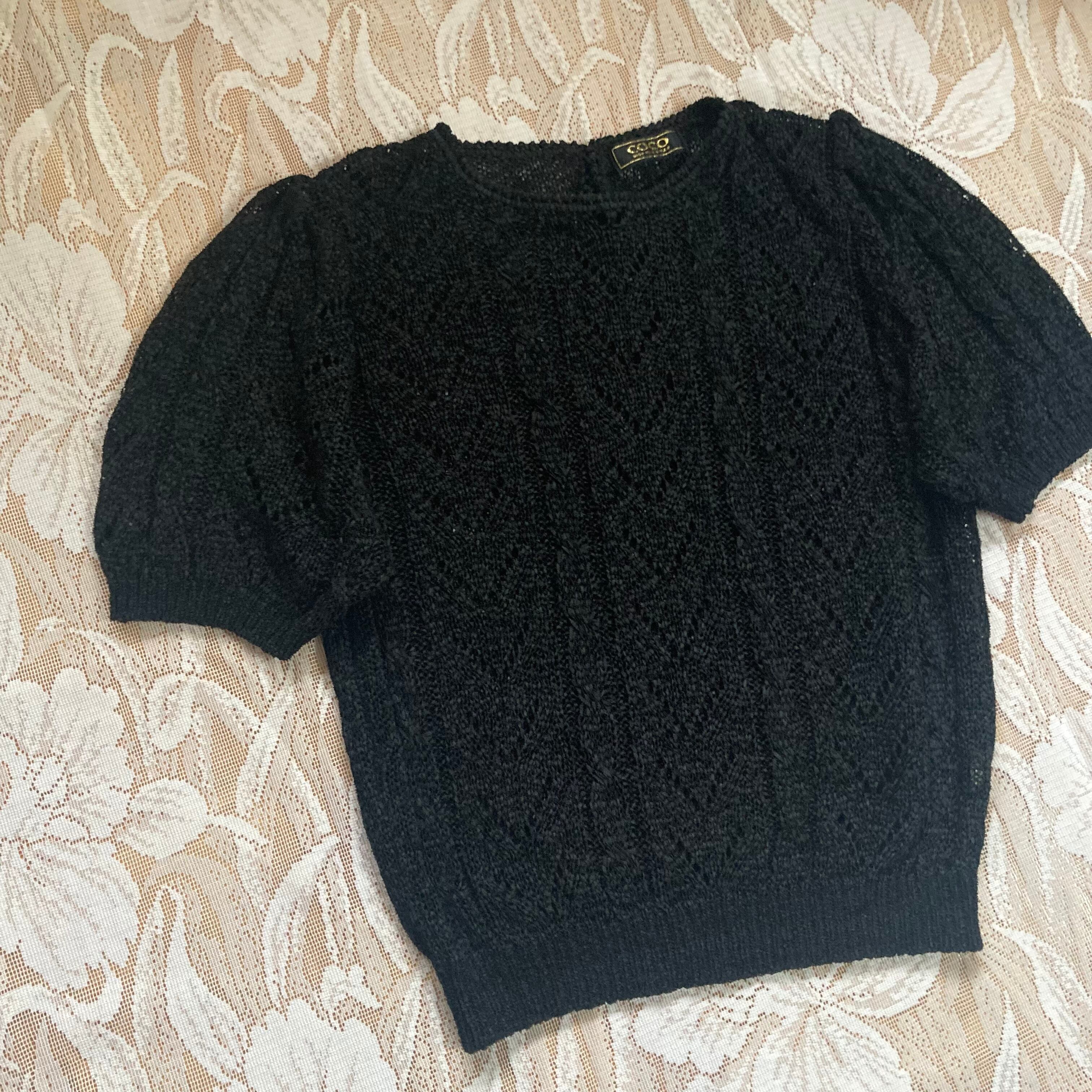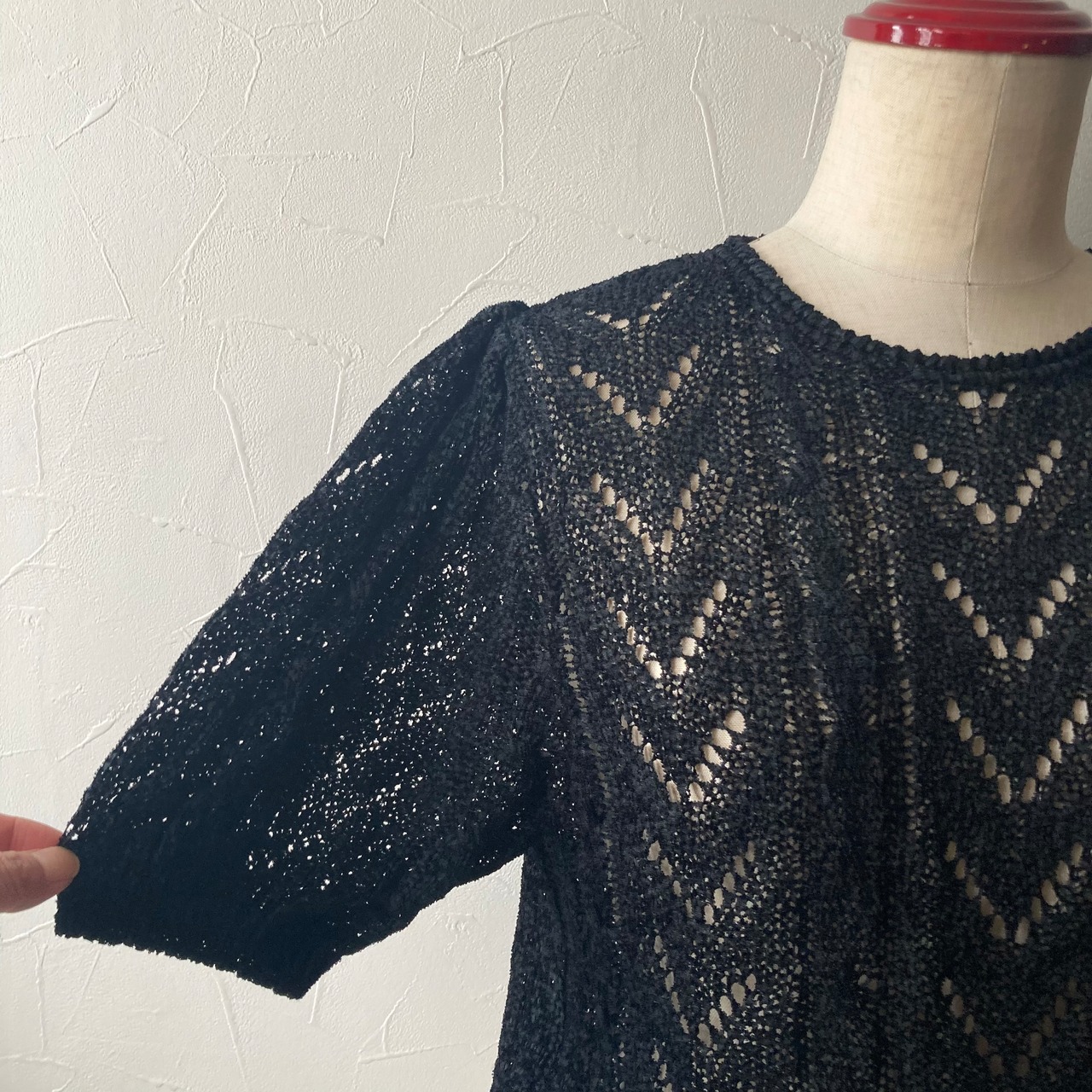 黒のサマーニット◯ 肩にはさりげないギャザーが入っていて少しふんわりしたシルエット。Vの柄の透け感が古着らしいデザインでステキです。