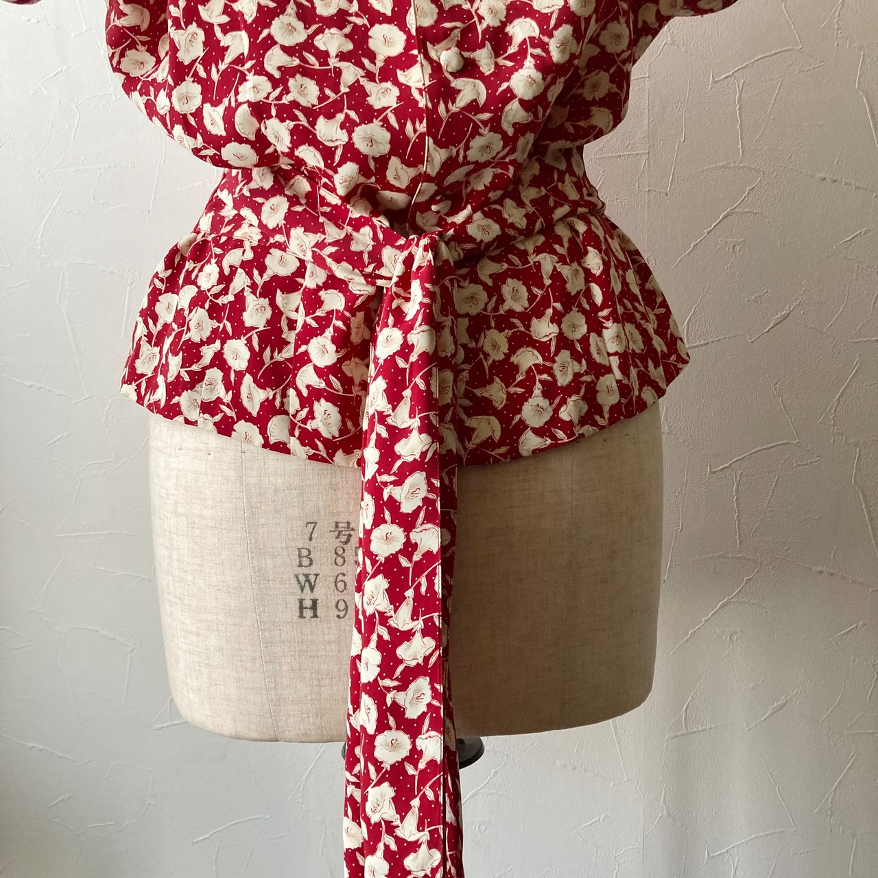 赤色に白い花模様と小さなドットがプリントされた後ろボタンのフレンチスリーブトップス◯ ウエスト部分は後ろにリボンを作るデザインでシルエットがきれいです。ボタンはくるみボタンになっていておしゃれです。