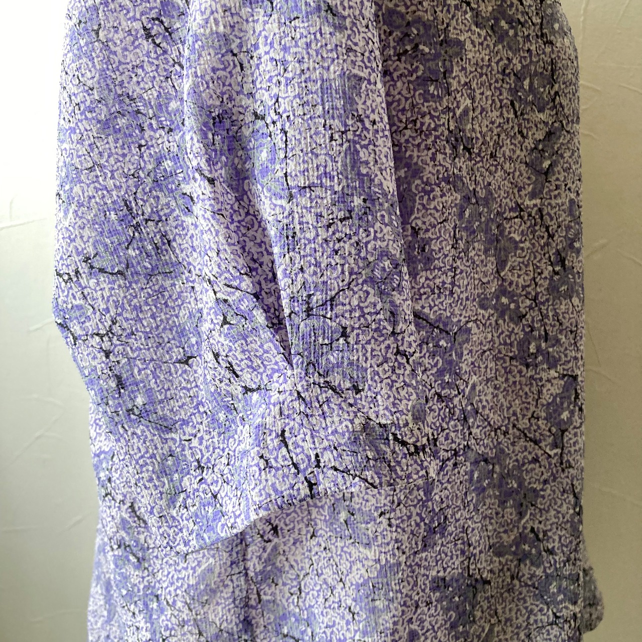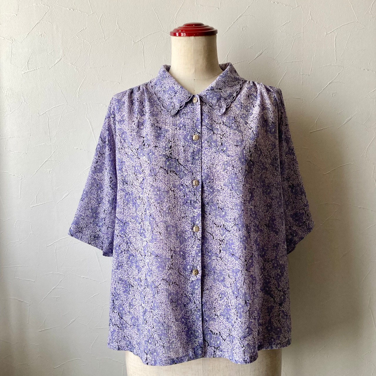 さりげないカットワーク刺繍、くすんだ色合い、袖先はタックが入った5部袖、昭和レトロな雰囲気の柄のブラウス◯ ざらっとした肌触りが夏らしく涼しげです。