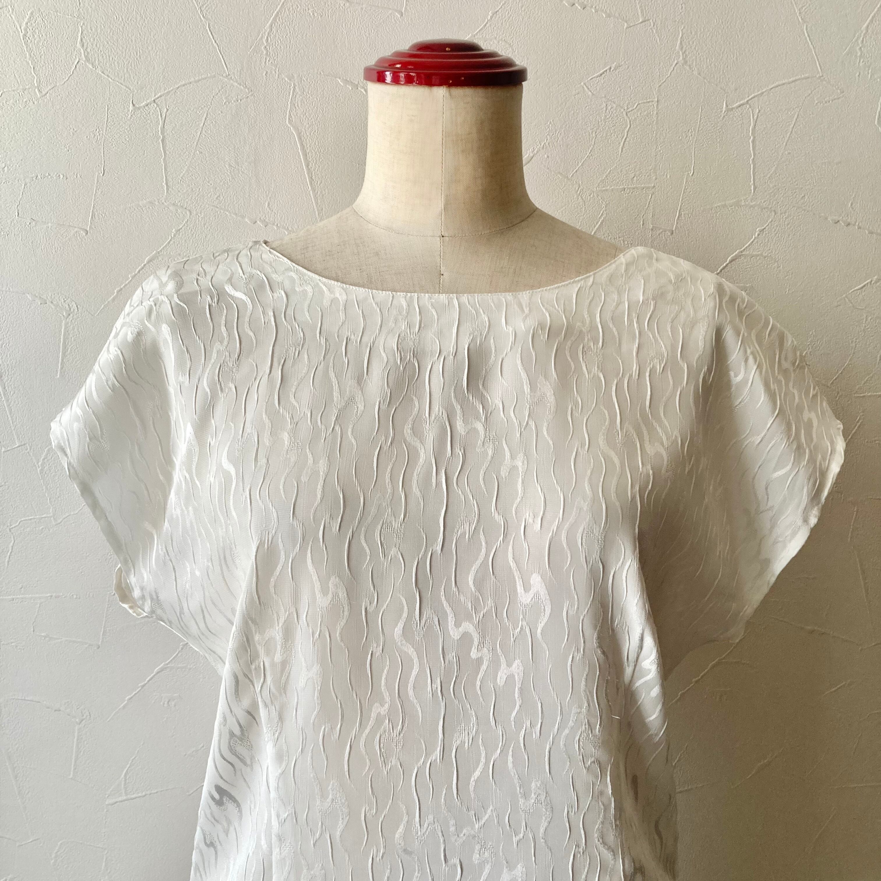 上品なホワイトカラーに光沢のある糸で模様が施された後ろボタンのブラウス◯