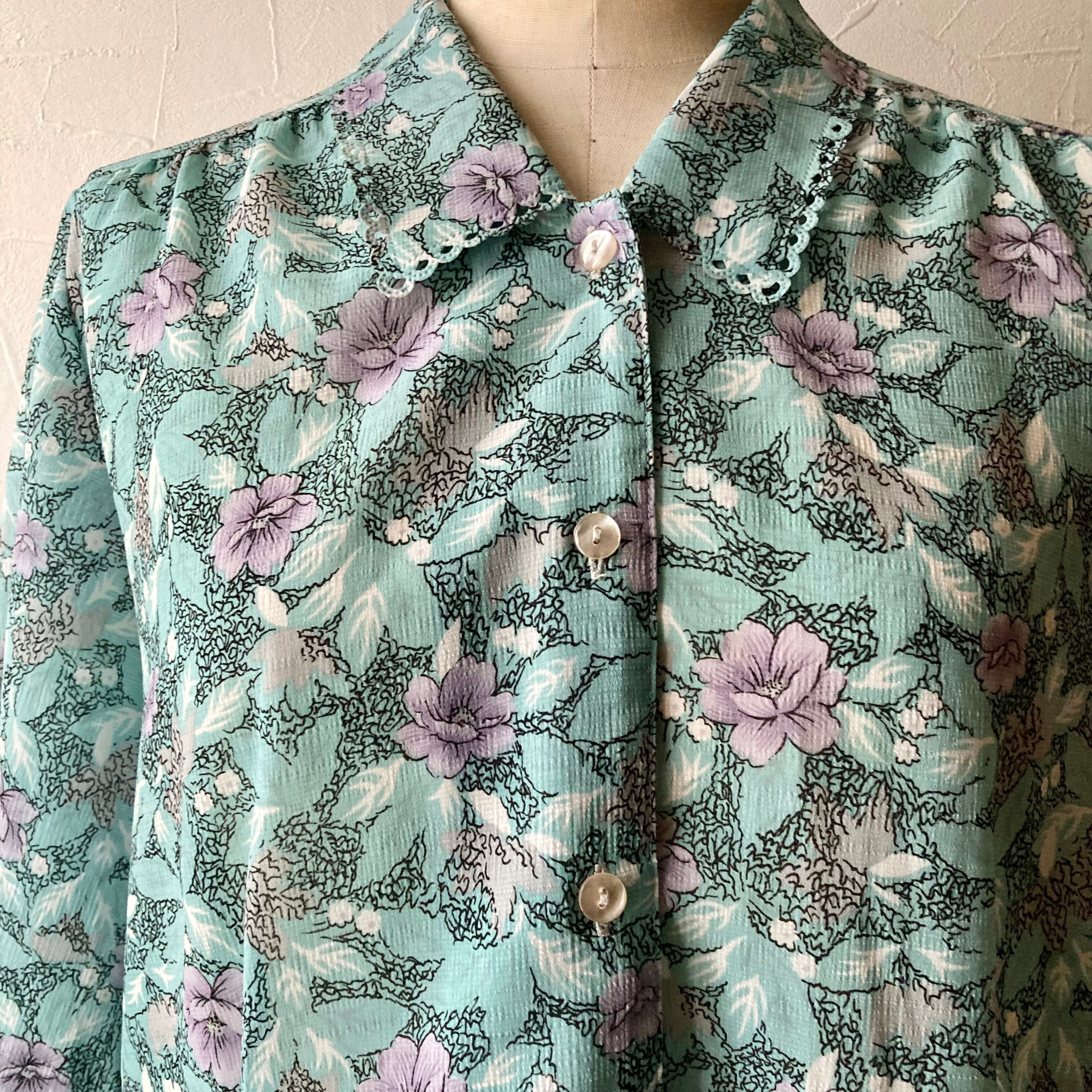 しぶめの色合いと花模様が古着らしいレトロブラウス◯ 襟はカットワークデザイン、六部袖くらいの丈感も可愛らしいです。