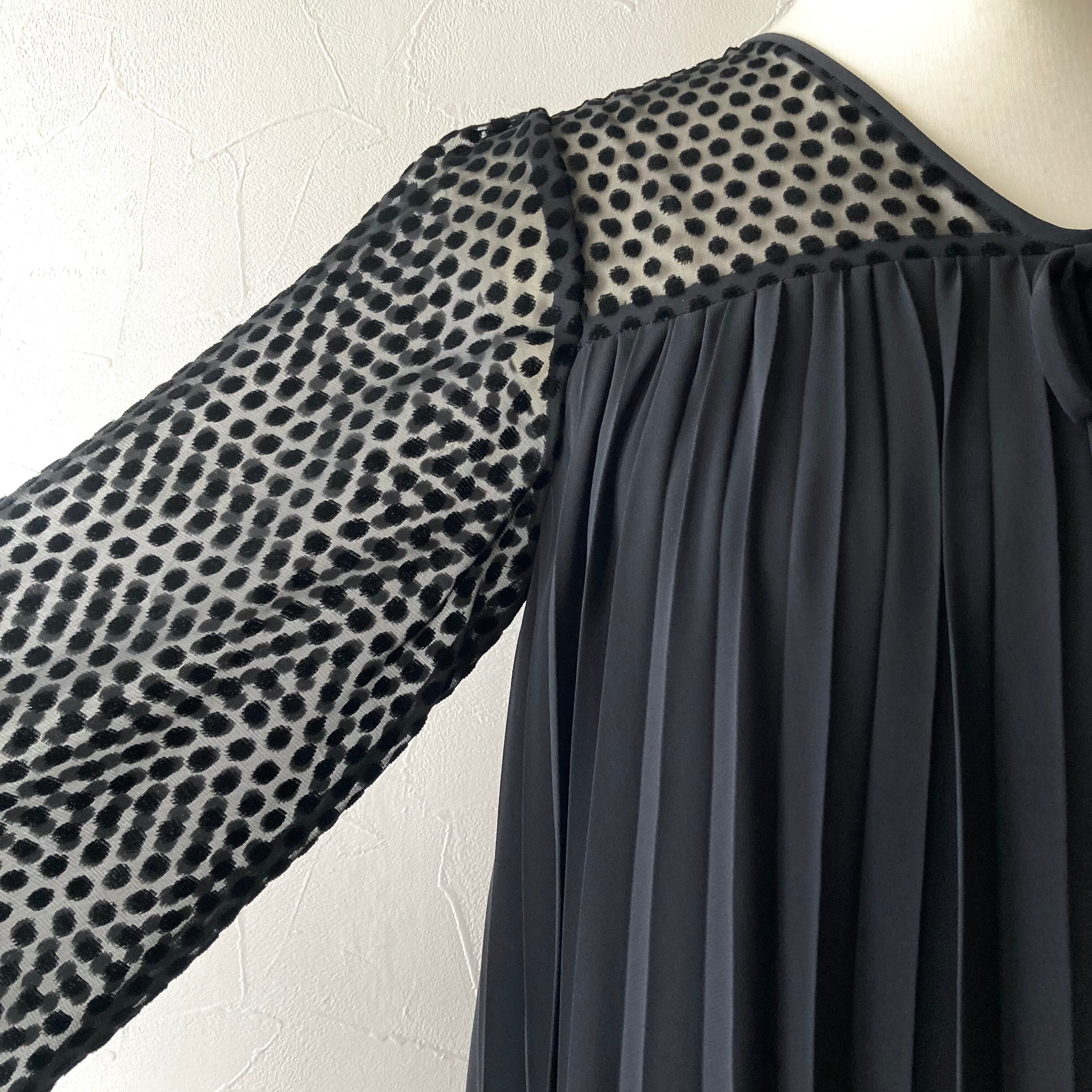 肩と袖はドット柄のシアー素材、胸からスカート はプリーツのデザインになっているレトロなワンピース◯ 着ると袖はふわりとプリーツがさりげなく広がるとてもステキなシルエットです。ドットの透け感がとにかく可愛い一枚です。