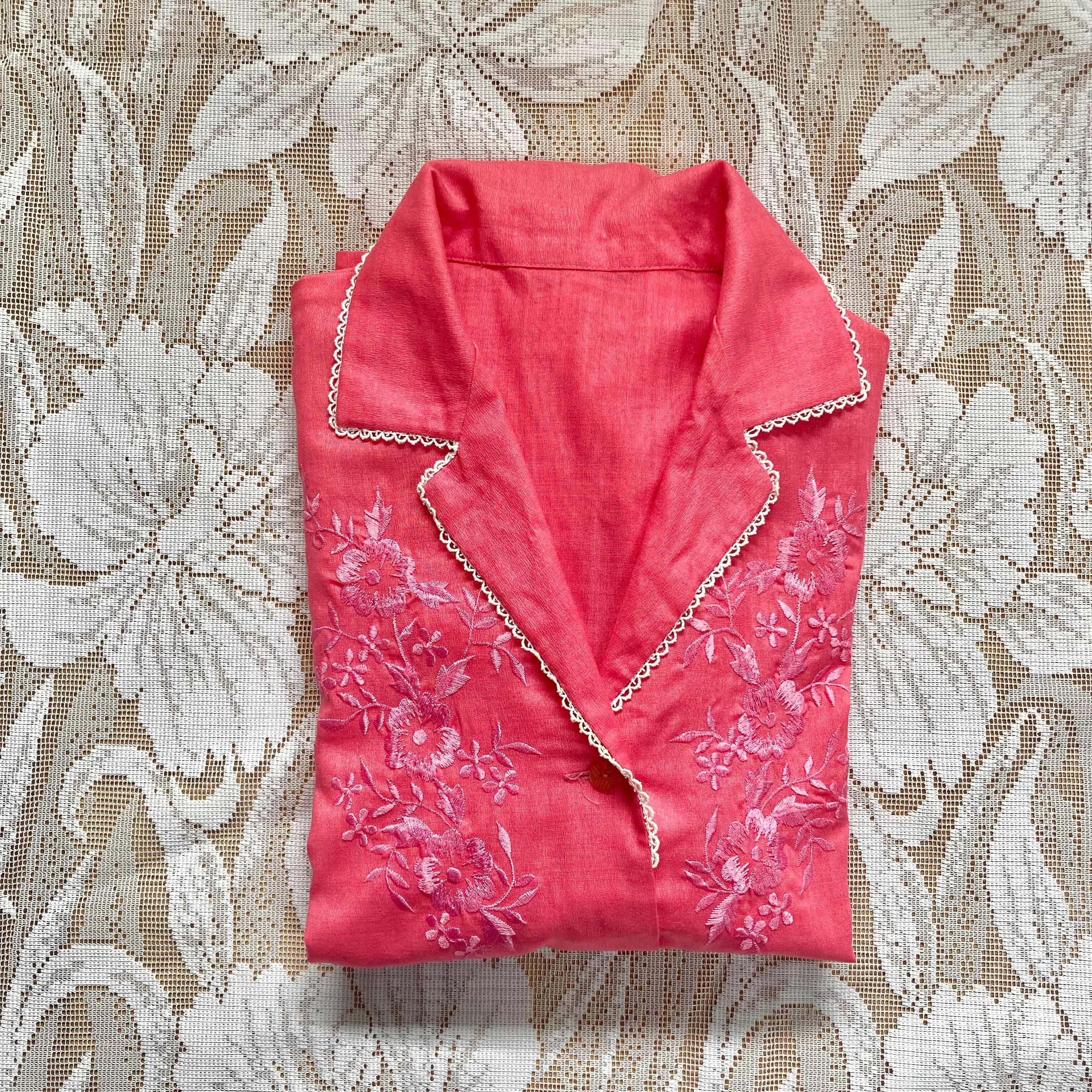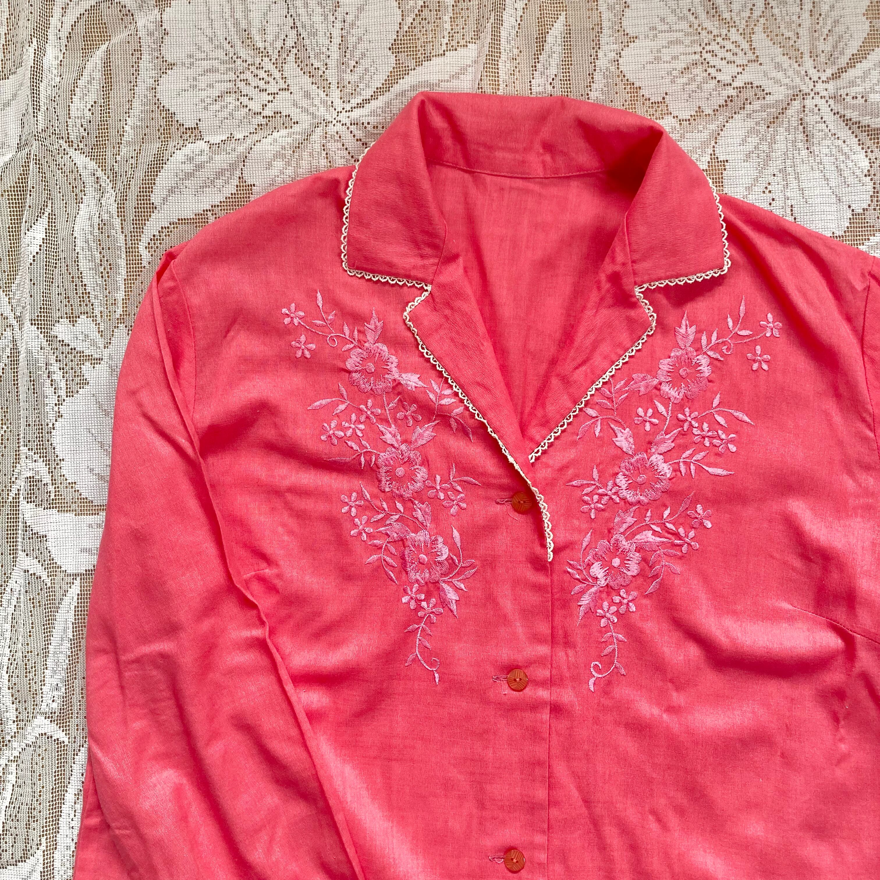 ピンク色に襟には白いレース、同系色の花刺繍が施さた可愛らしいブラウス◯ 品質タグはないですが、おそらくコットン素材。濃いデニムと合わせて履きたいレトロな一枚です。