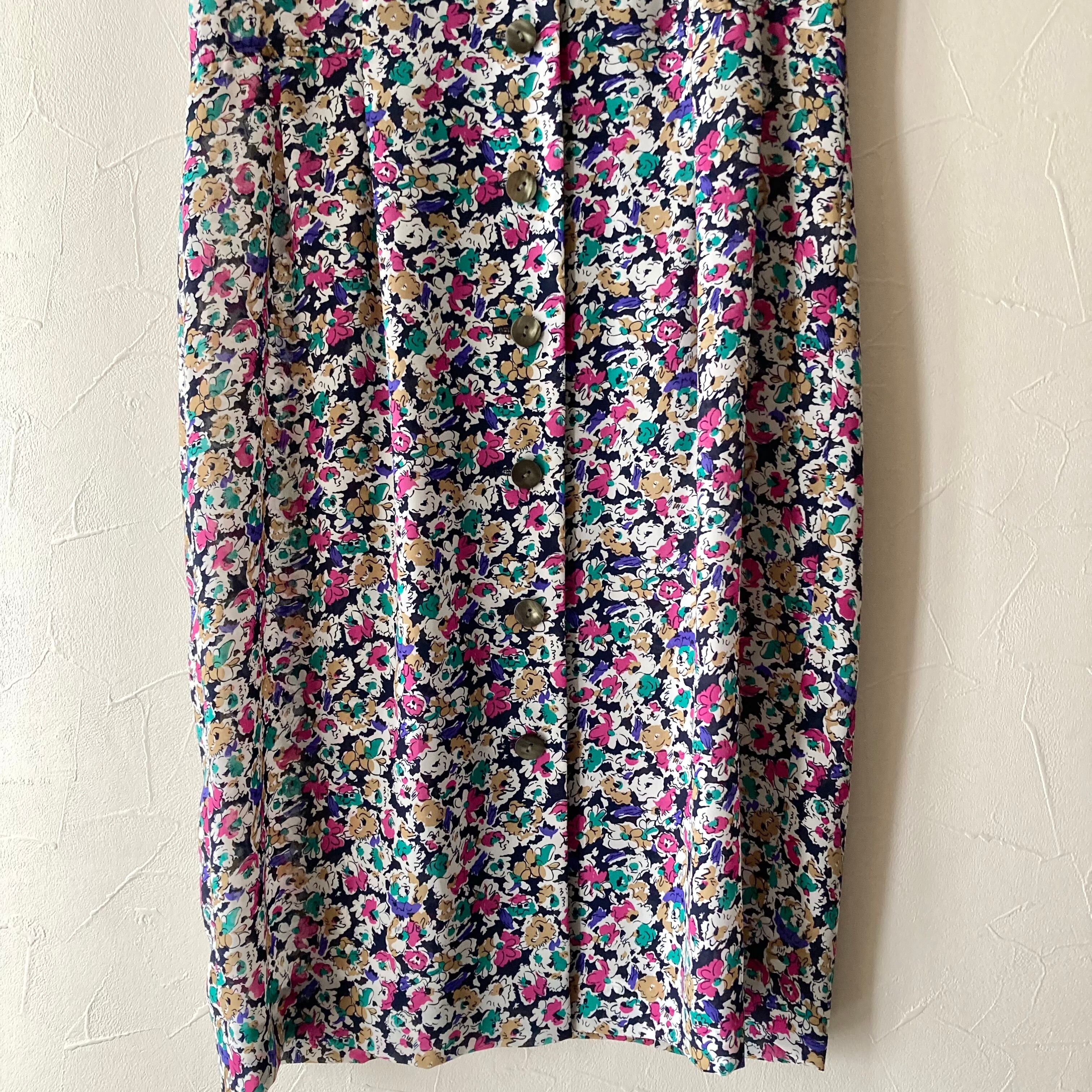 程よくカラフルな花柄のワンピース◯ スカート部分にはタックが入って緩やかなタイトラインですとんとして可愛いです。下の方のボタンを外して羽織ったり、下にパンツを合わせると可愛いです。古着らしいデザインがコーデを楽しくしてくれます♡
