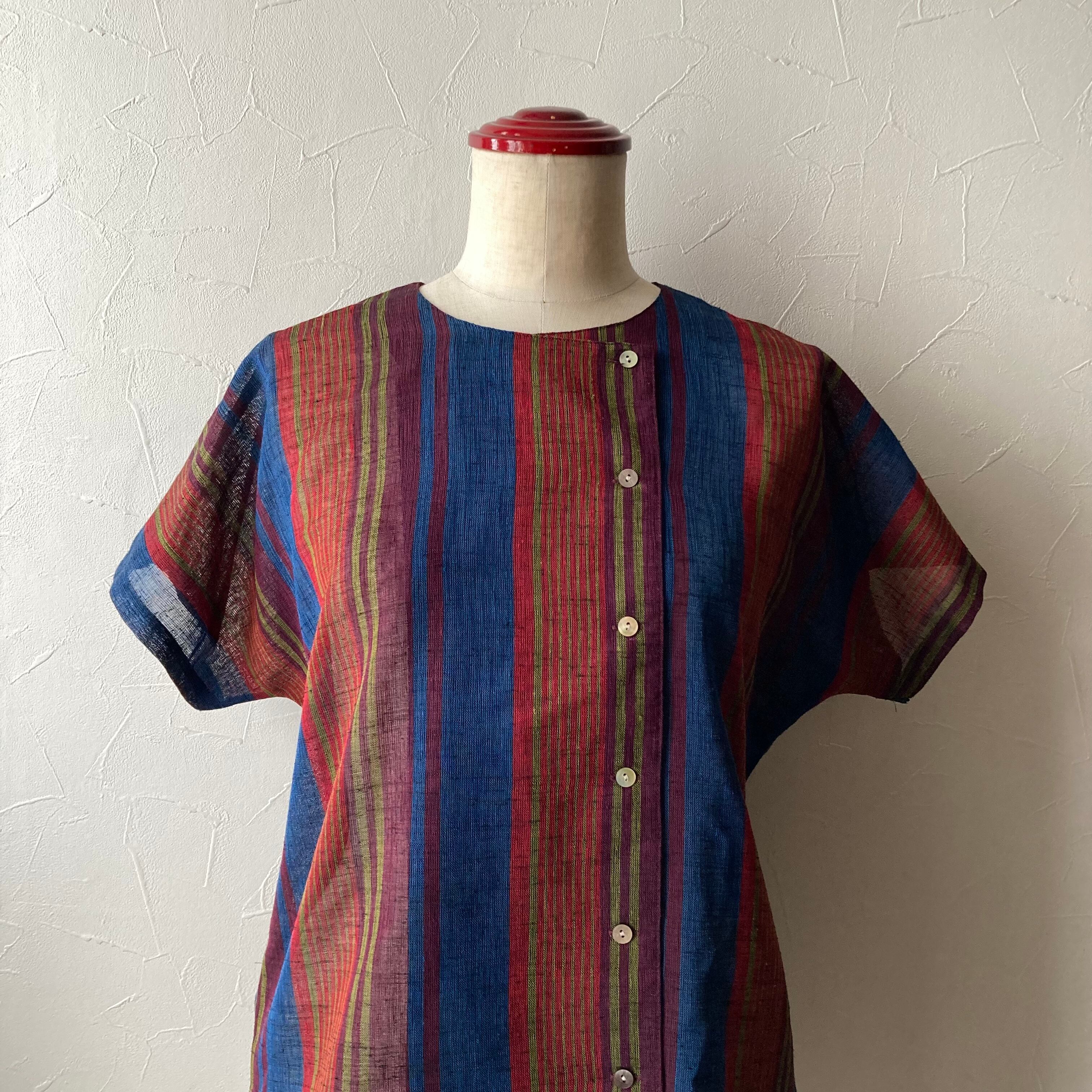 涼しげなざらっとした肌触りのストライプトップス◯ 渋めの色合いでテロテロパンツやデニムやワイドパンツなど合わせやすいサマーな一枚です。