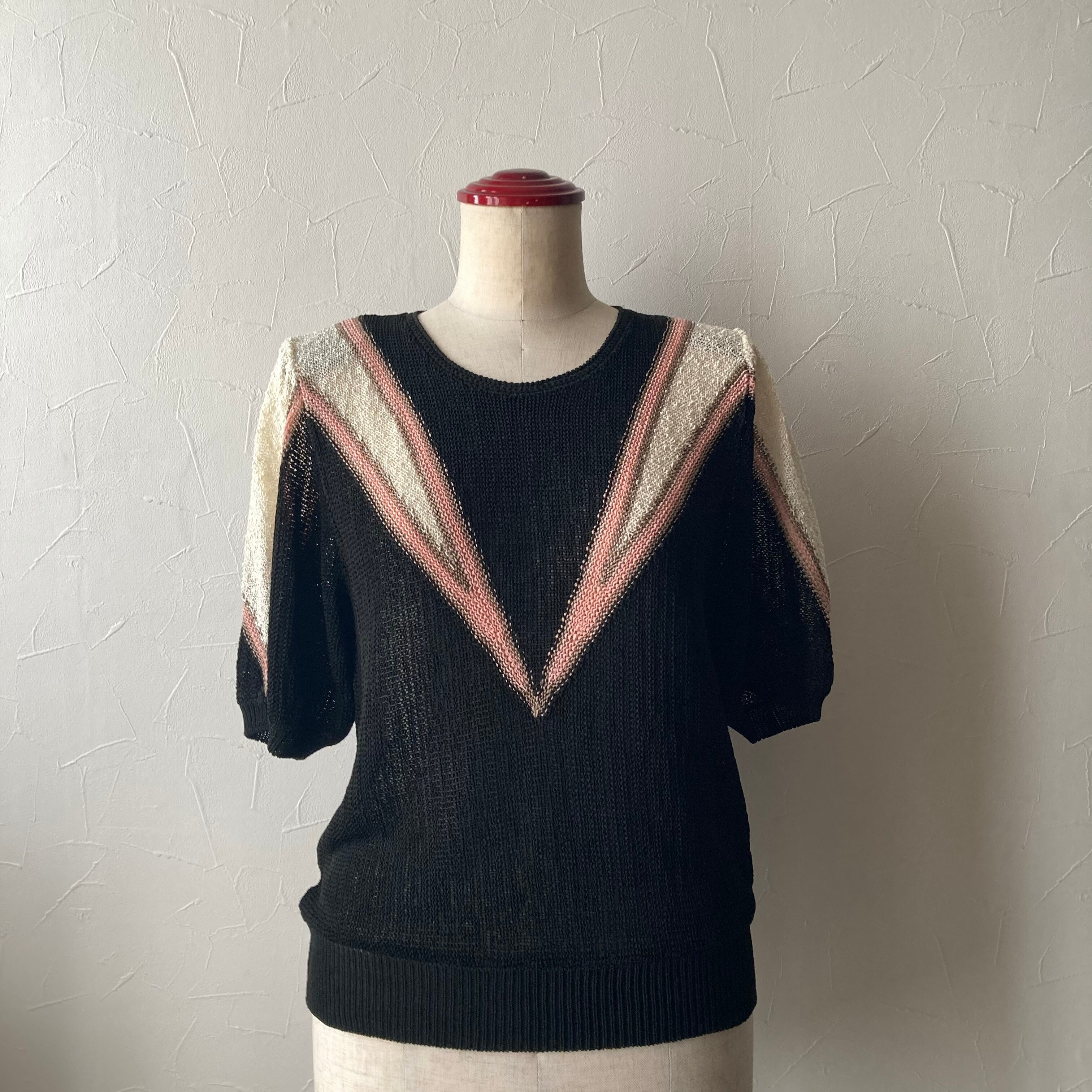 黒地に白とサーモンピンクのラインが可愛いサマーニット◯ ふんわりとした袖も可愛いです。肩パッドは付いたままですので、気になる方は取ってくださいね。