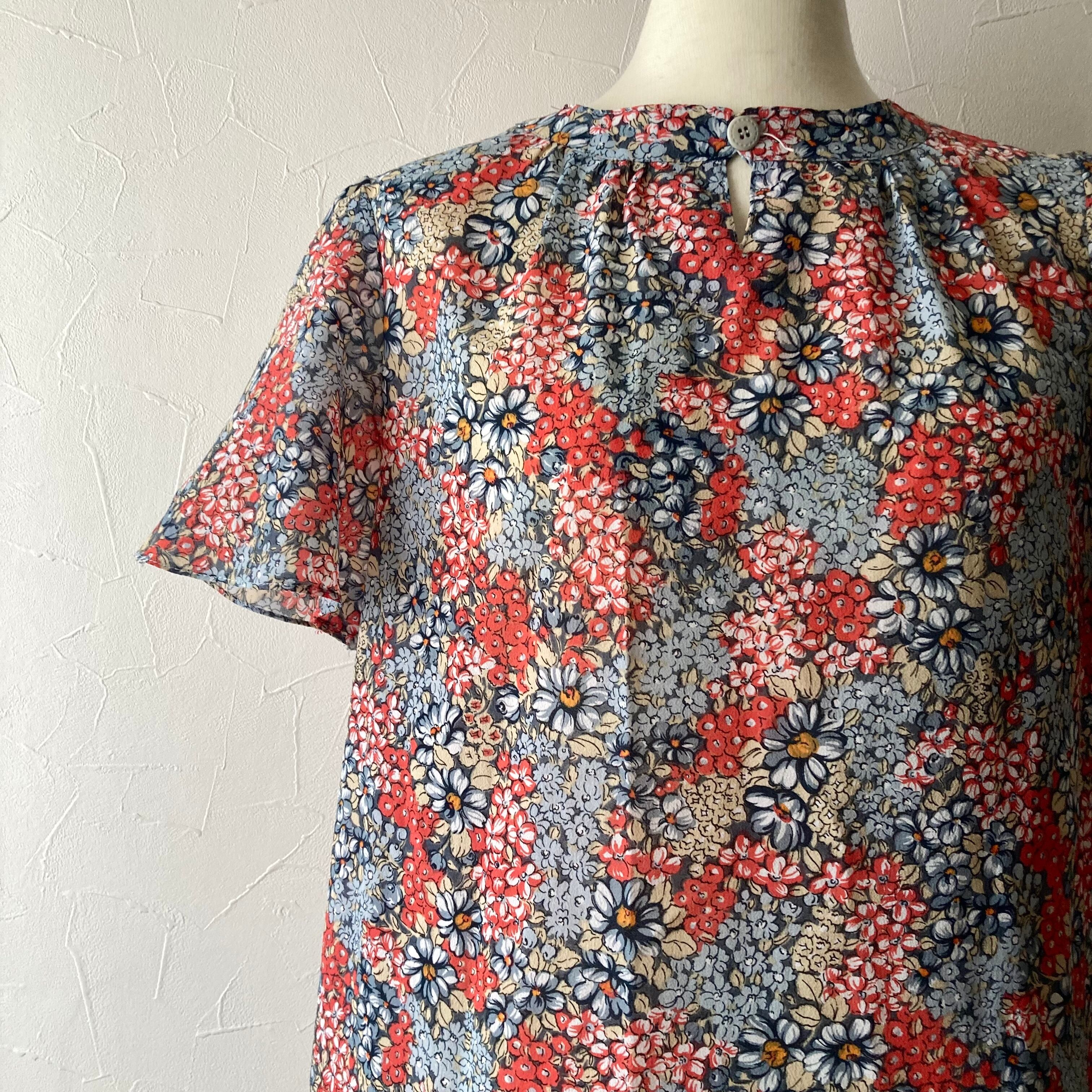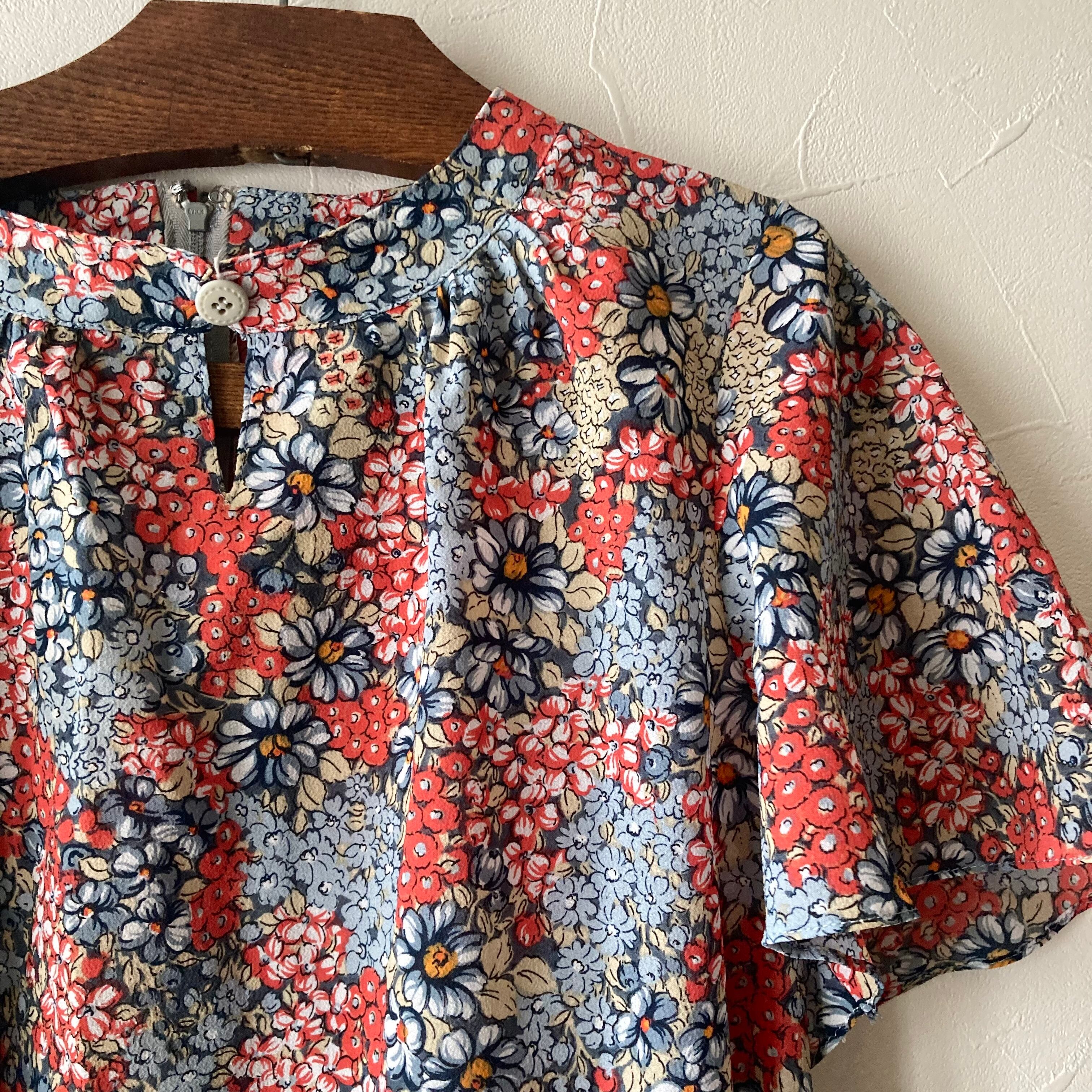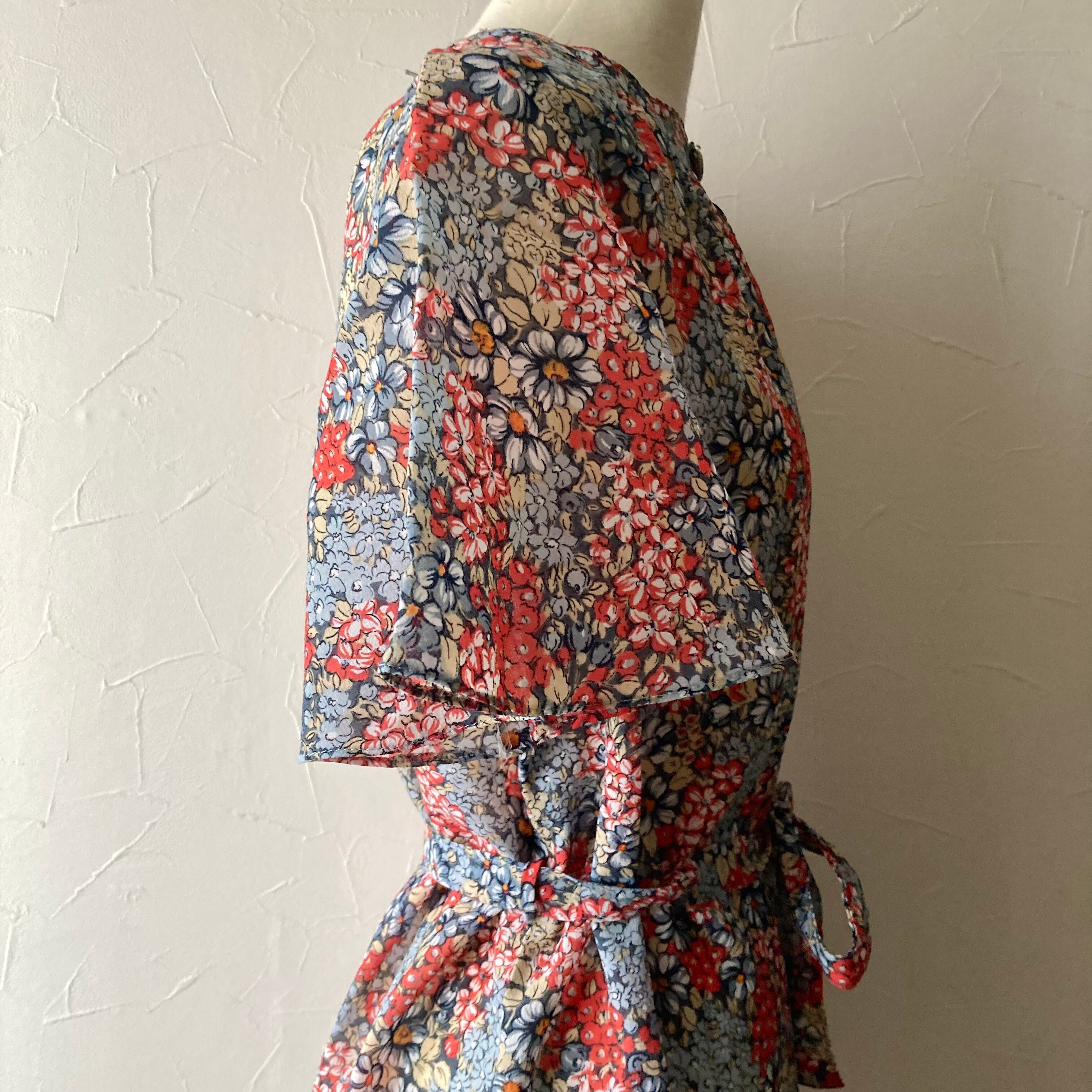 レトロな花模様にフレアスリーブと紐のベルトが可愛いワンピース◯ デニムやカラーパンツと合わせて可愛いヒッピーなコーデもステキ♡