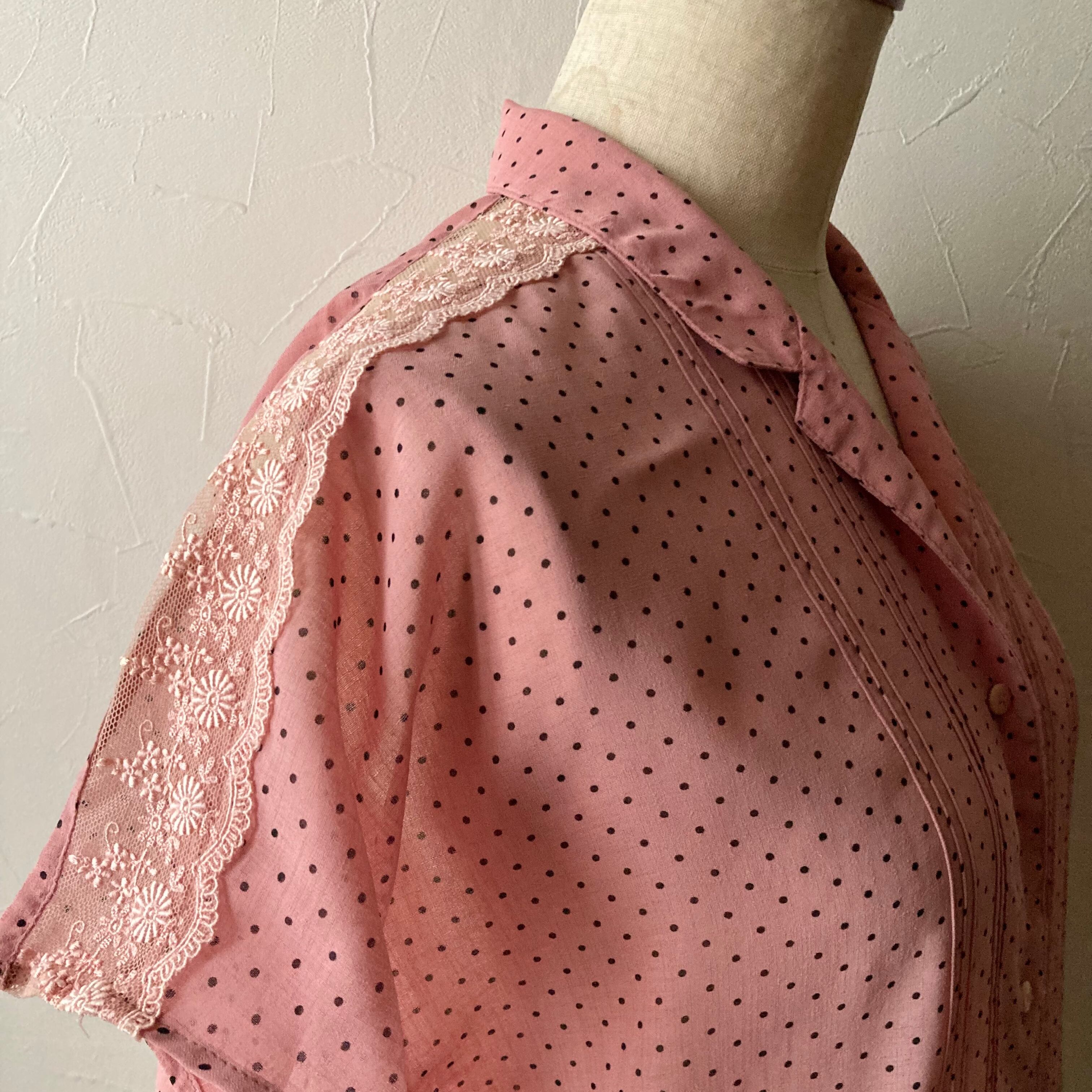 くすんだピンクに黒のドット、肩は透け感のあるレースのデザイン、ヴィンテージ感溢れる可愛いブラウスです。フレンチスリーブとドルマンのシルエットが全体的に綺麗なラインを作ってくれています。