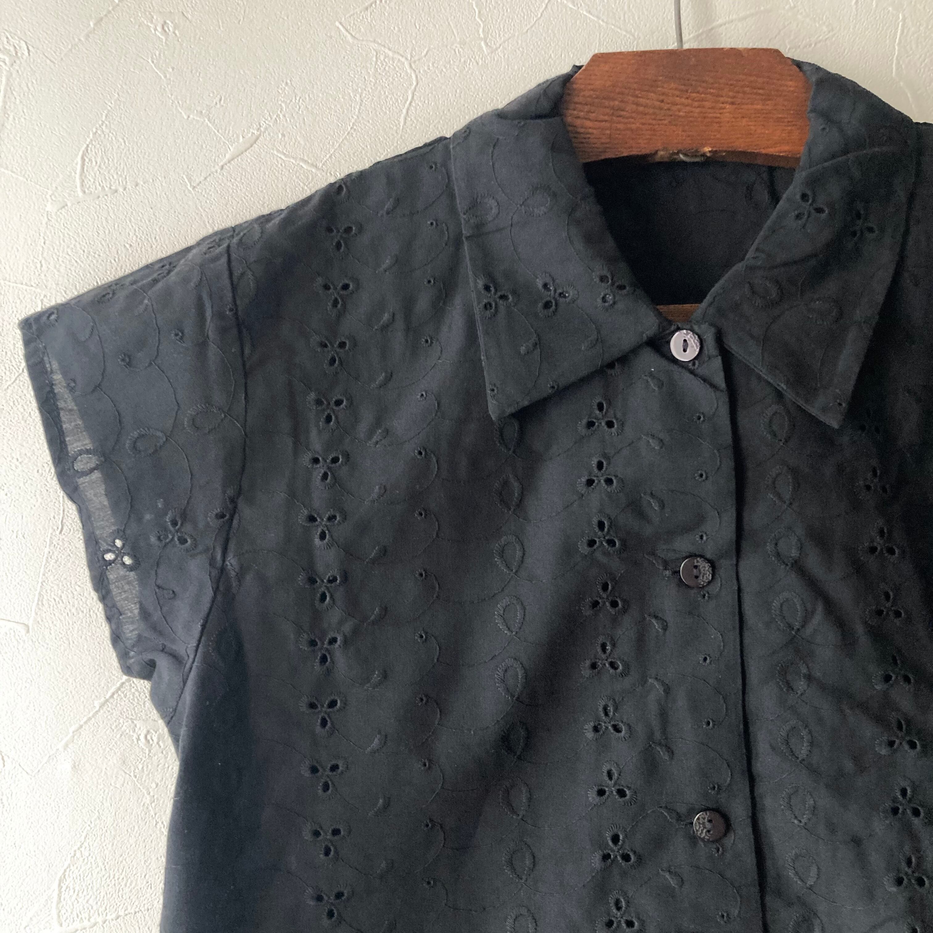 黒色のコットン混レース素材のブラウス◯ カットワークが可愛く涼しげです。
