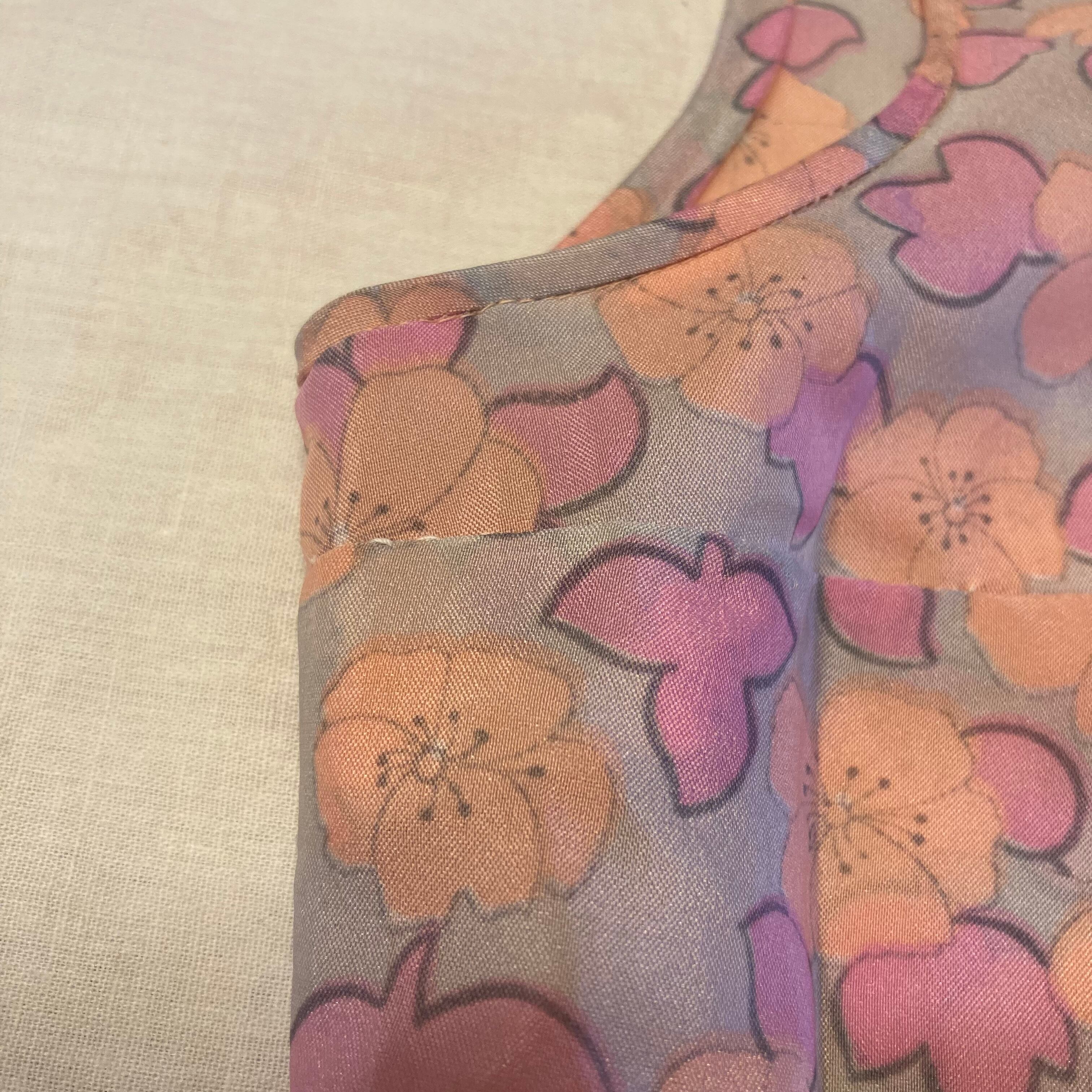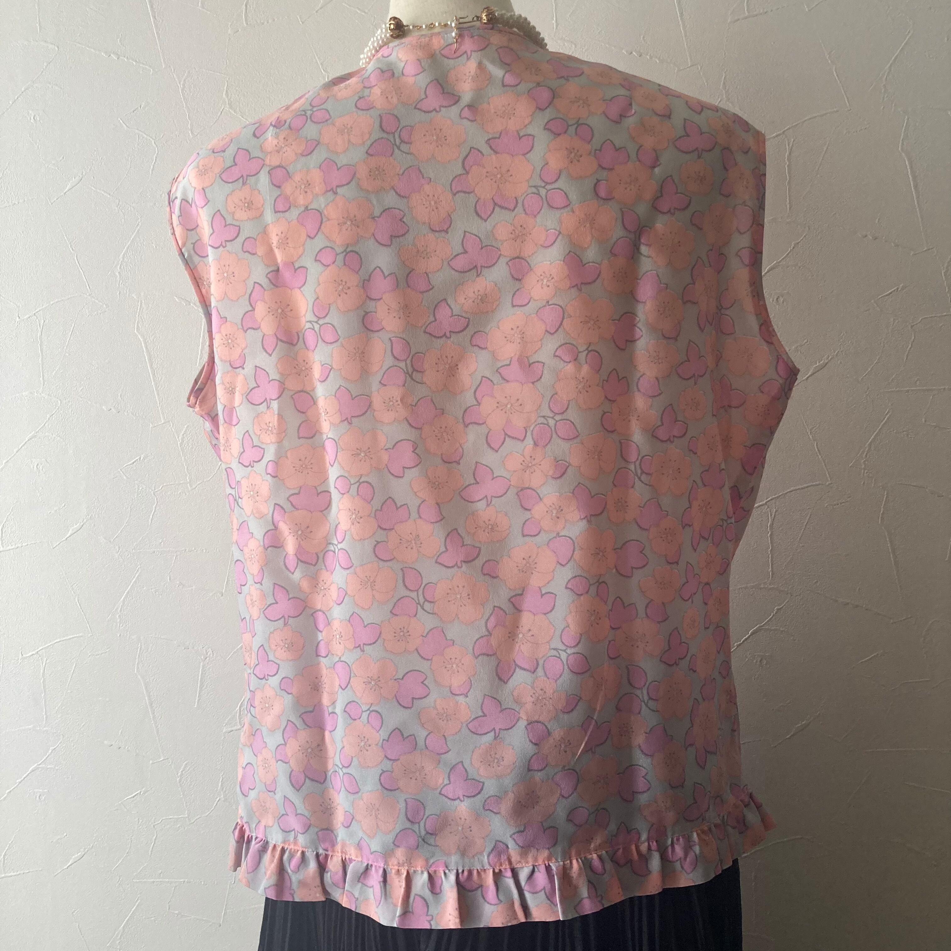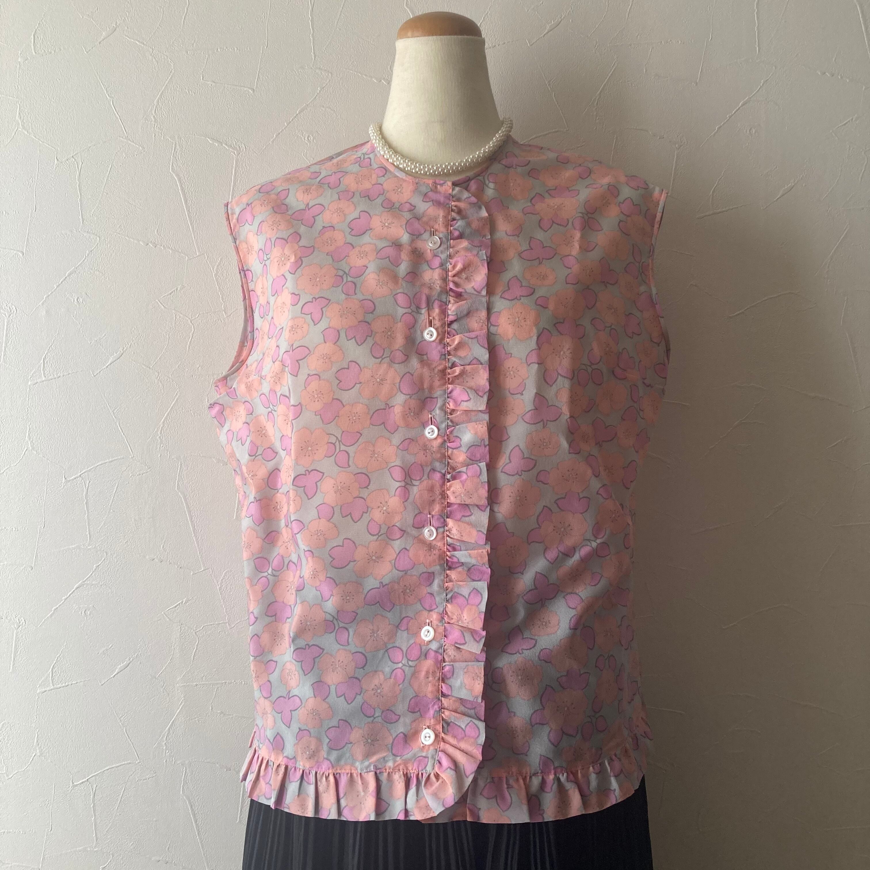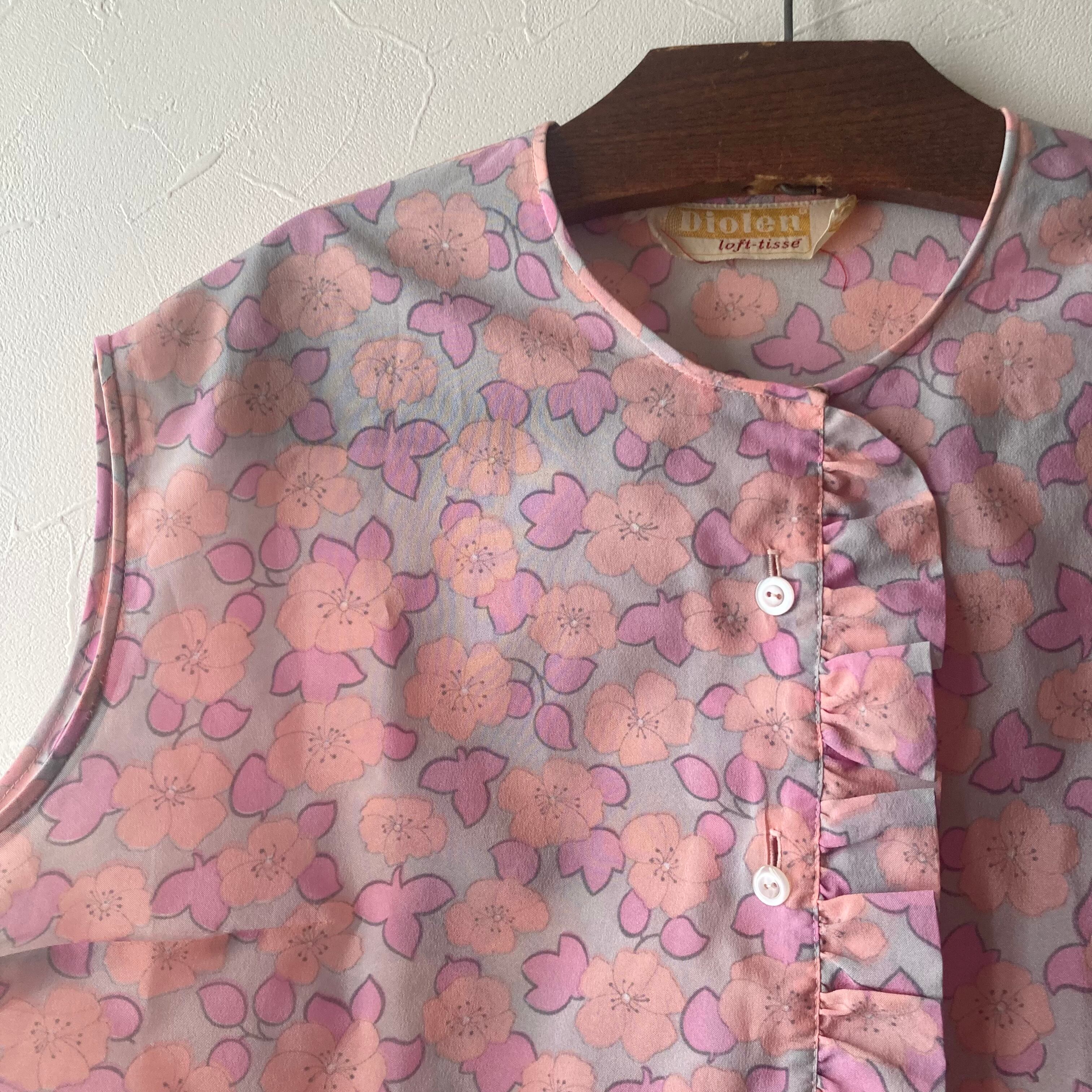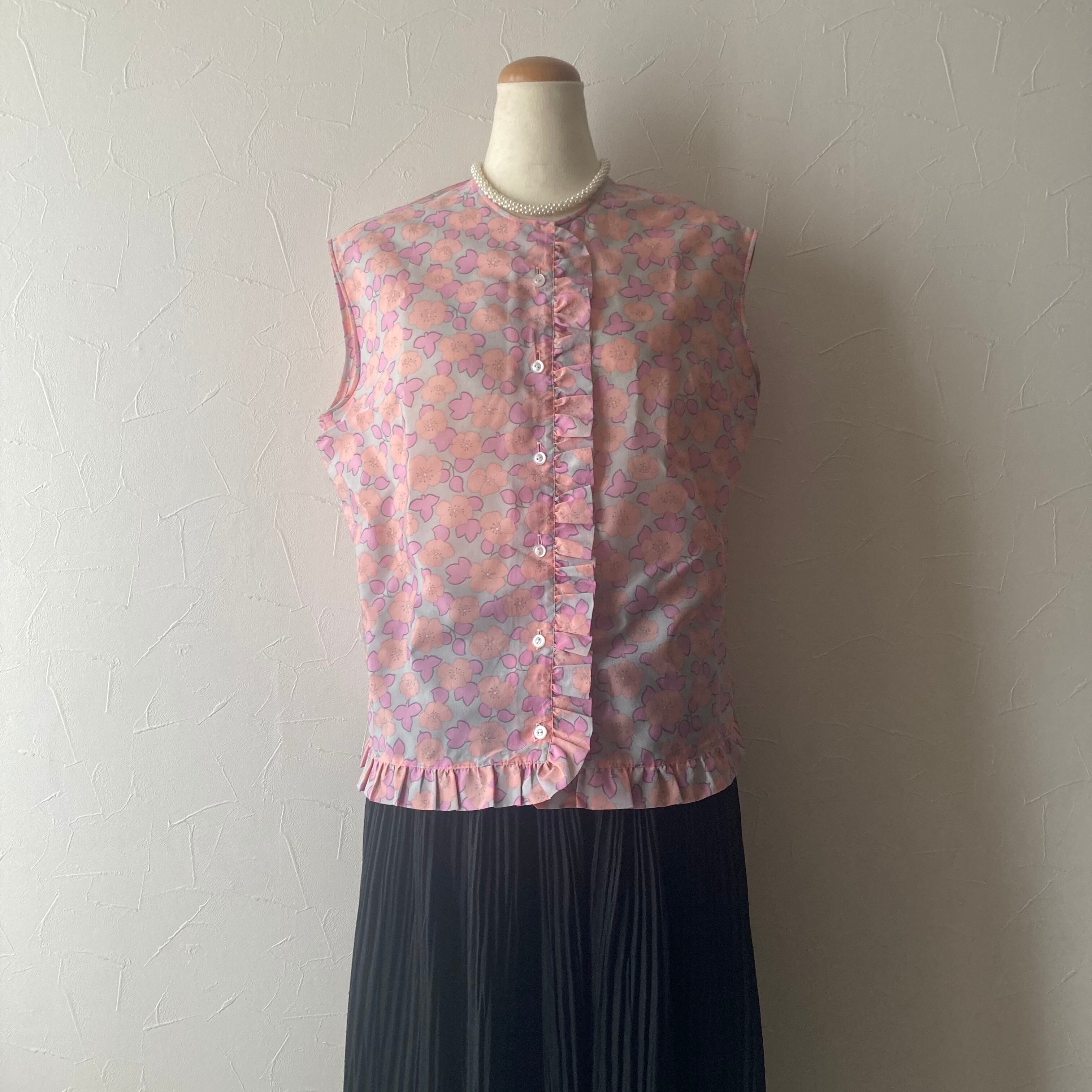 淡い色合いのお花プリントの60sなノースリーブトップス◯ さりげないフリル使いも可愛いポイントになっていて、タイトなパンツにパンプスと合わせたり、古着らしいデザインなので何のボトムをもってきても可愛くなっちゃいそうです♡