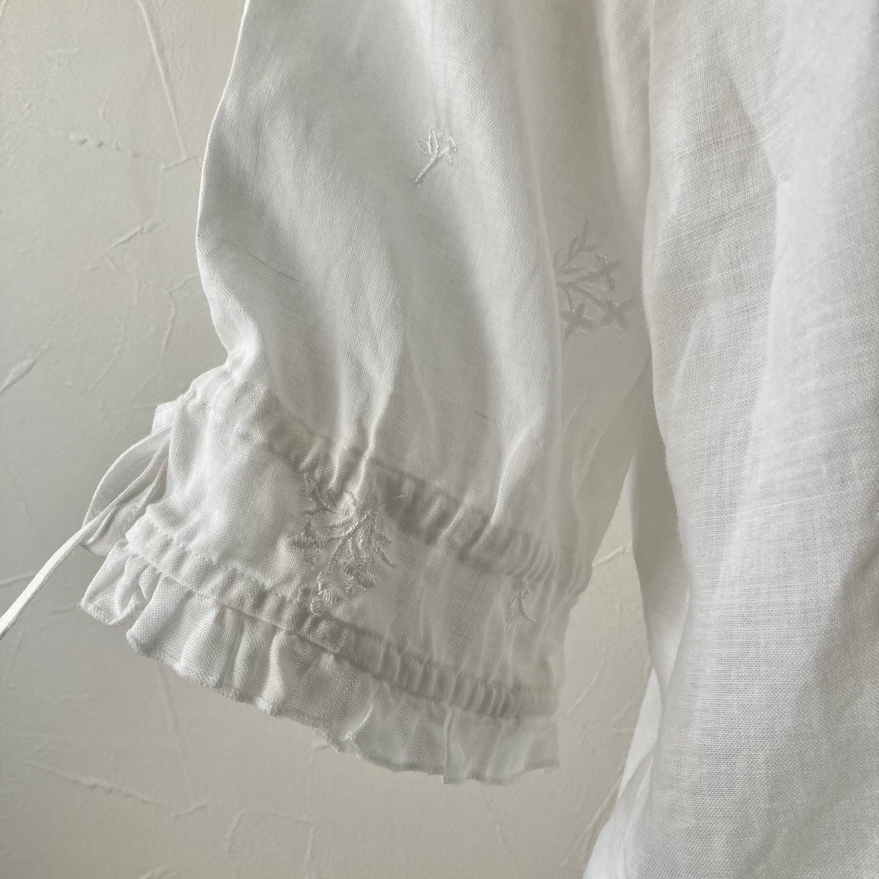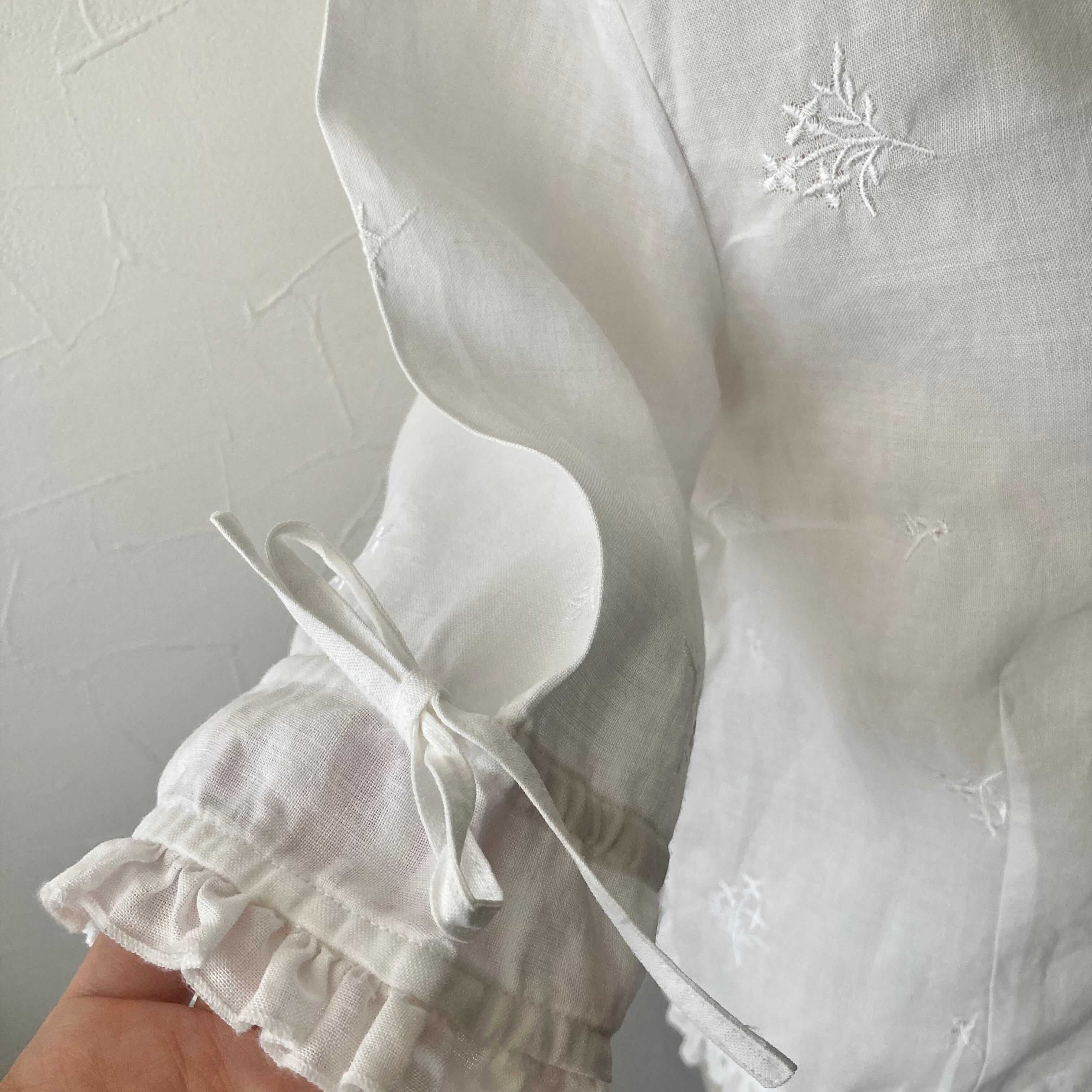爽やかな麻素材のホワイトカラーにボタニカルな刺繍と袖にはリボンが付いたデザインも素敵なブラウス◯ 袖のリボンは絞って調整できます。