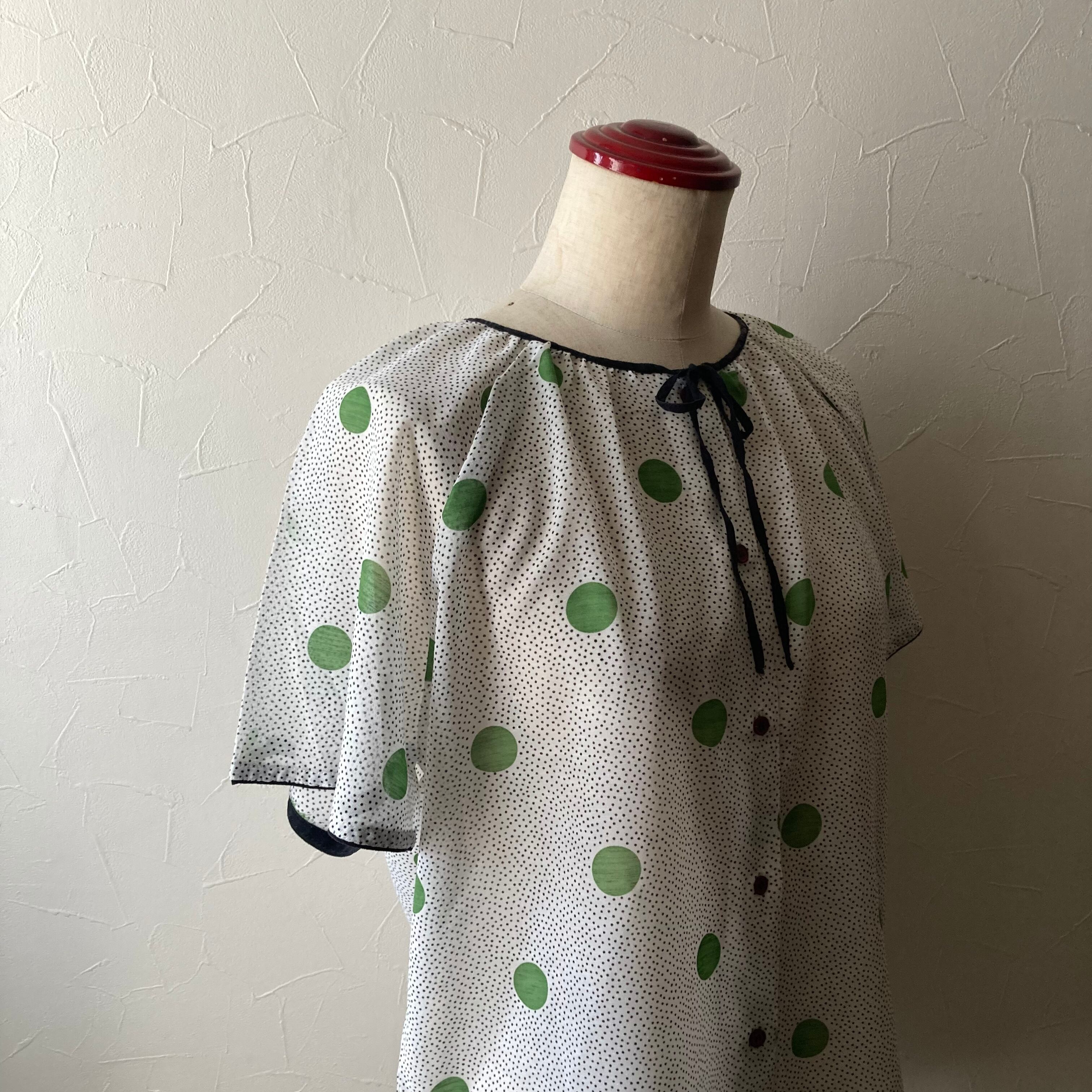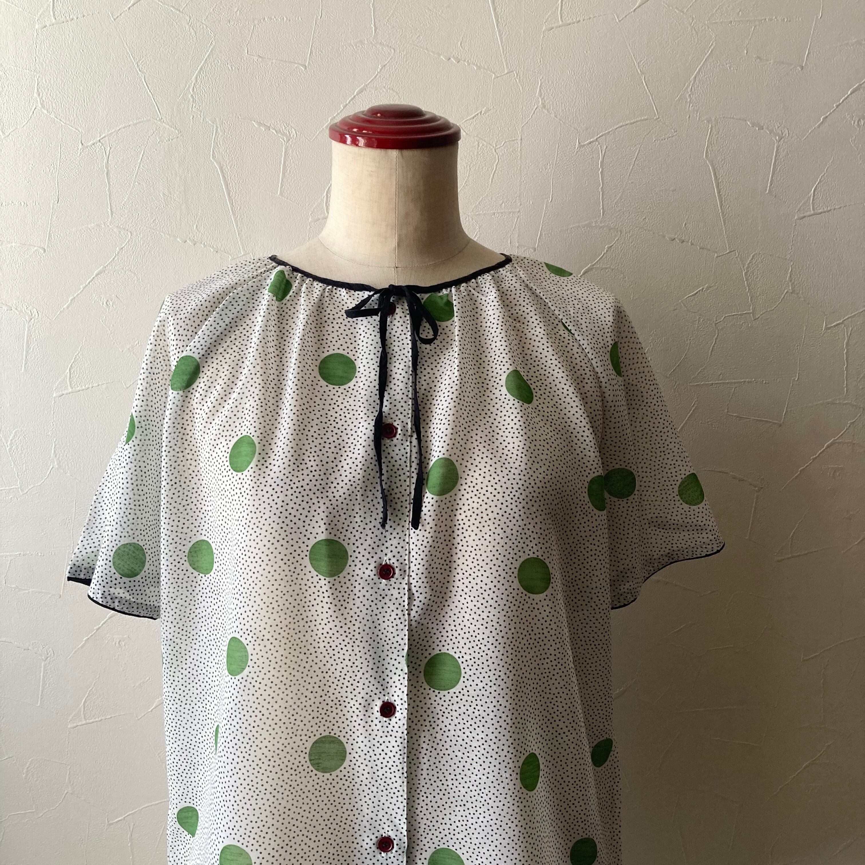 黒い小さな点に大きめな緑のドット柄のフレアスリーブブラウスです。細いリボンも可愛らしいです。