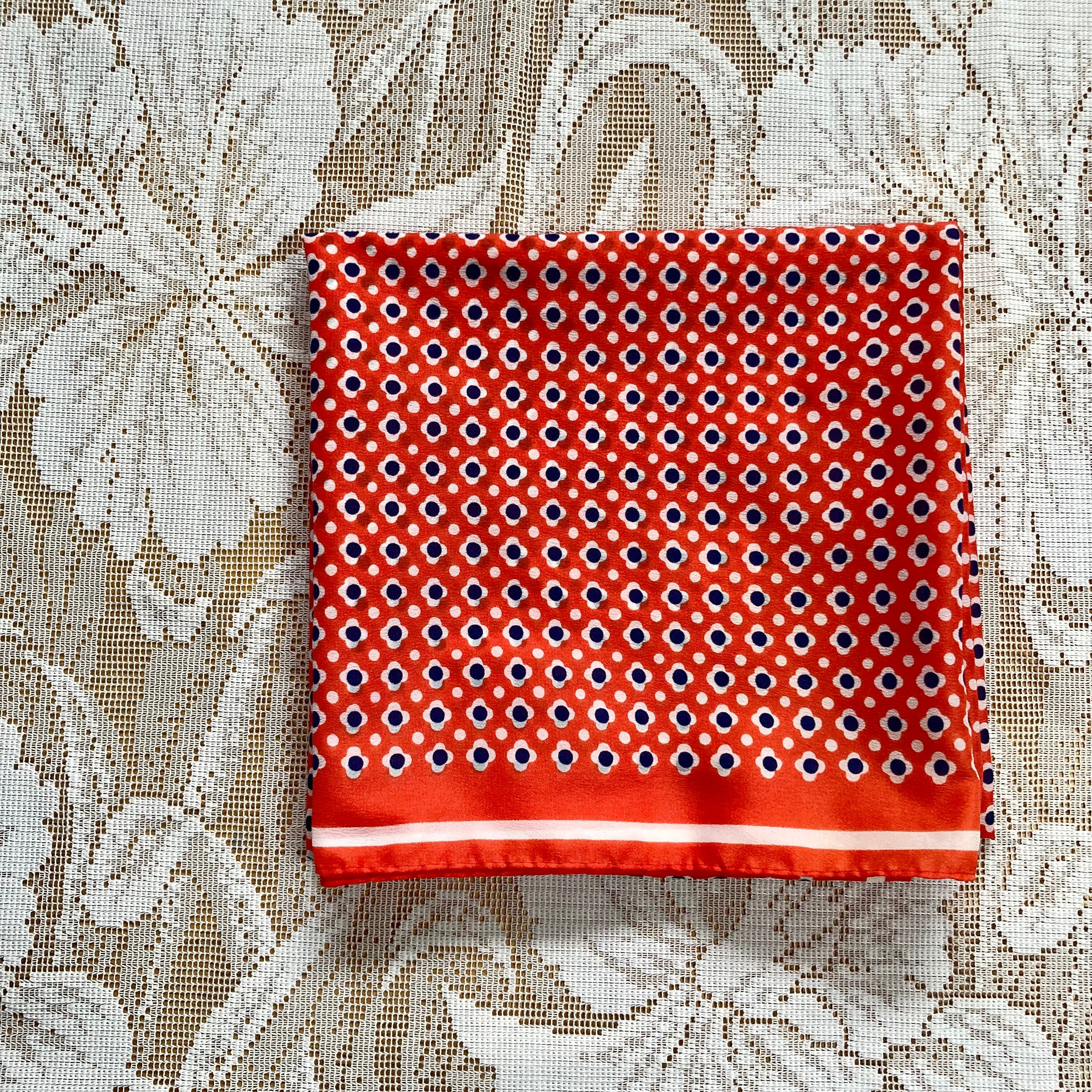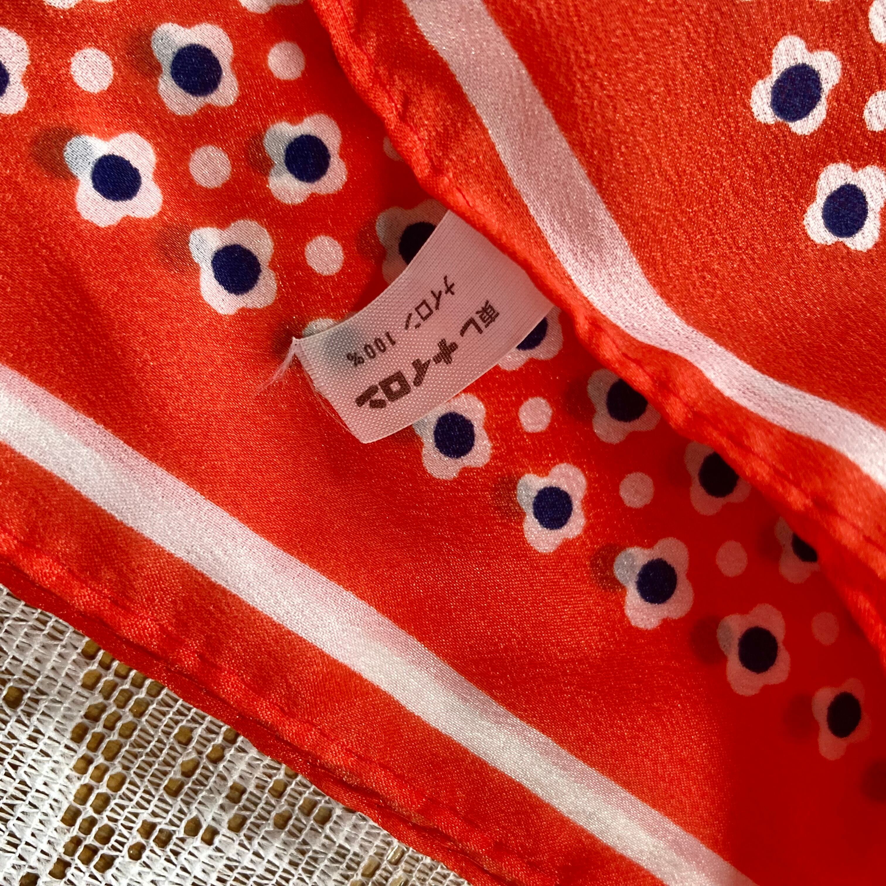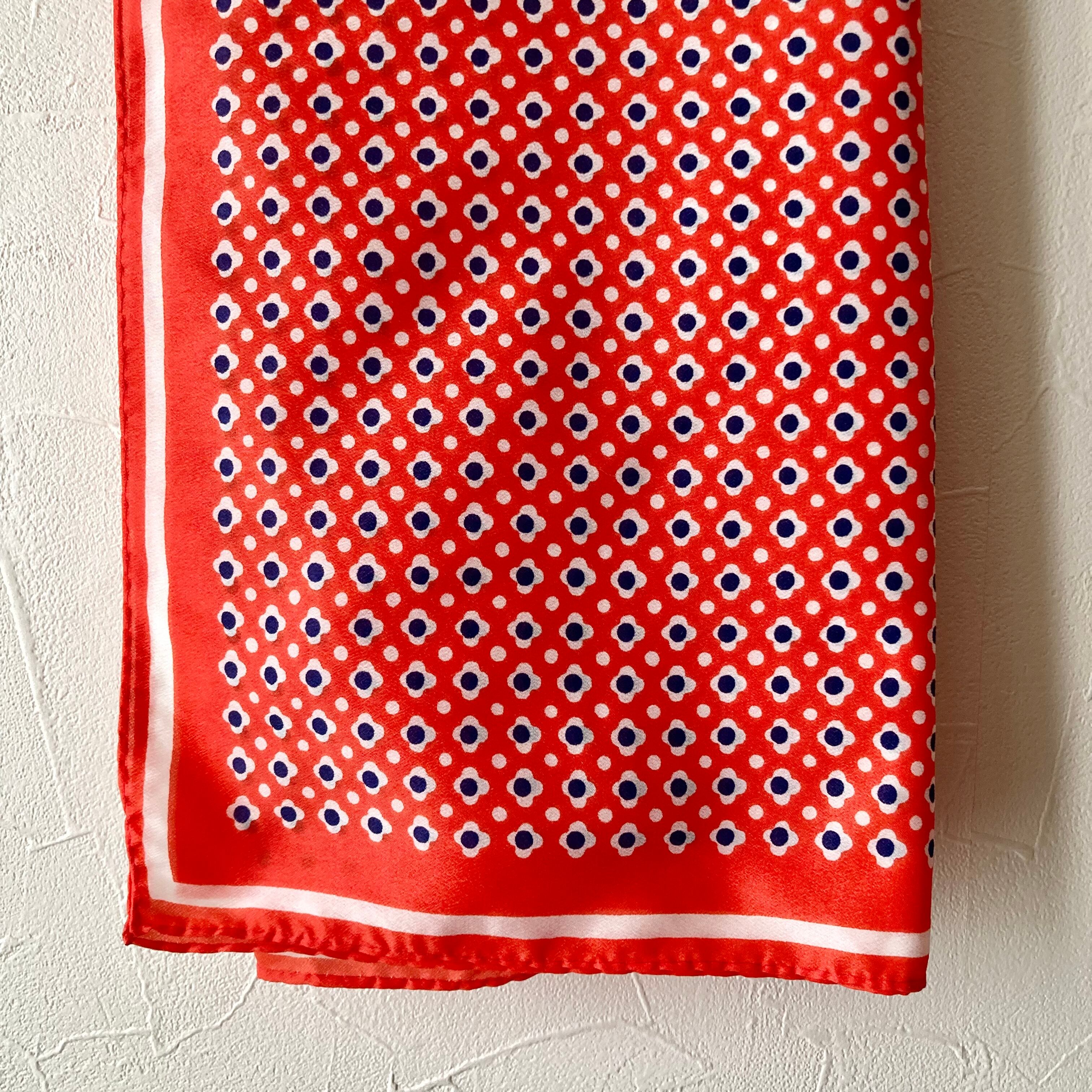 朱色にポップな白×ネイビーの小さなお花模様がレトロで可愛い大きめなスカーフです◯